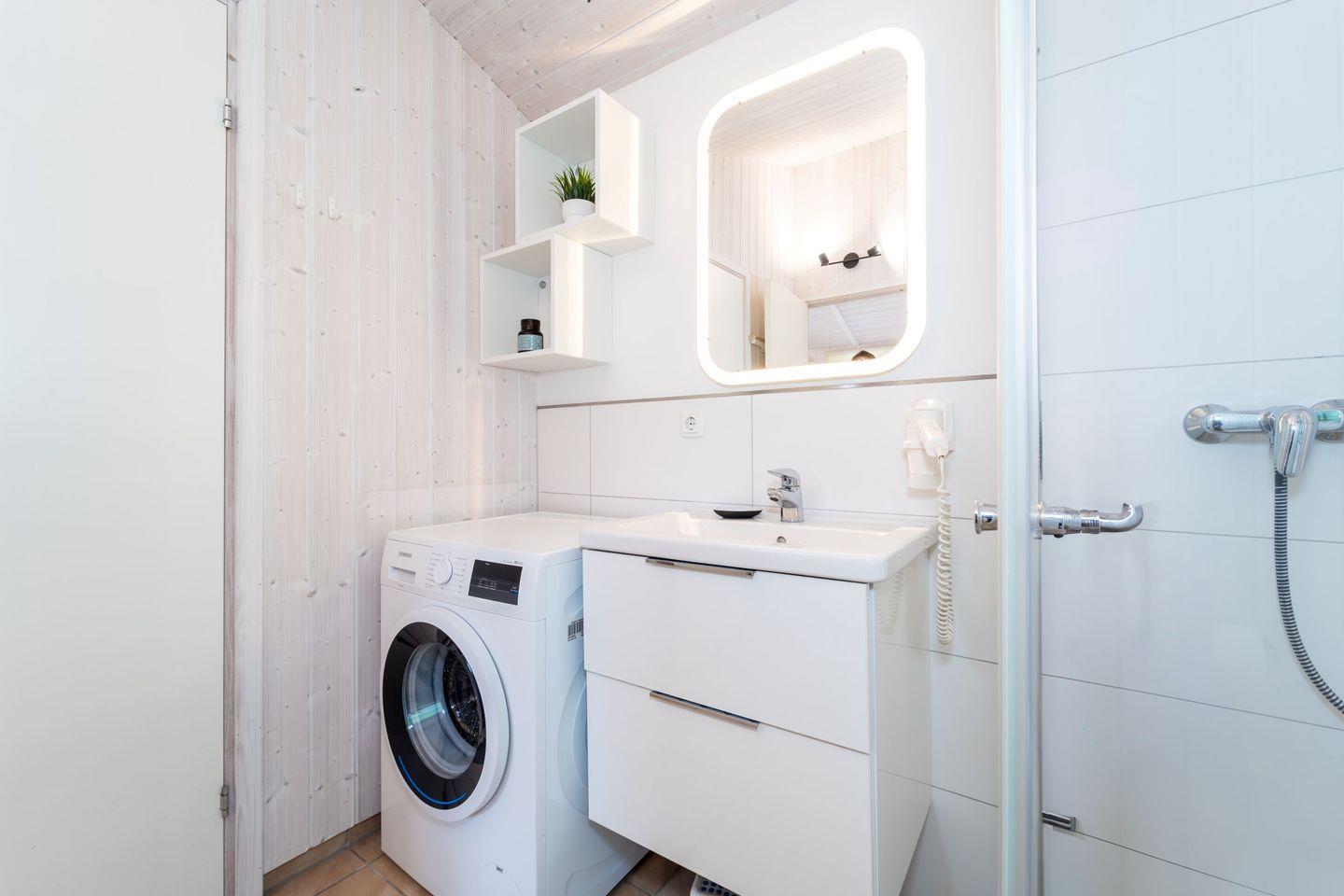 Im Badezimmer findest Du eine bodengleiche Dusche, WC, Waschbecken und einen Haartrockner. Auch die Waschmaschine ist hier untergebracht.