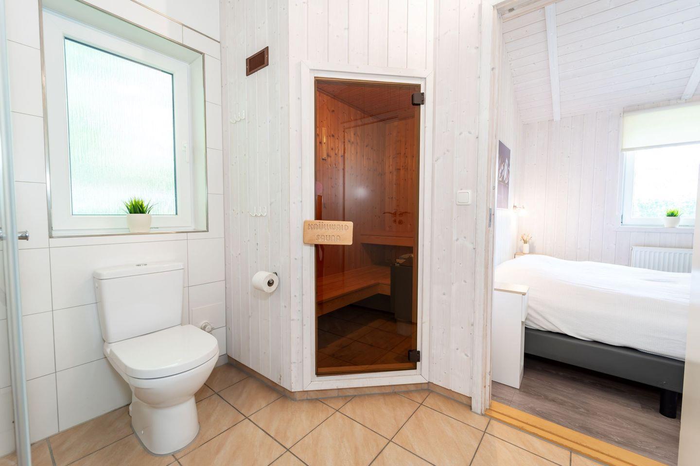 Nach einem Tag am Meer sorgt die eigene Sauna für wohltuende Entspannung. Auf der möblierten Terrasse genießt Du den Blick ins Grüne, während Sonnenliegen, Sonnenschirm und ein Holzkohlegrill zu gemütlichen Stunden im Freien einladen.