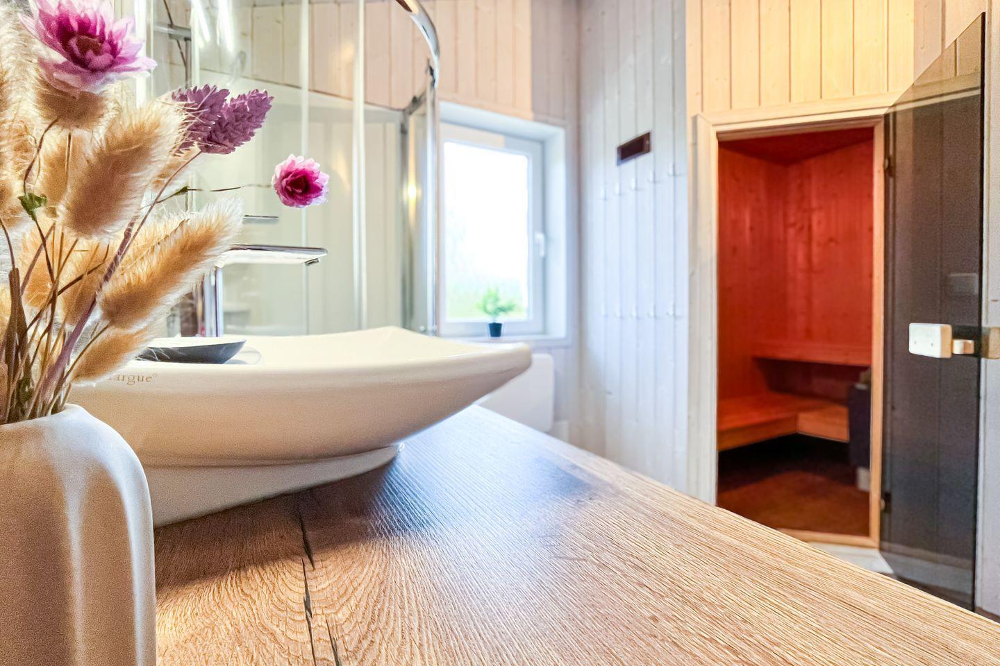 Das Badezimmer ist modern und verfügt über eine bodengleiche Dusche, ein Waschbecken und ein WC. Die Waschmaschine steht Dir zur Eigennutzung zur Verfügung. Ein Haartrockner ist ebenfalls vorhanden. Zudem lädt die hauseigene Sauna zum Entspannen nach einem erholsamen Urlaubstag ein.
