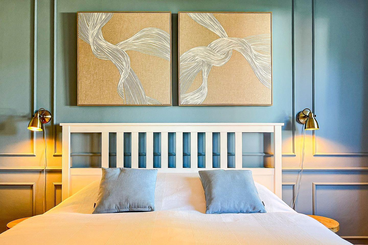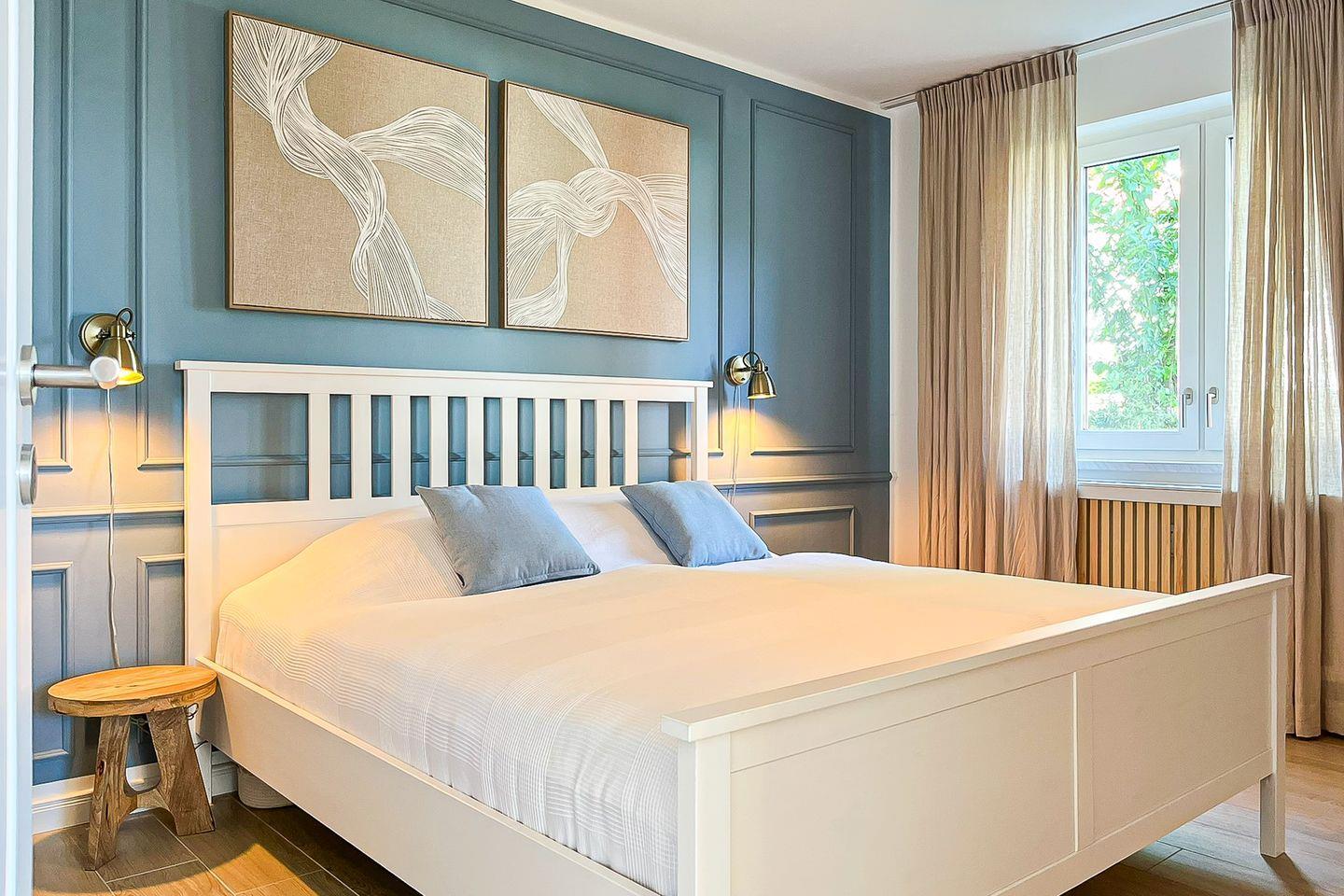 Das Schlafzimmer bietet ein komfortables Doppelbett (2 x 90 x 200 cm) und stilvolles Interieur. Ein geräumiger Kleiderschrank sorgt für genügend Stauraum für Ihre Urlaubsgarderobe.