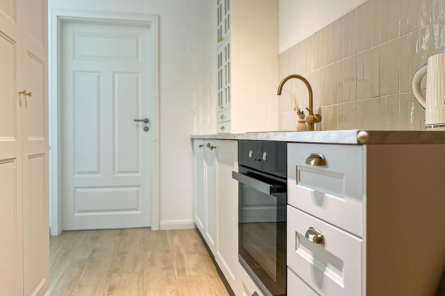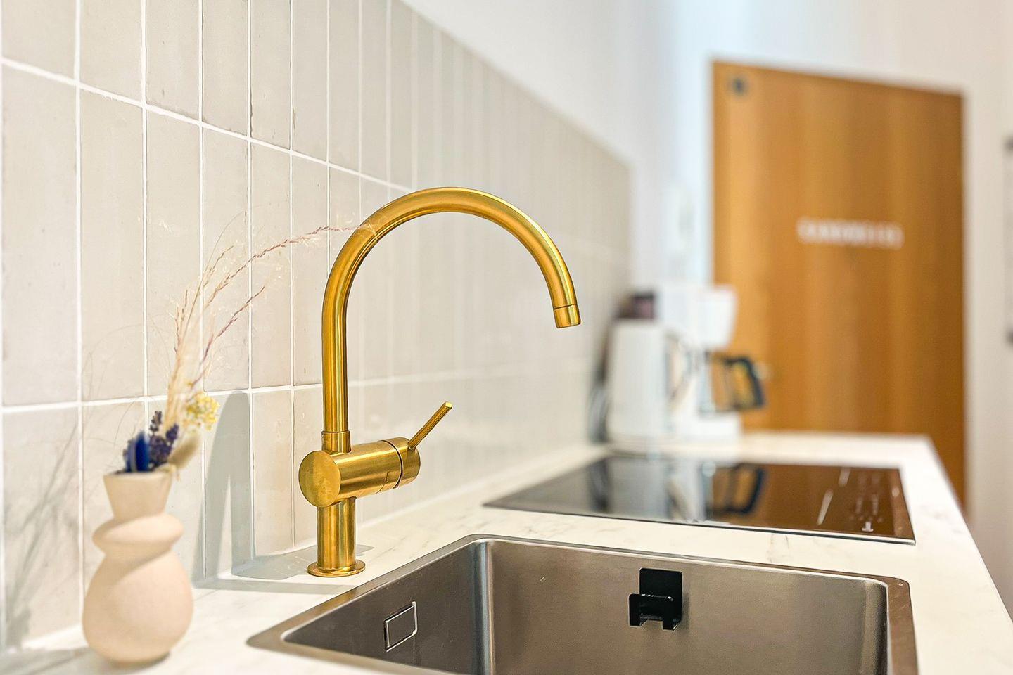 Der Wohn- und Schlafbereich sowie die Küche sind modern in Holzoptik gefliest.
