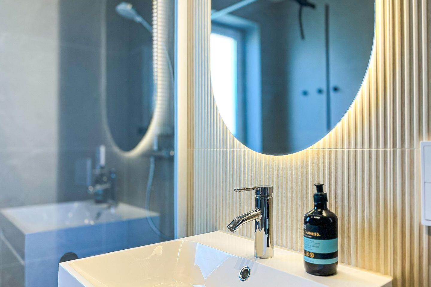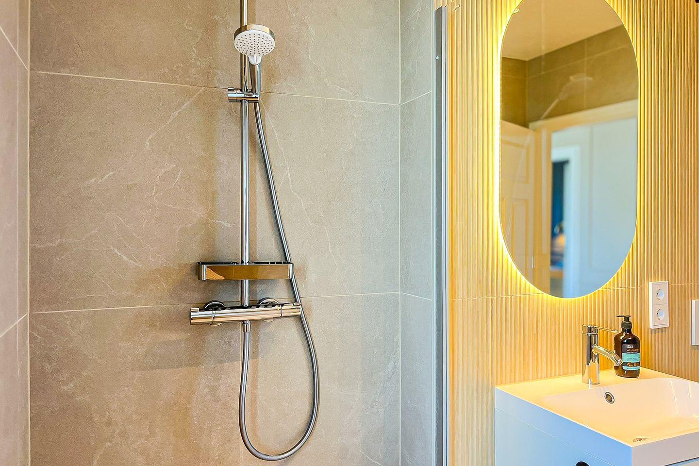 Das moderne Tageslichtbad ist hell gefliest und verfügt über eine bodengleiche Dusche, ein WC, einen Handtuchheizkörper sowie einen Haartrockner.