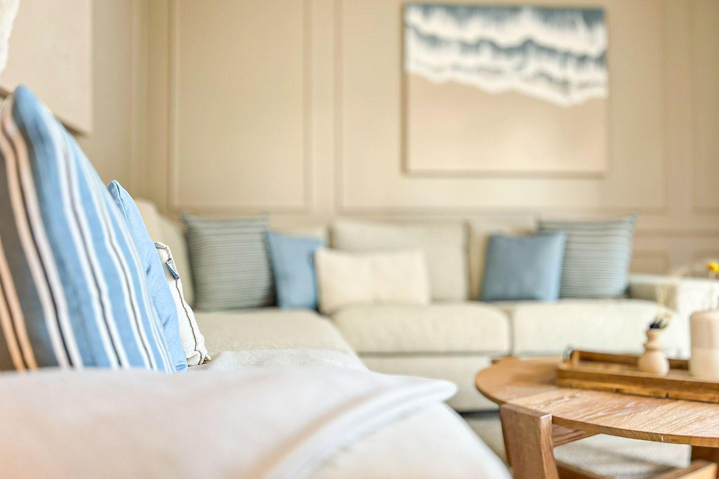 Das helle Wohnzimmer lädt mit seiner gemütlichen Sitzecke und einem hochwertigen Flachbild-TV zu entspannten Abenden ein. Ein bequemes Schlafsofa (ca. 140 x 200 cm) bietet zwei zusätzliche Schlafmöglichkeiten.