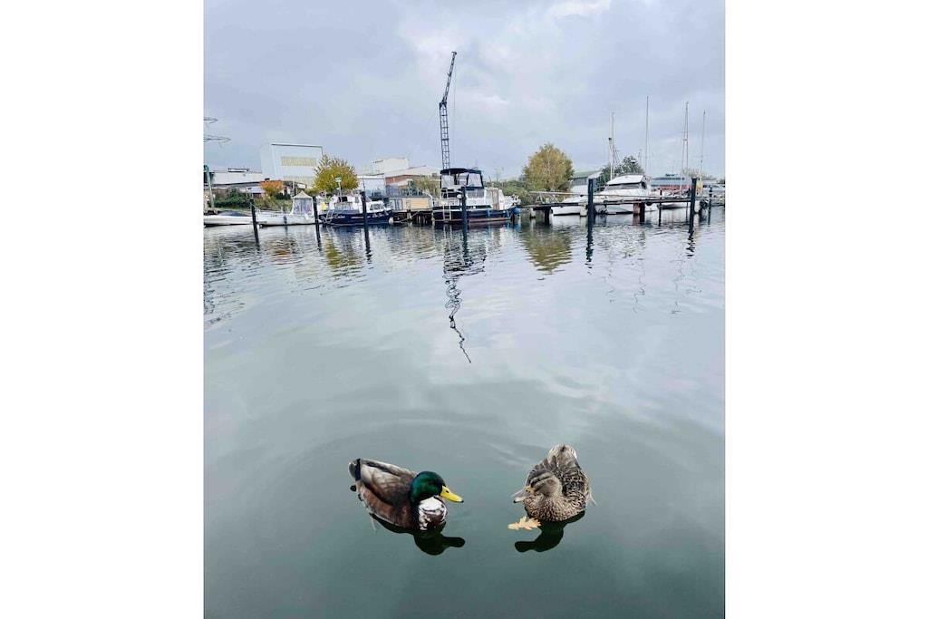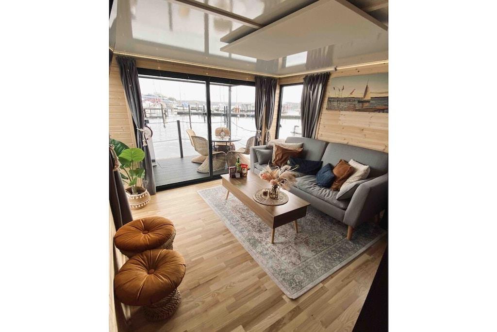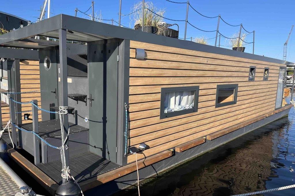 Komfortables Hausboot in Lübeck mit moderner Ausstattung, Terrasse und beheizten Zimmern für entspannte Ferien am Wasser.