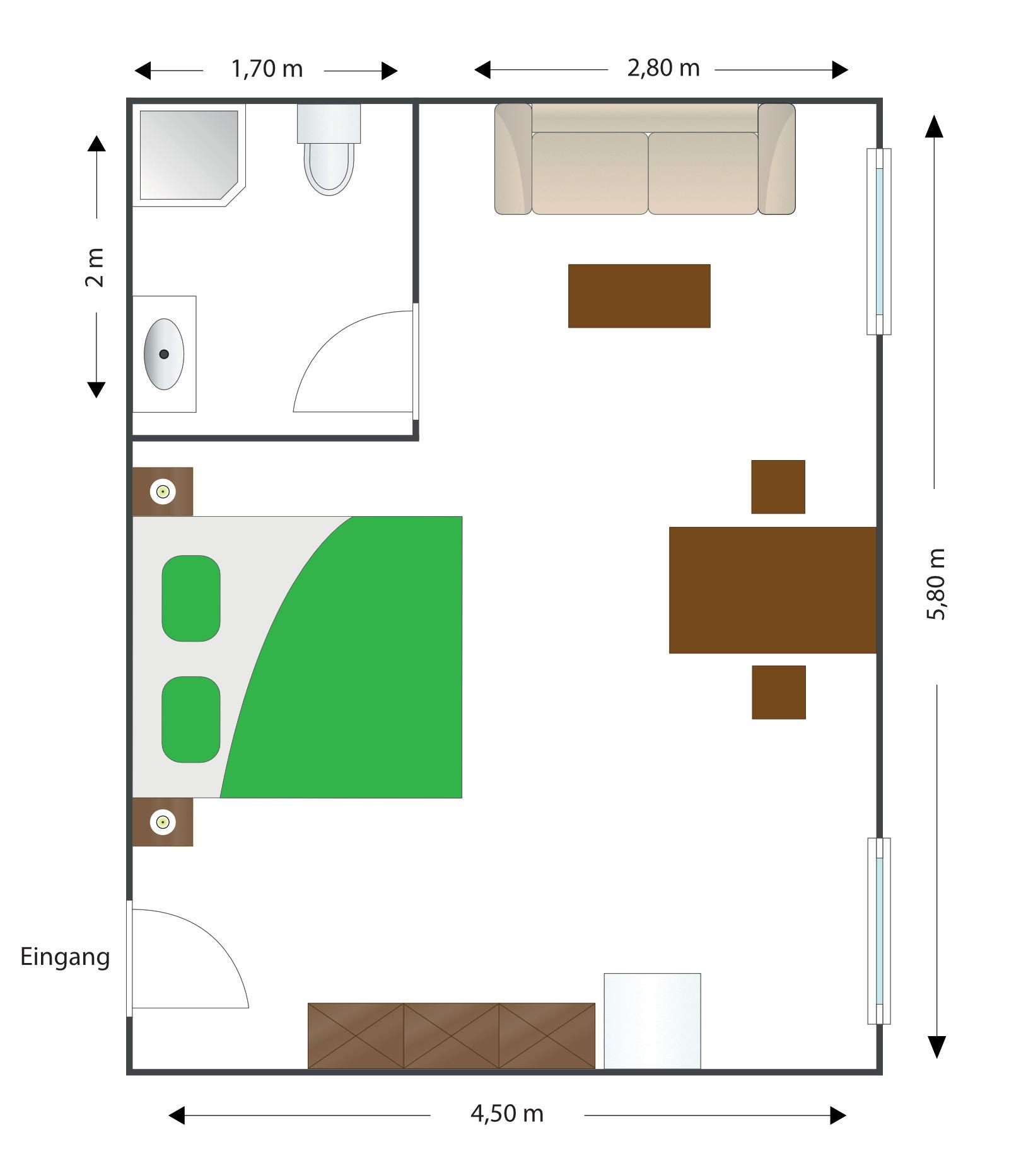- Wohn-/Schlafzimmer, 22 m², 2 Personen