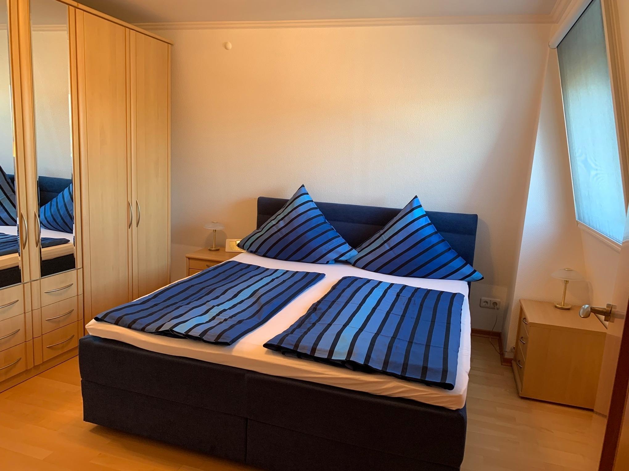 Die Ferienwohnung besteht aus einem gemütlichen, offenen Wohnzimmer (ohne Tür zum Flur) mit einer ausziehbaren Schlafcouch (Liegefläche 1,60m) und einem Schlafzimmer mit einem Boxspring-Doppelbett und einem großen Kleiderschrank, ein Badezimmer mit großer Dusche sowie einer voll ausgestatteten Küche und einem separaten Essbereich.