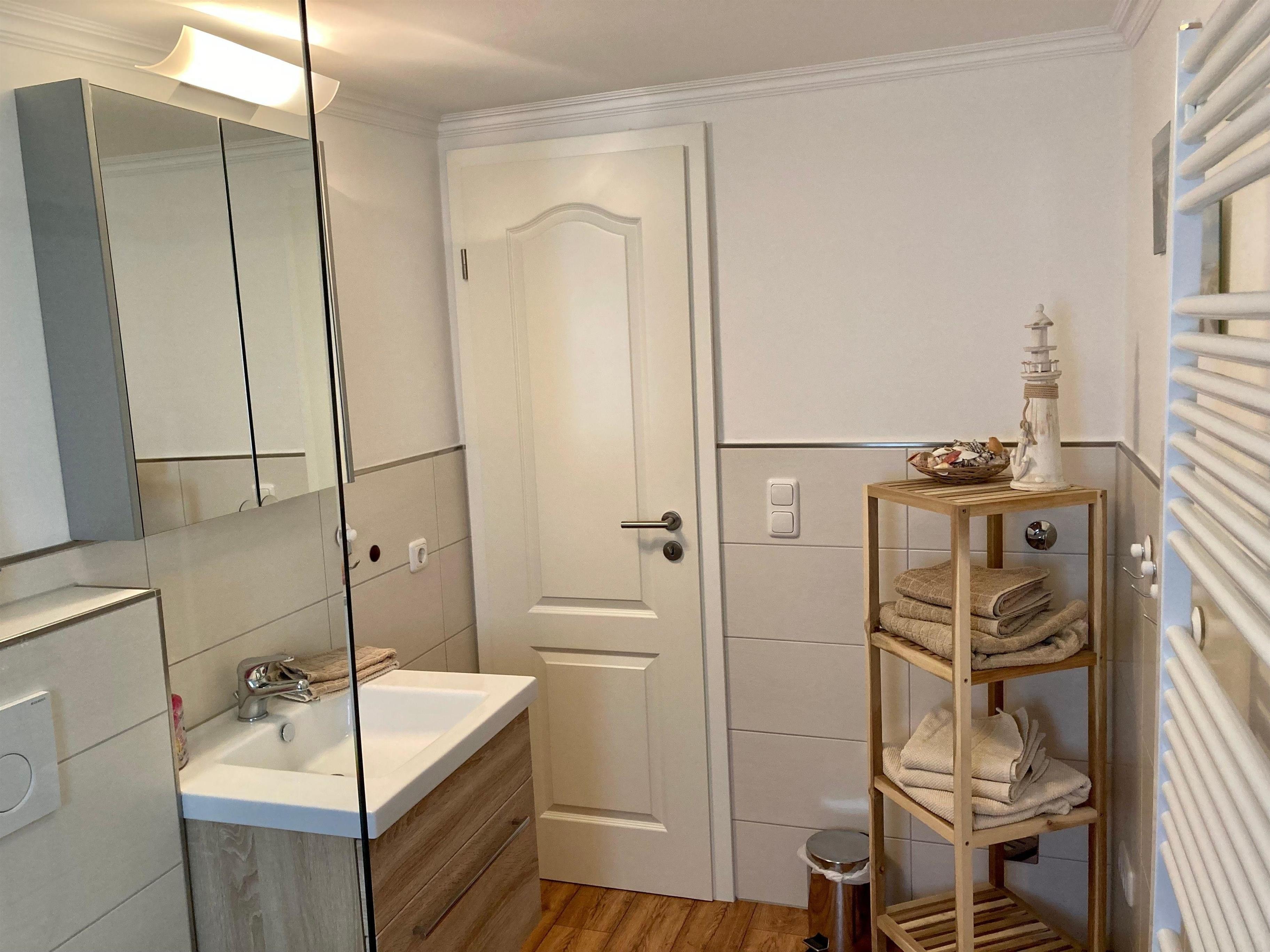 Ein Hochstuhl ist vorhanden. Ein Tageslichtbad mit großzügiger moderne bodengleiche Dusche;