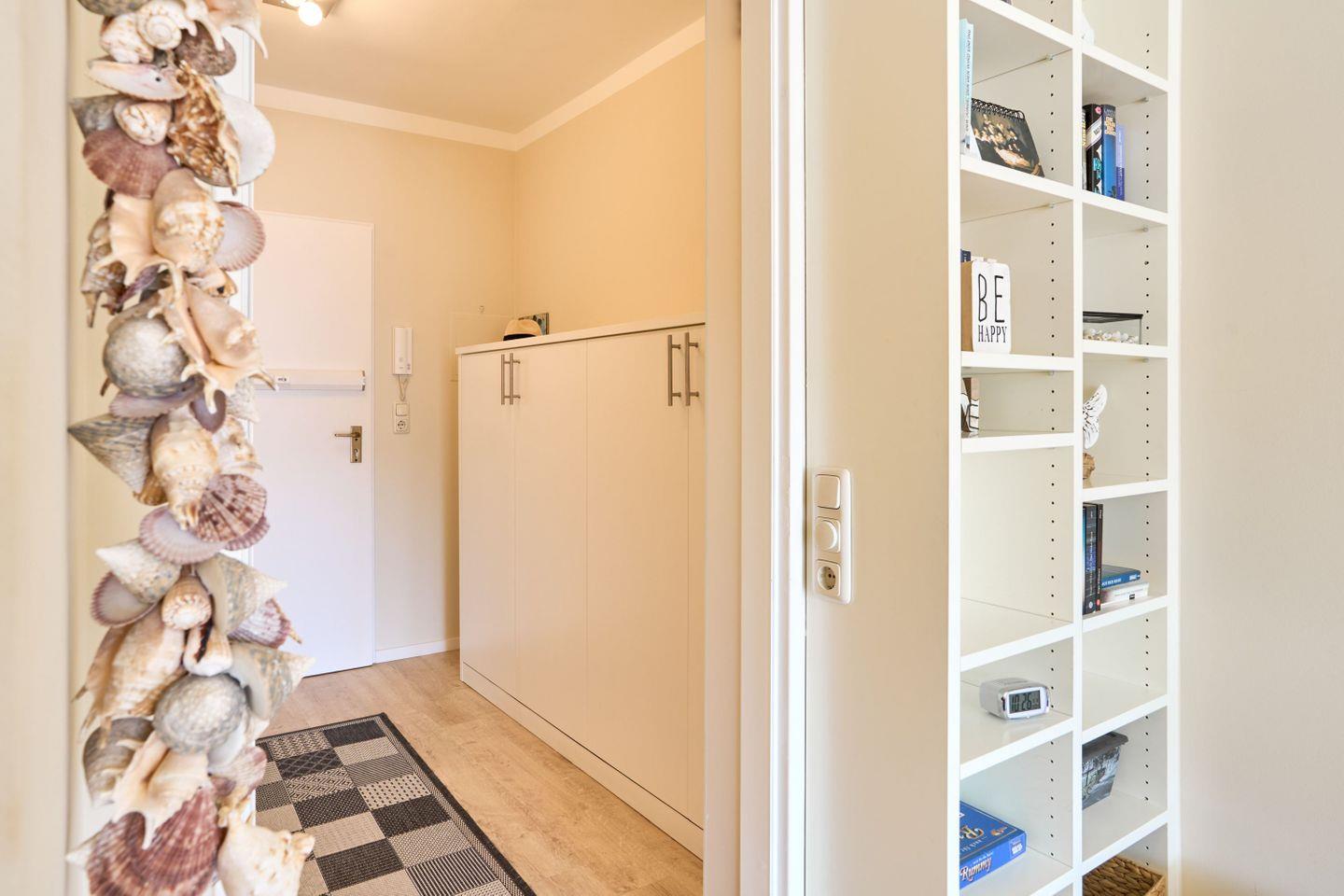 Das geräumige Badezimmer ist mit einer fast ebenerdigen Wellnessdusche für entspanntes Relaxen nach einem sonnigen Urlaubstag an der Ostsee genau das Richtige. Dort befindet sich auch ein zusätzlicher Einbauschrank mit viel Stauraum, so dass alle mitgebrachten Dinge ihren Platz finden.