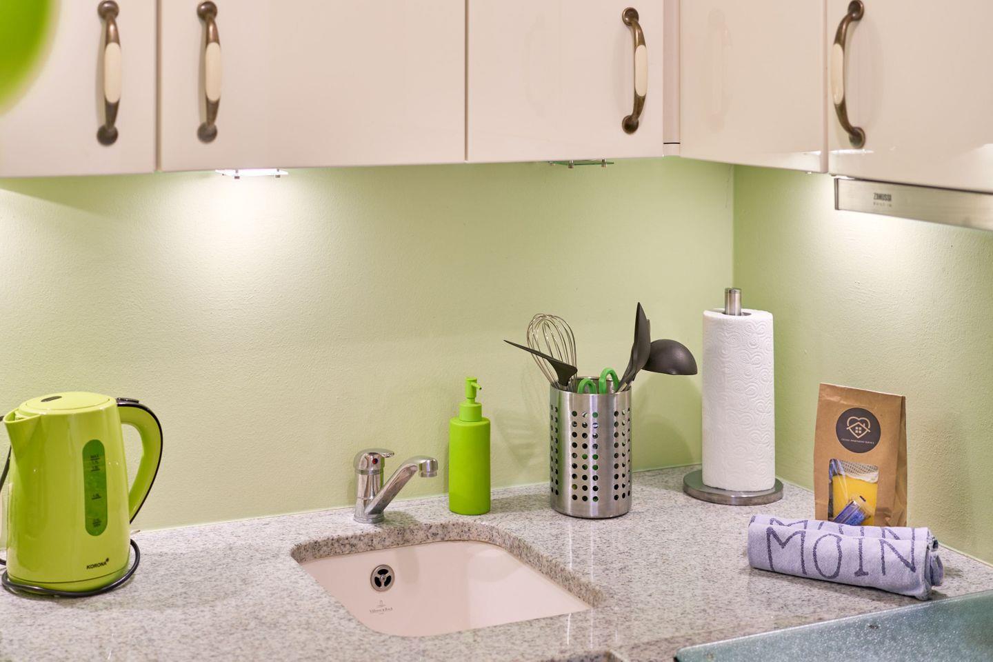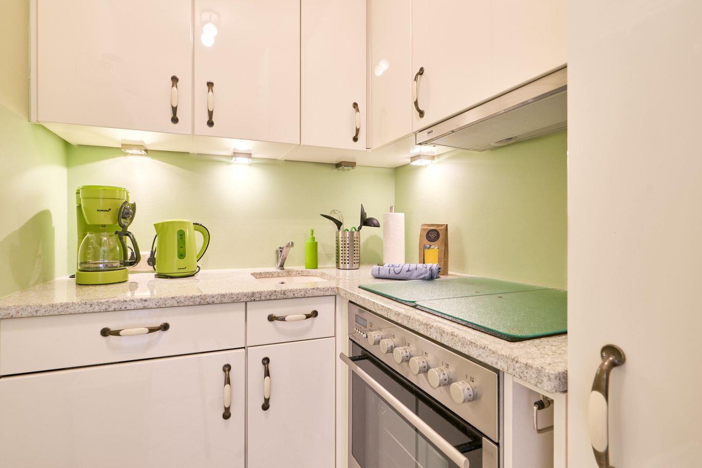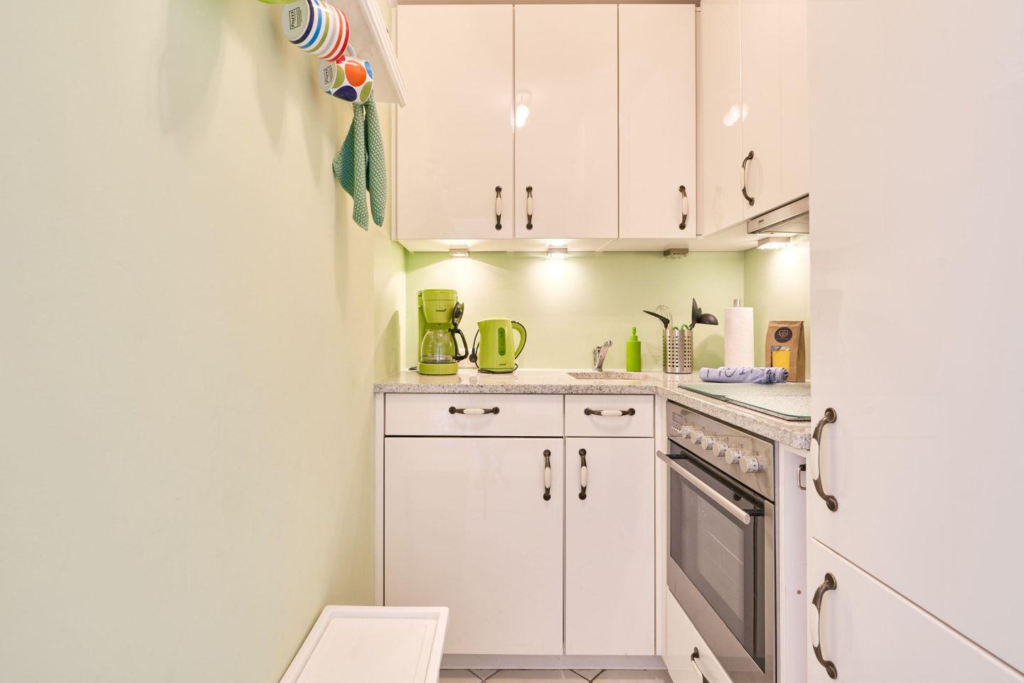 Die kleine Küche ist räumlich vom Wohn-Schlafbereich abgetrennt und verfügt über einen Geschirrspüler, Herd mit Ceranfeld, Backofen, Kühlschrank, Kaffeemaschine, Wasserkocher und Toaster. In den Küchenschränken finden Sie alles, was Sie zur Zubereitung einer leckeren Mahlzeit benötigen.