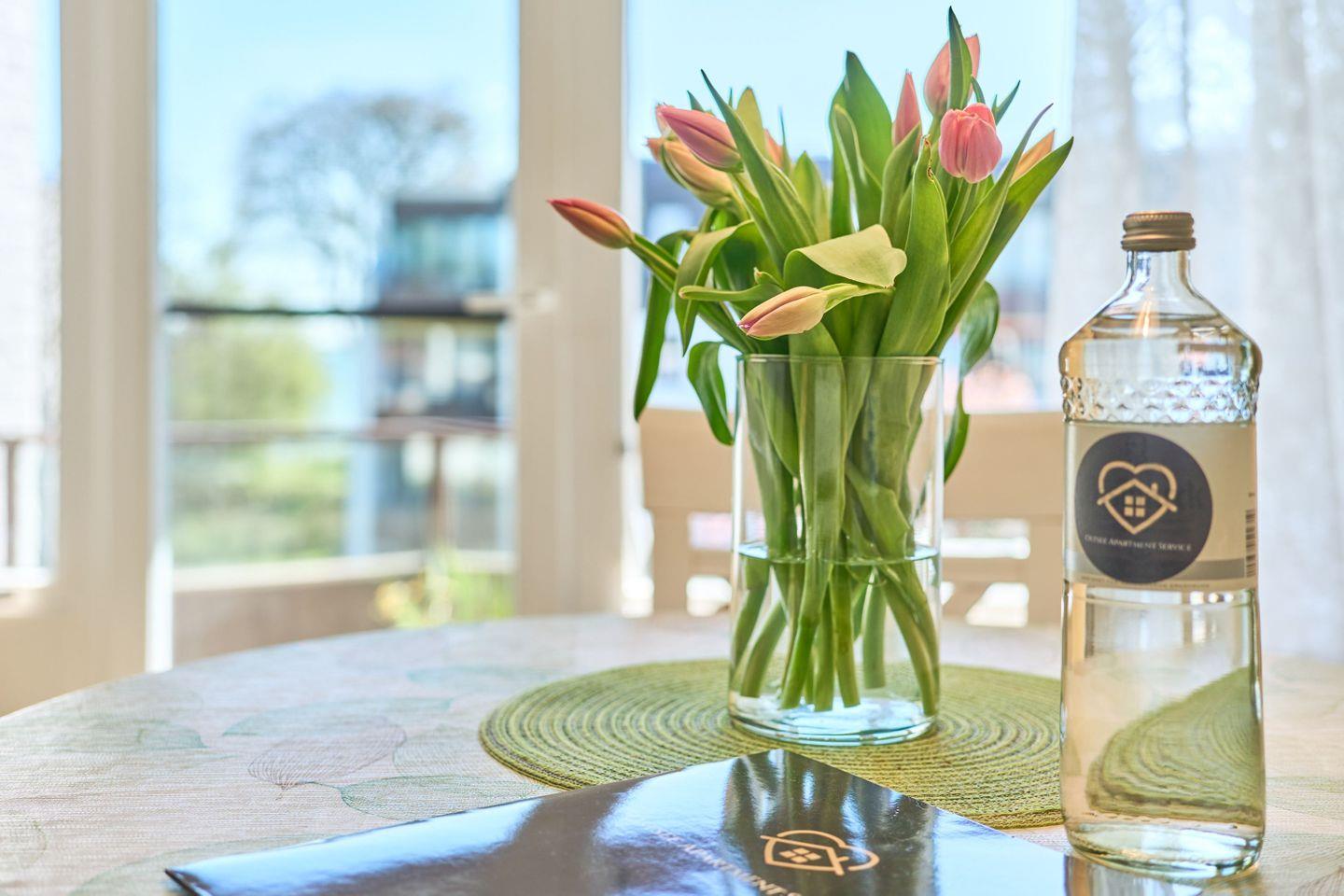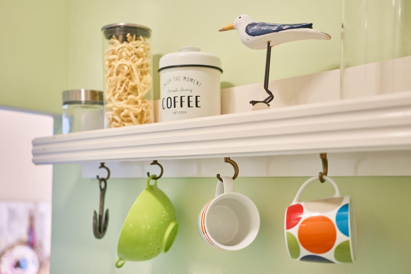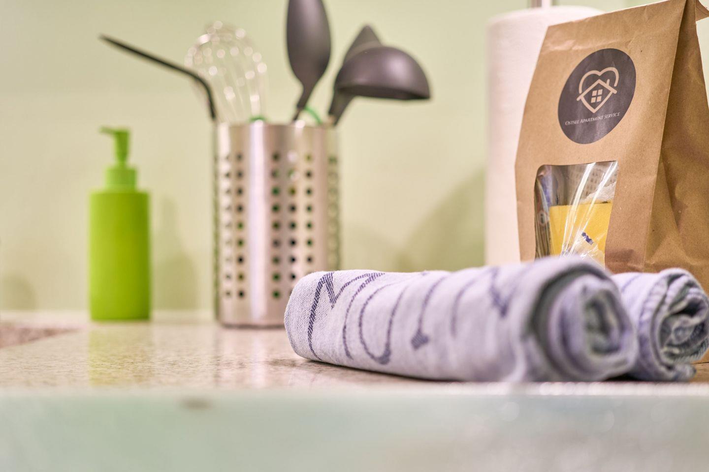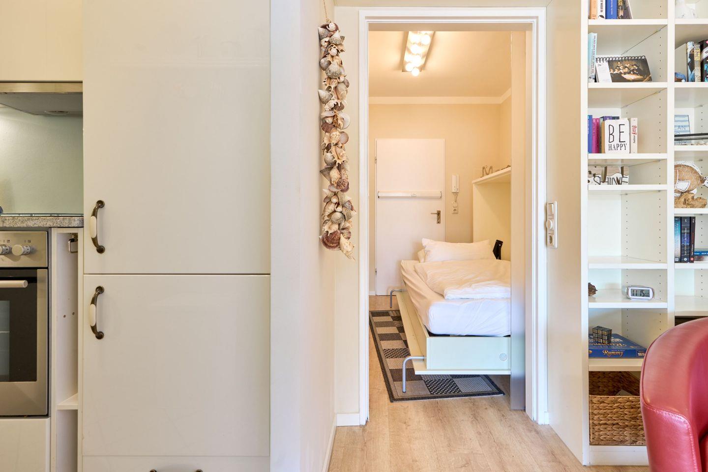 Die kleine Küche ist räumlich vom Wohn-Schlafbereich abgetrennt und verfügt über einen Geschirrspüler, Herd mit Ceranfeld, Backofen, Kühlschrank, Kaffeemaschine, Wasserkocher und Toaster. In den Küchenschränken finden Sie alles, was Sie zur Zubereitung einer leckeren Mahlzeit benötigen.