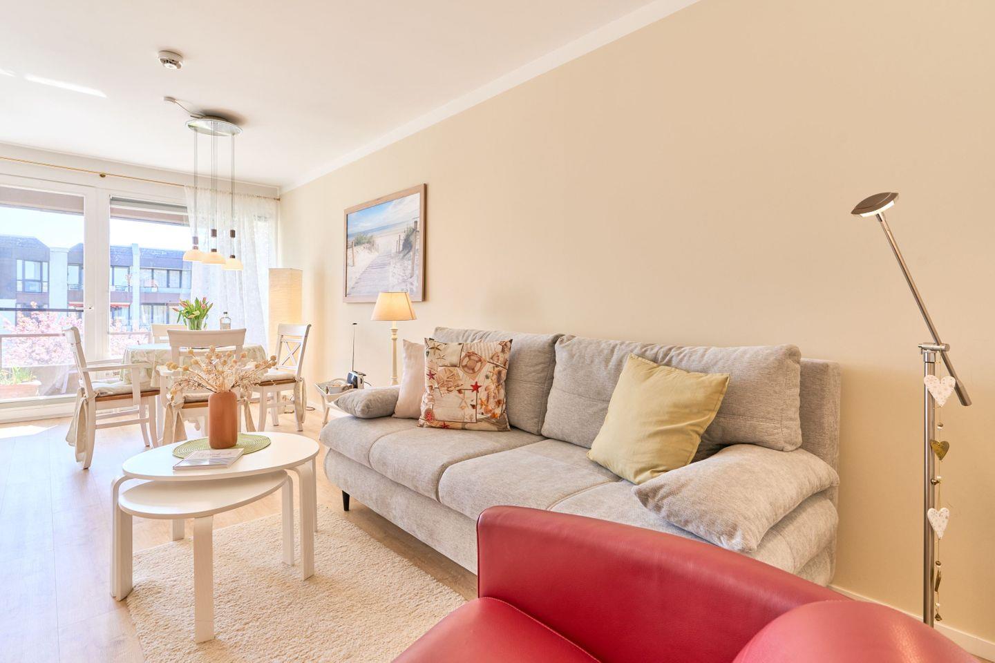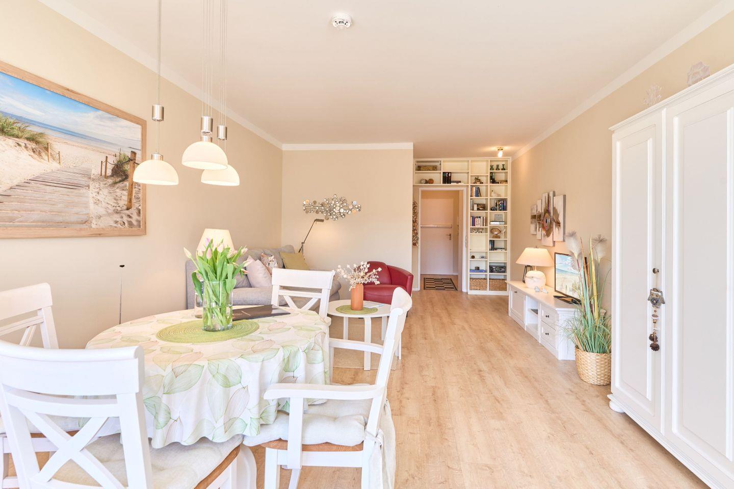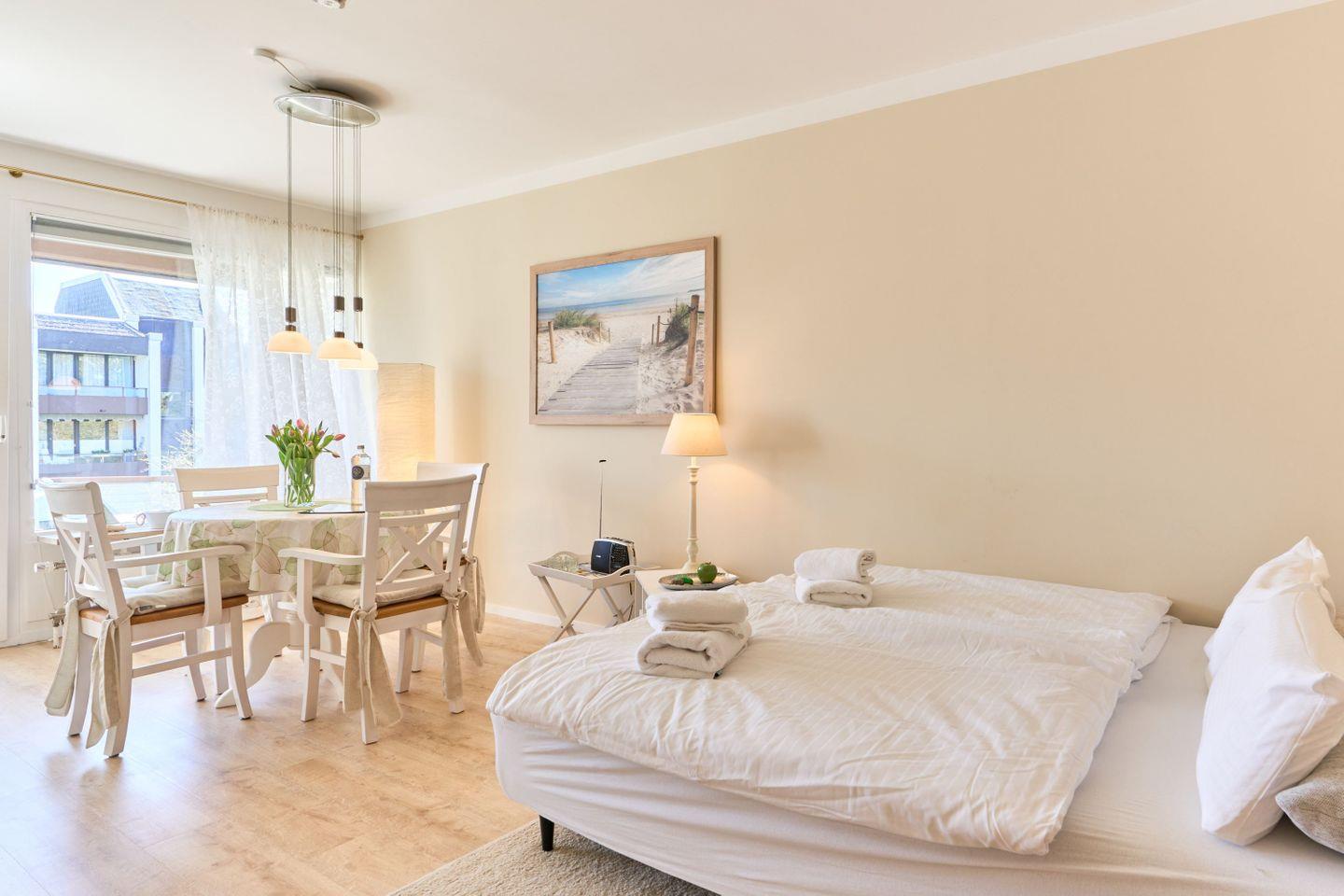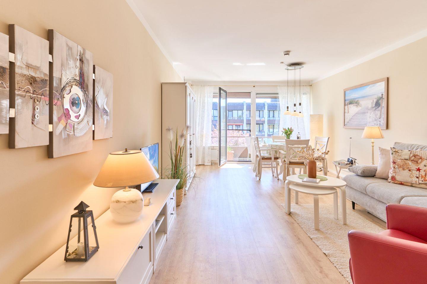 Das 46 qm große 1-Zimmer-Apartment „Sanibel“ liegt im 2.OG in einer gepflegten Wohnanlage und hat einen großen Wohn- und Schlafbereich eine vollständig eingerichtete Küche sowie ein großzügiges Wellness-Bad.