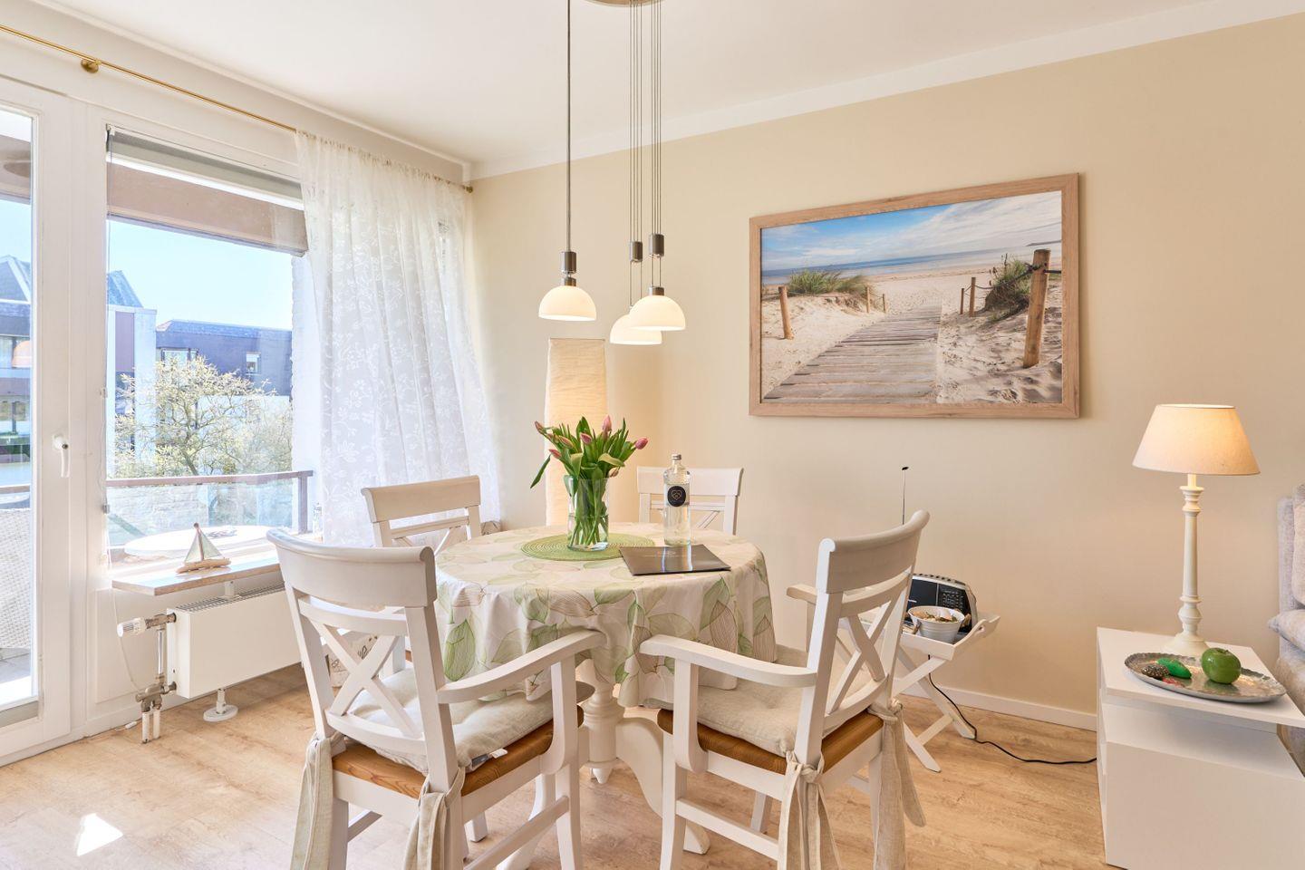 Das 46 qm große 1-Zimmer-Apartment „Sanibel“ liegt im 2.OG in einer gepflegten Wohnanlage und hat einen großen Wohn- und Schlafbereich, eine kleine, aber vollständig eingerichtete Küche sowie ein großzügiges Wellness-Bad. Der vormittags sonnige Balkon mit seitlichem Blick zur Ostsee sowie eine weitere 25qm große Dachterrasse, die bis in die Abendstunden in der Sonne liegt, ergänzen diese wunderschöne Ferienwohnung. Ein Tiefgaragenstellplatz steht Ihnen kostenlos zur Verfügung, so dass Sie auch in der Hochsaison jederzeit einen sicheren Parkplatz finden. Mitgebrachte Fahrräder können direkt im Garten der Anlage abgestellt und angeschlossen werden. Die Wohnanlage verfügt über keinen Aufzug.