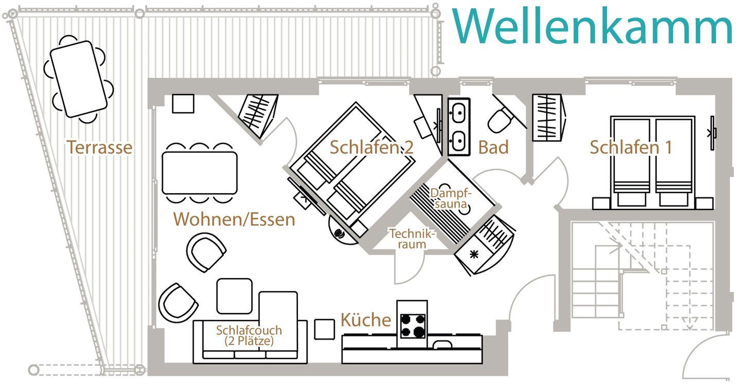 Moderne Ferienwohnung "Wellenkamm" auf dem Priwall mit Wellnessdusche und Strandnähe für Familien und Gruppen.