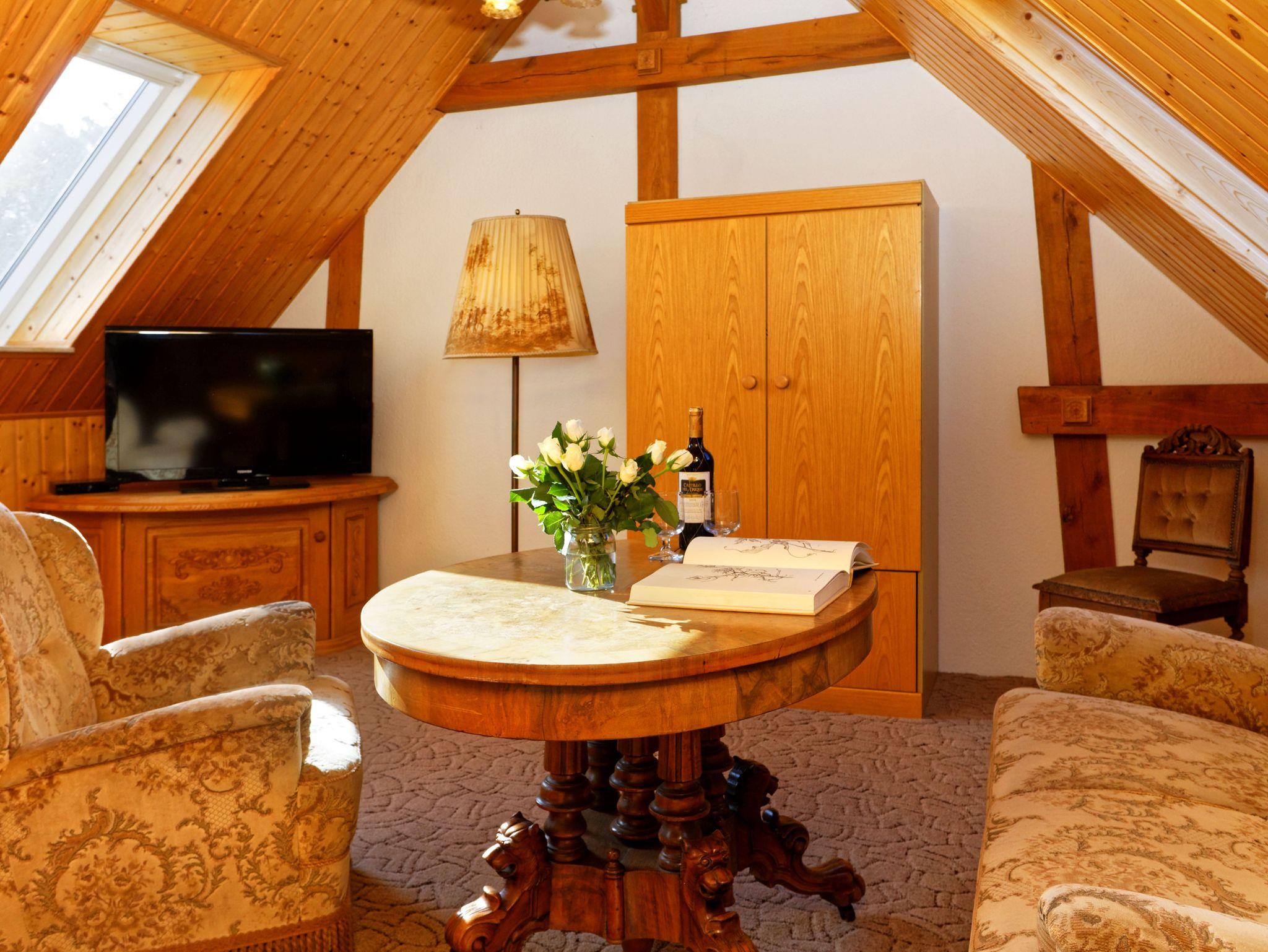 Das gemütliche Ferienhaus befindet sich direkt auf dem Grundstück des Wald- und Jagdgut und ist ca. 65 m² groß. Im unteren Bereich befinden sich die vollausgestattete Küche mit Sitzecke, Backofen, Kühlschrank mit Gefriermöglichkeit, Wasserkocher, Kaffeemaschine und Toaster. Das geräumige Badezimmer ist mit einer großen Dusche und WC ausgestattet. Über eine Treppe gelangen Sie in das gemütliche Wohnzimmer mit einer Couch, einem Einzelbett und einem großen Flachbildfernseher. Direkt vom Wohnzimmer aus gelangen Sie in das große Schlafzimmer mit Doppelbett, Kleiderschrank und einer Kommode.
