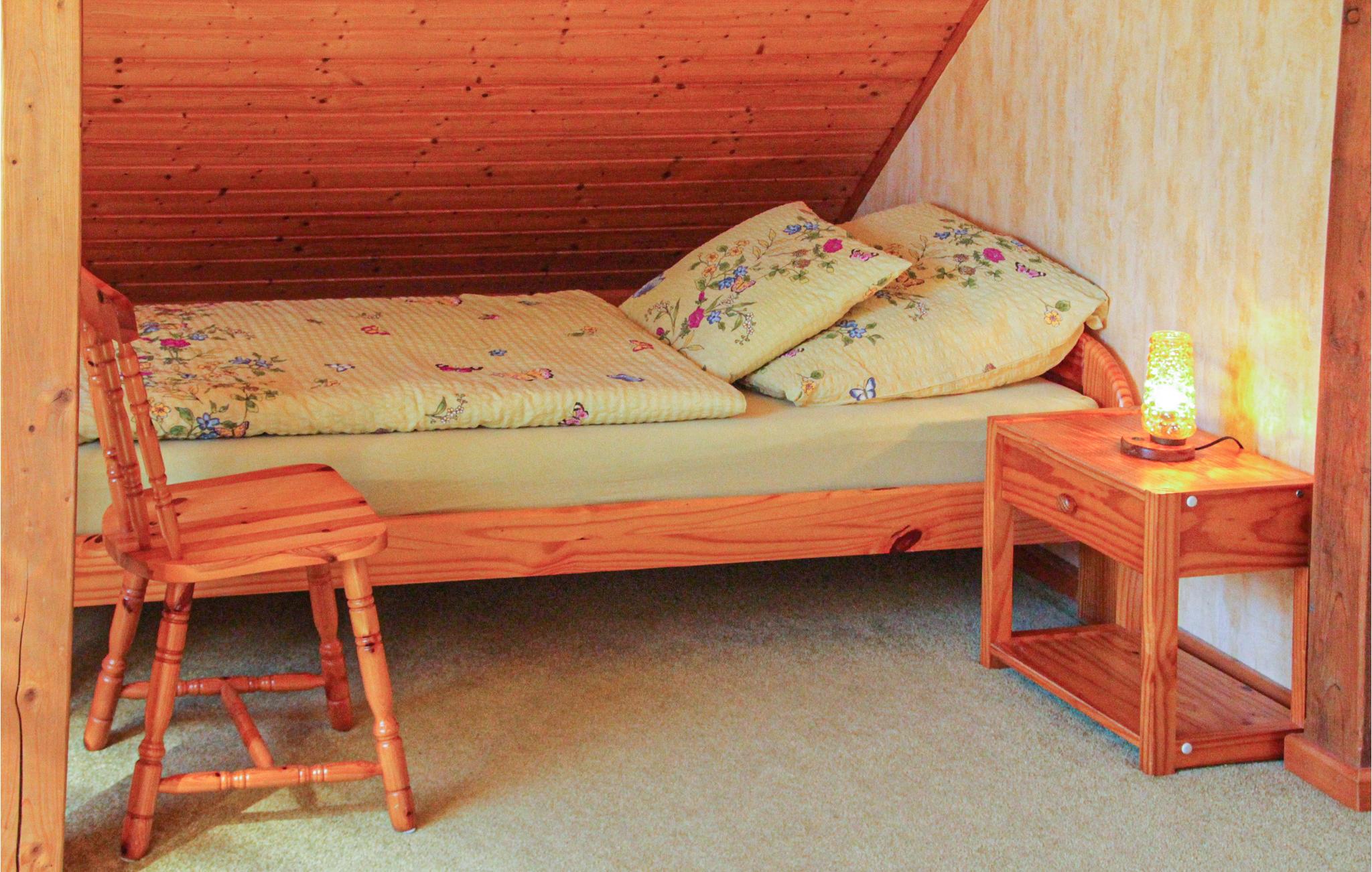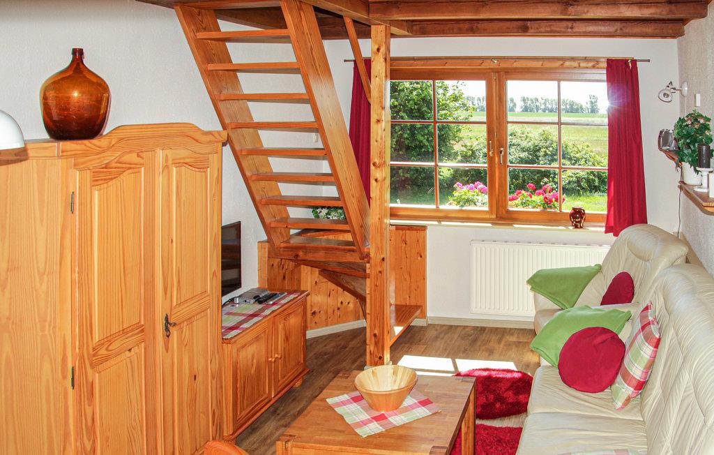 Die Zimmer der Ferienwohnung erstrecken sich über das Erdgeschoß und die erste Etage. Vom Wohnzimmer führt eine offene Treppe ins Schlafzimmer. Auf den Sitzmöglichkeiten rund ums Haus können Sie bei schönem Wetter die Sonne und die Idylle der Umgebung genießen. Bei entsprechender Witterung besteht die Möglichkeit, den Tag am Lagerfeuer ausklingen zu lassen. Das Grundstück befindet sich in Alleinlage mit Blick zum Wasser.