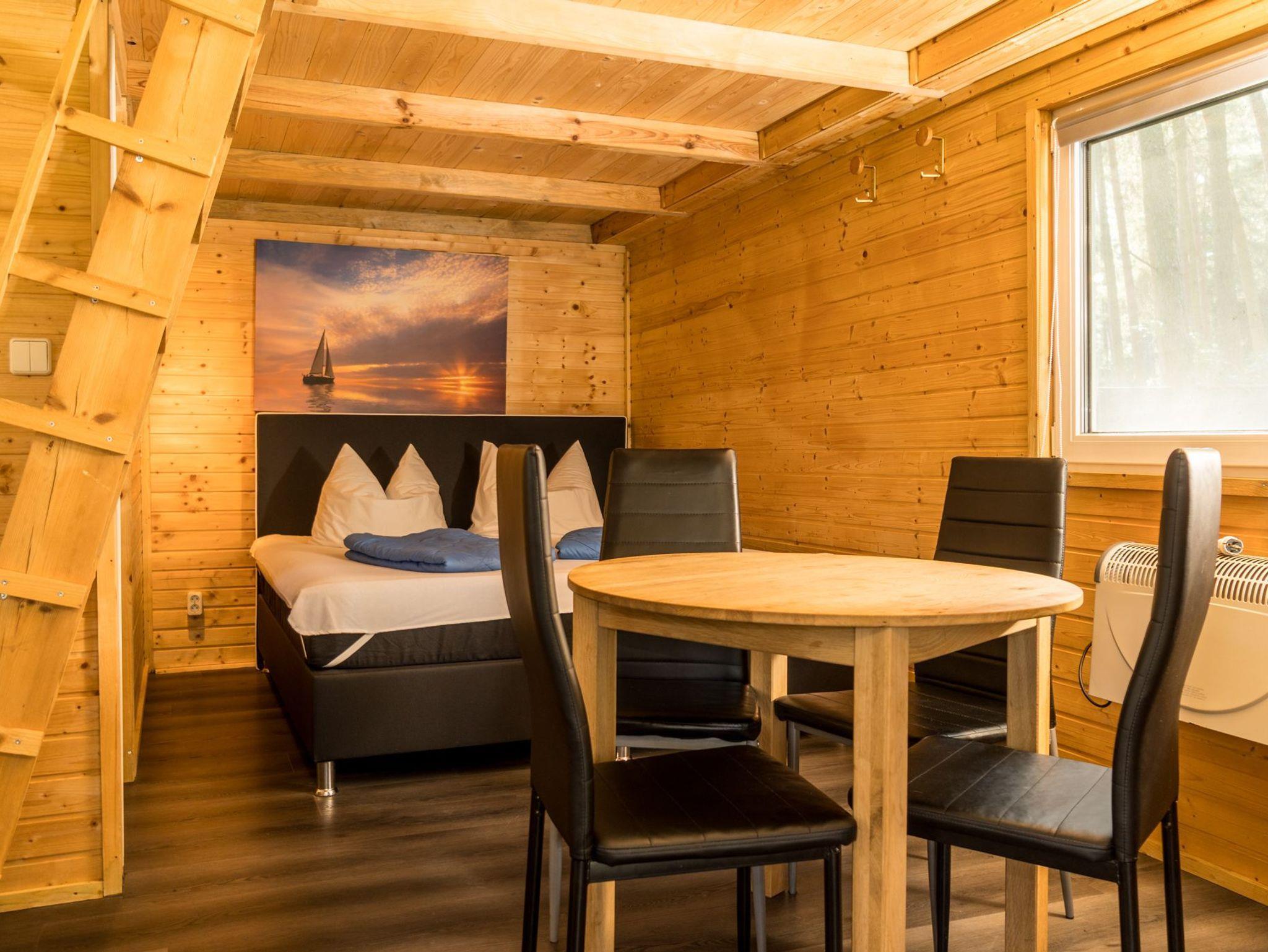 Der Bungalow verfügt über zwei Etagen. Die obere Etage ist ein Schlafboden mit dicker Matrazen (160x200cm) für zwei Personen und über eine Leiter zu erreichen. Die untere Etage besteht aus einem großen Raum mit TV-Ecke, einer Flachstrecken für ihre Garderobe, einer Schlafnische mit Boxspring-Doppelbett (180x200cm) und der Küchenzeile. Separat befindet sich ein Bad mit Toilette und einer Dusche.