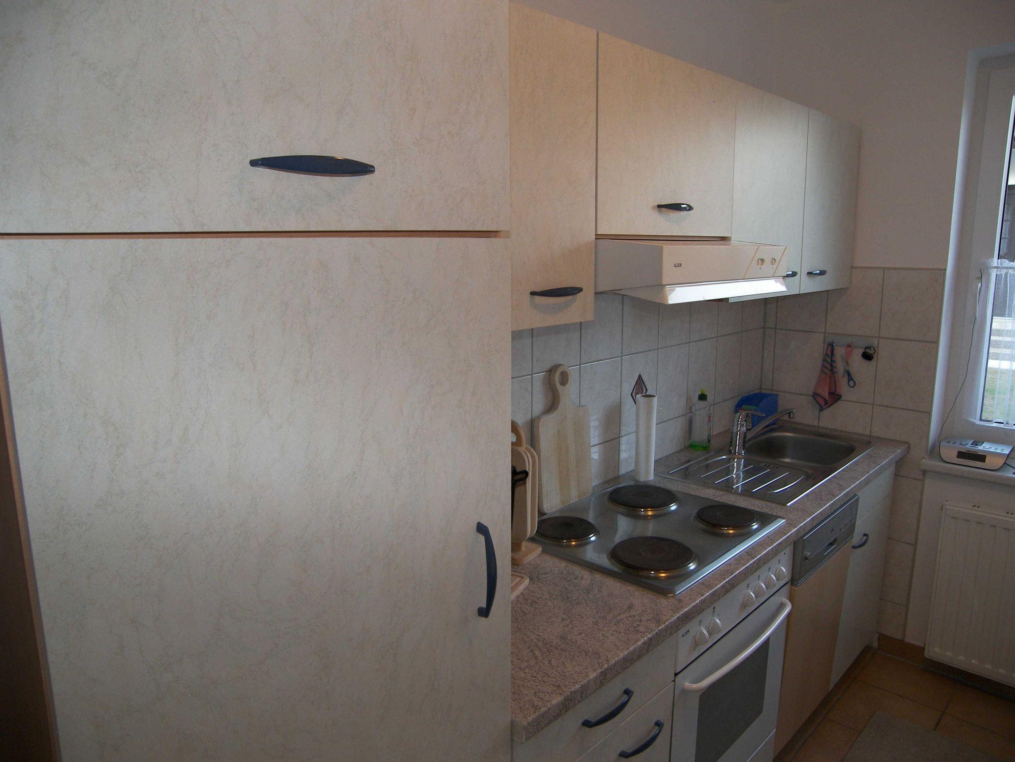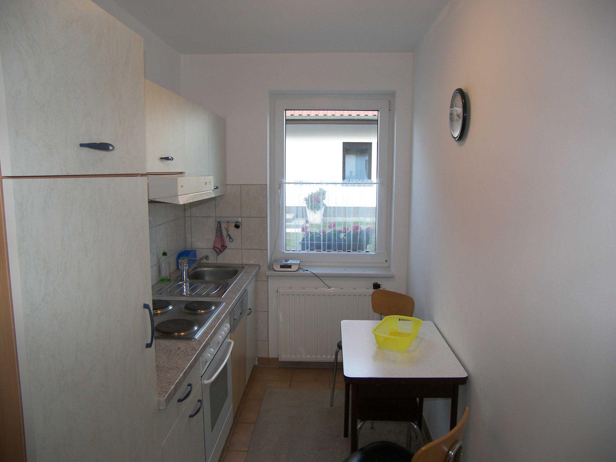 Die Wohnung verfügt über eine separate Küche mit 4 Platten-Herd mit Backofen, Wasserkocher, Toaster und Kaffeemaschine und einem kleinen Esstisch mit 2 Stühlen.