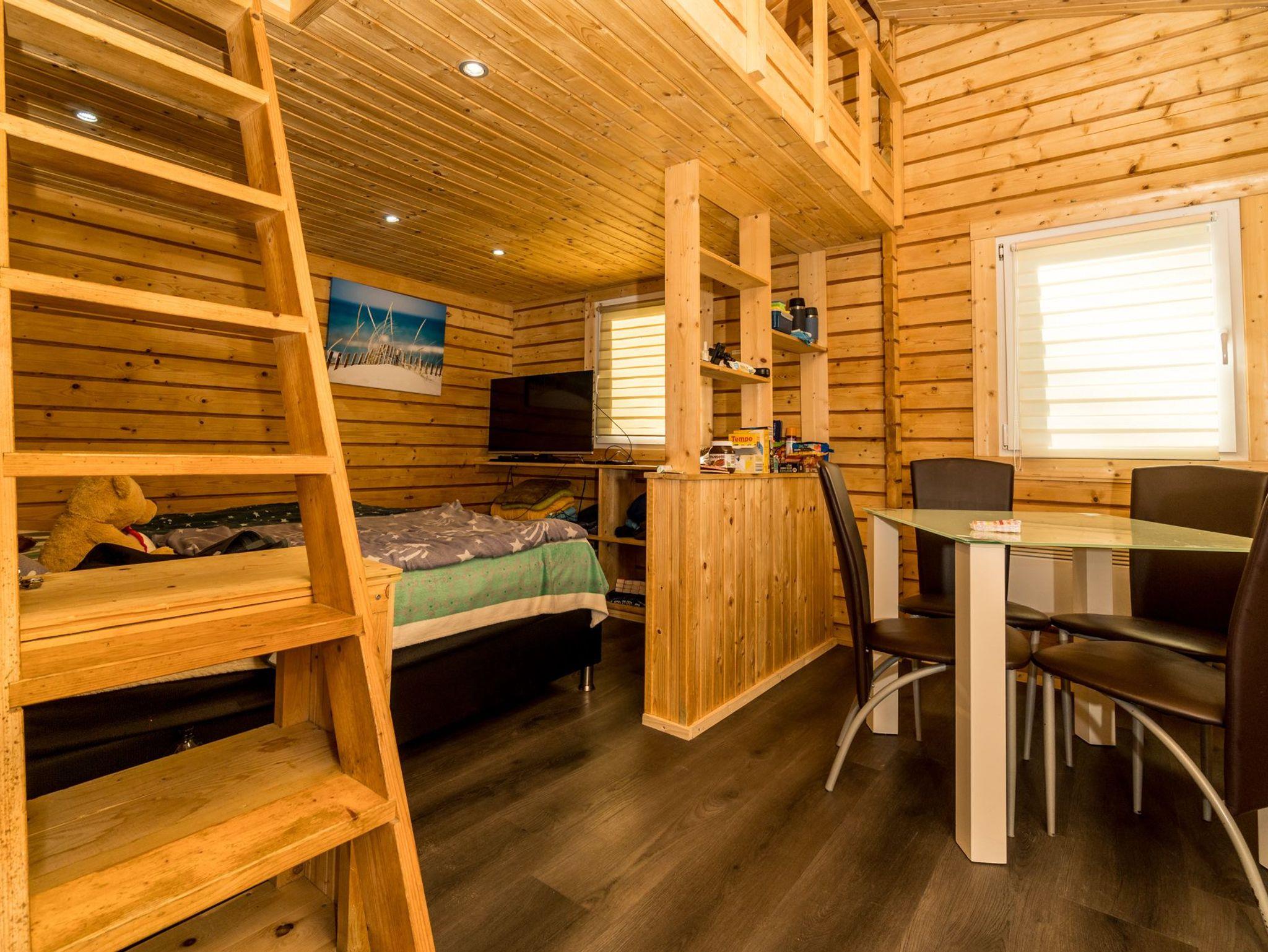 Der Bungalow verfügt über zwei Etagen. Die obere Etage ist ein Schlafboden für zwei Personen mit dicker Matraze (140x200cm) und über eine Leiter zu erreichen. Die untere Etage besteht aus einem großen Raum mit TV-Ecke, einer Flachstrecken für ihre Garderobe, einer Schlafnische mit Boxspring-Doppelbett (180x200cm) und der Küchenzeile. Separat befindet sich ein Bad mit Toilette und einer Dusche.