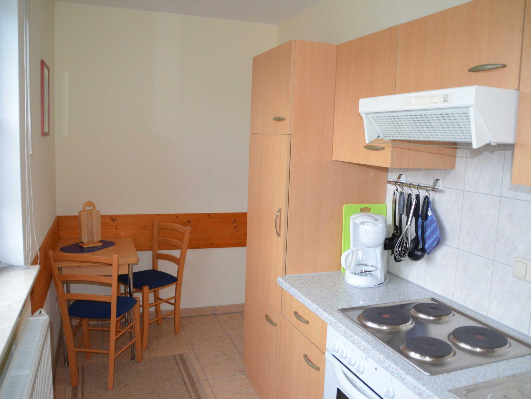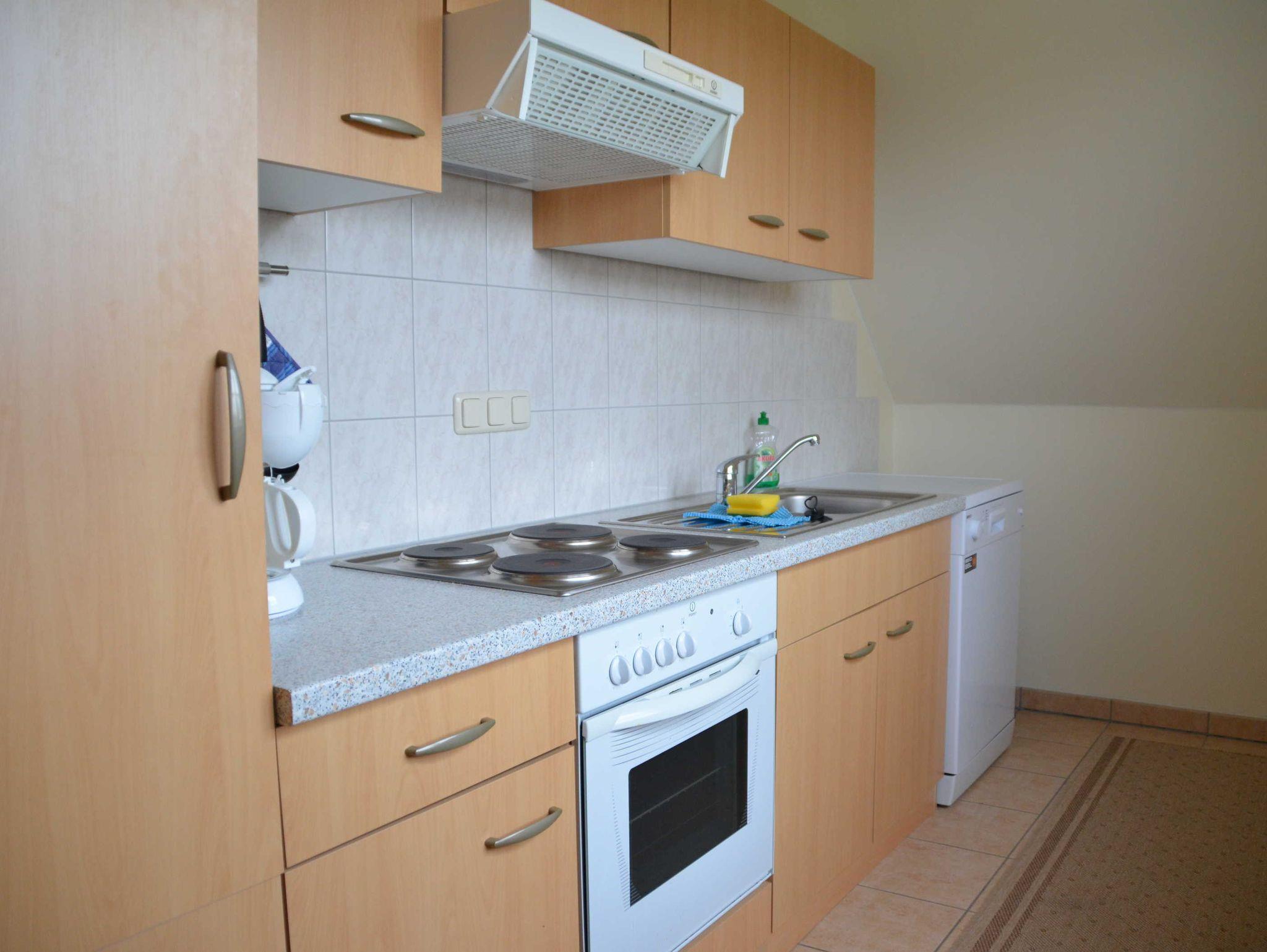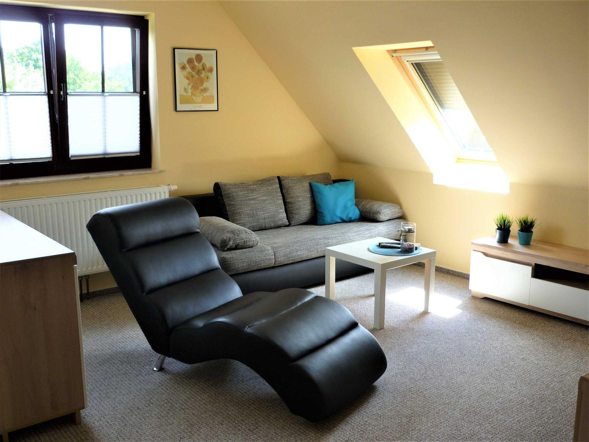 Die gemütliche 1-Raum-Ferienwohnung befindet sich im Dachgeschoss des Hauses. Sie verfügt über ein Doppelbett, einen Kleiderschrank, Couchsitzecke mit Flat-TV und Radio. Die separate Küche mit Cerankochfeld, Backofen, Kühlschrank mit Gefrierfach, Spülmaschine, Kaffeemaschine, Wasserkocher und Toaster ist gut ausgestattet. Vom Wohnschlafraum gelangen Sie auf den möblierten Balkon und genießen einen schönen Blick auf die umliegende Natur. Die Erstausstattung Bettwäsche, Parkplatz, Nebenkosten und Endreinigung sind im Preis enthalten. Handtücher müssen mitgebracht werden. WLAN ist vorhanden.