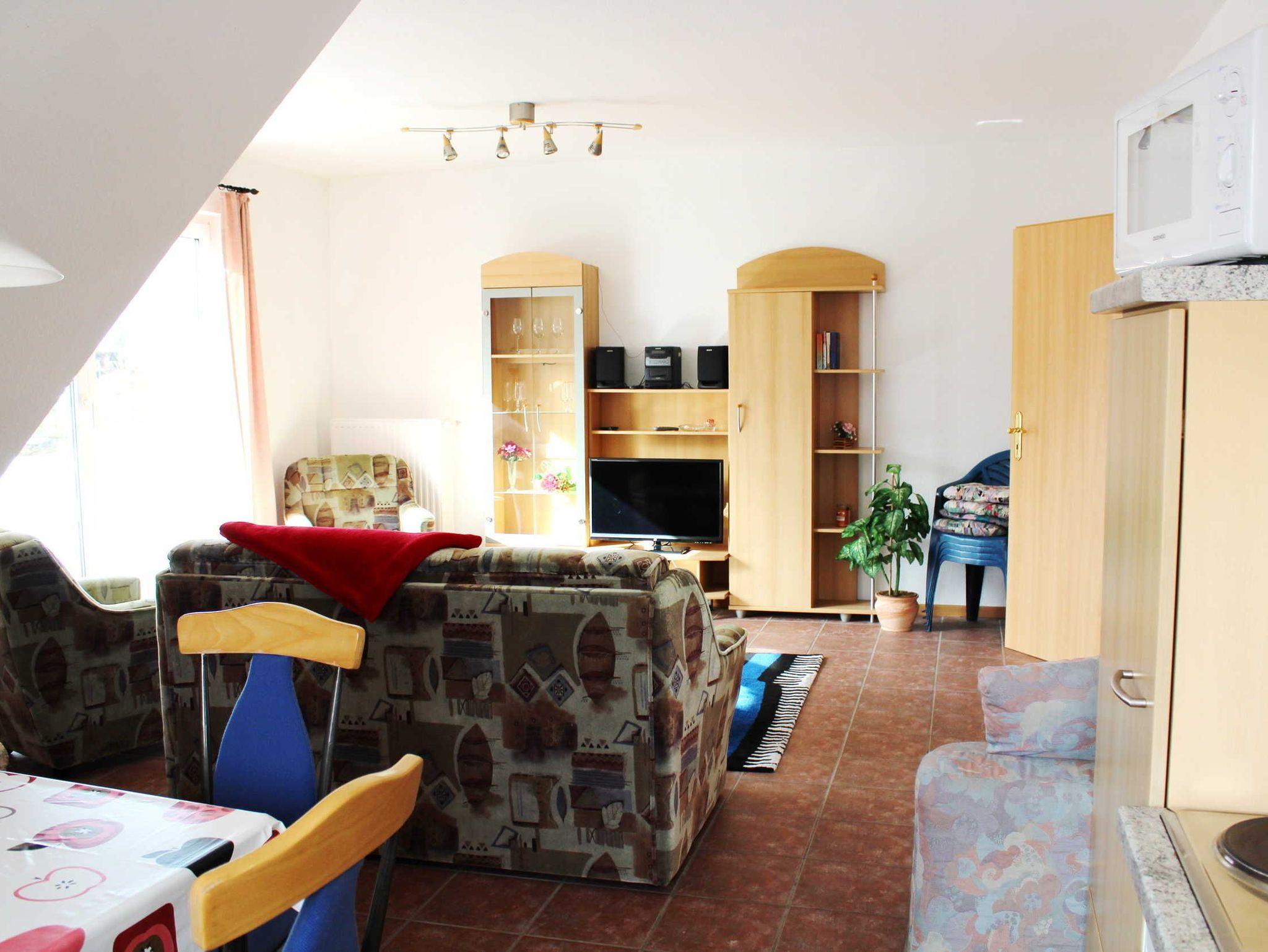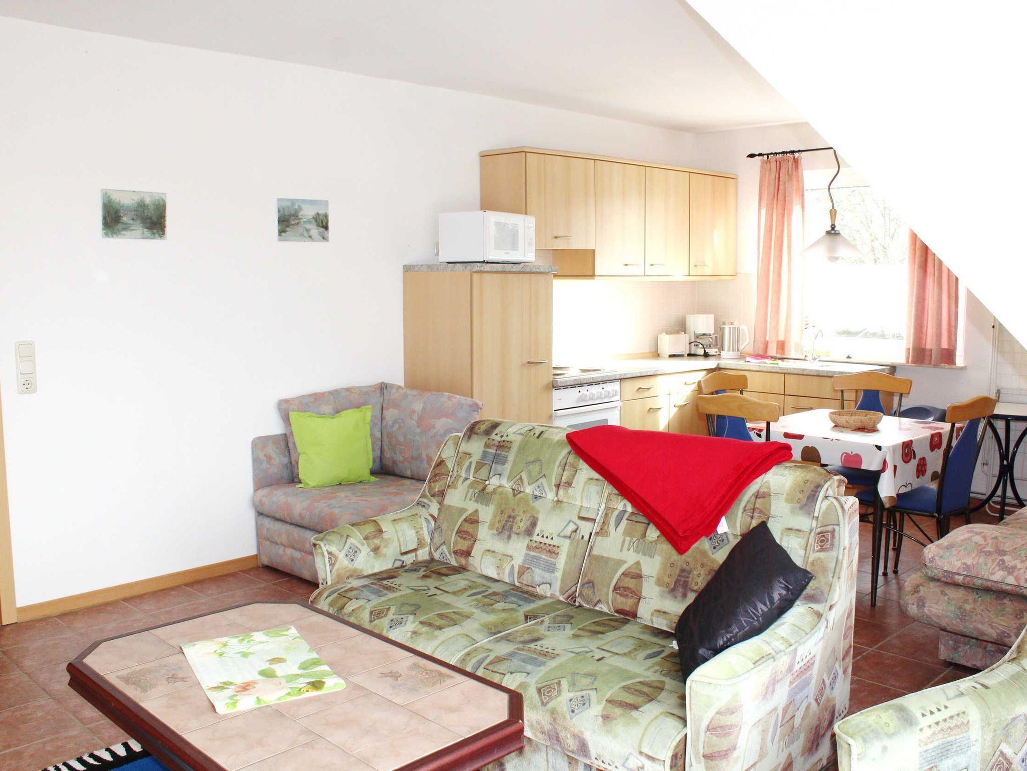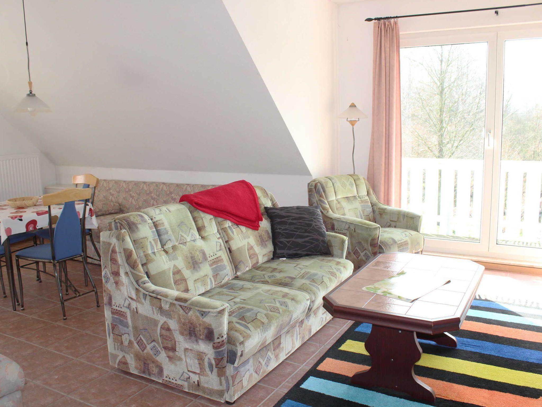 Die Ferienwohnung befindet sich in Haus 3, obere Etage links, ist modern ausgestattet und bietet eine komfortable Aufteilung: ein Wohn-/Schlafraum mit Rundcouch (ausziehbar) und Einzelliege, Stereoanlage, TV und Sitzgruppe, dazu ein separates Schlafzimmer mit Doppelbett. Außerdem gibt es eine komplett ausgestattete Küche inklusive Mikrowelle sowie ein Bad mit Badewanne und WC.