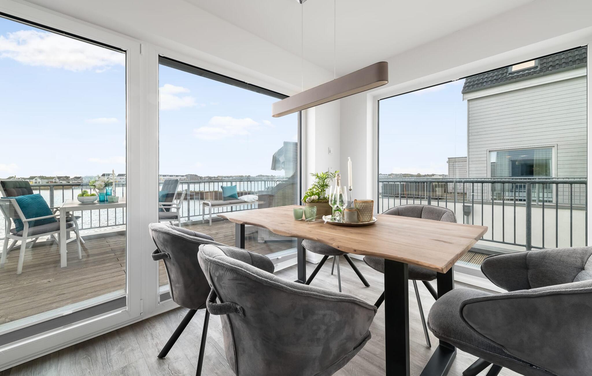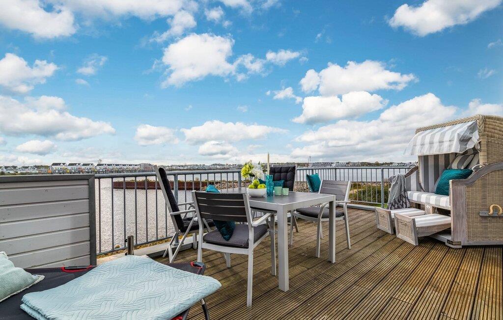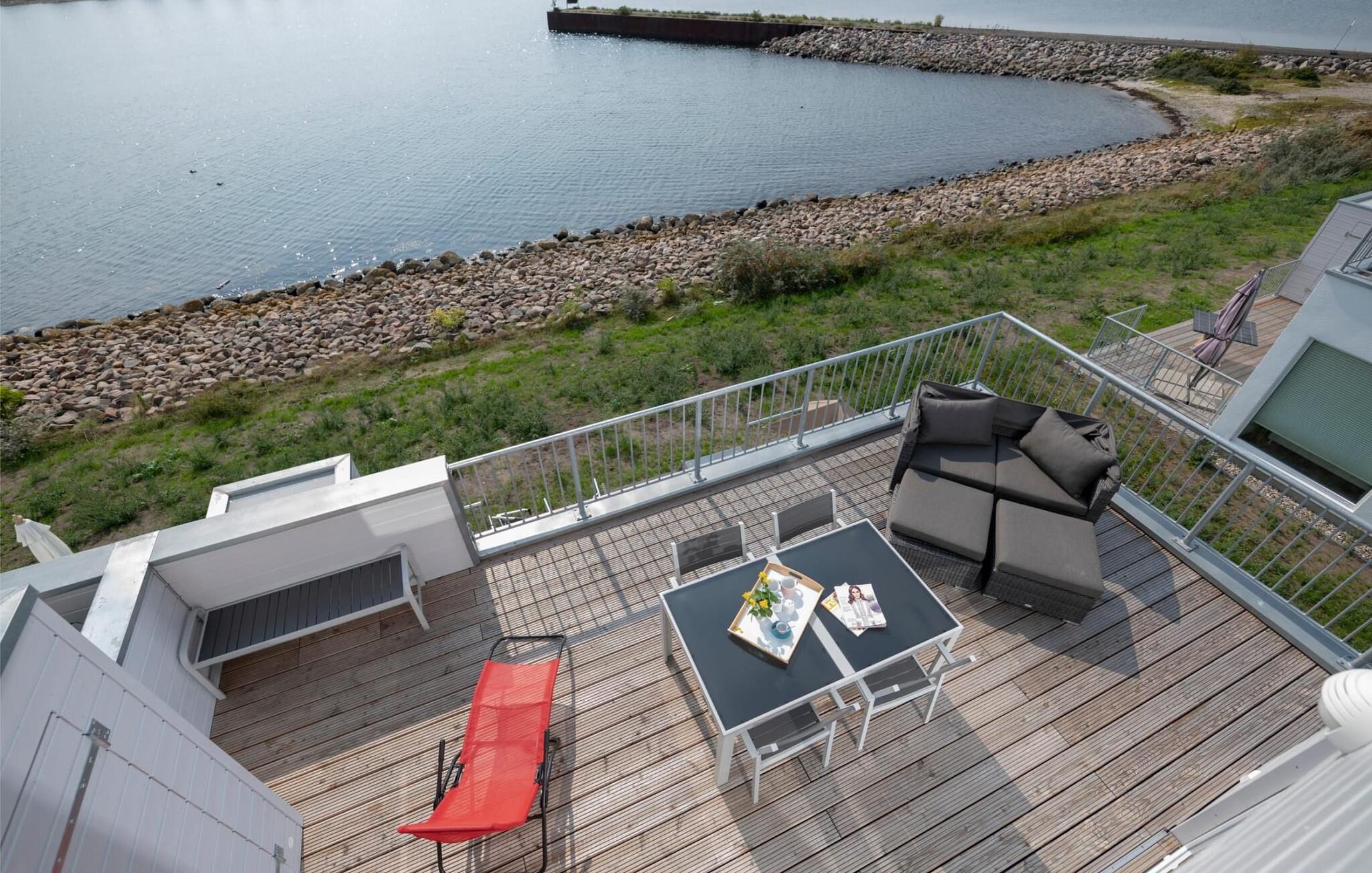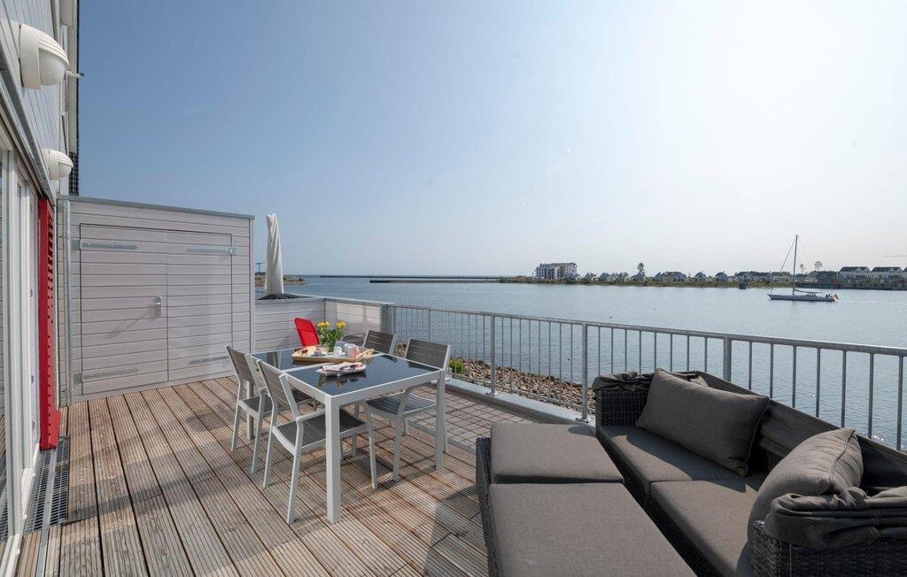 Traumhafte Aussichten eröffnen sich auf der an den Essbereich angrenzenden Terrasse mit Blick über den Segel- und Sportboothafen des OstseeResort Olpenitz. Ob romantisches Candle-Light-Dinner oder gesellige Grillrunde, Hafenkino und traumhafte Sonnenansichten sind garantiert. Komfortable Gartenmöbel und ein Elektrogrill stehen für den Urlaubseinsatz bereit.