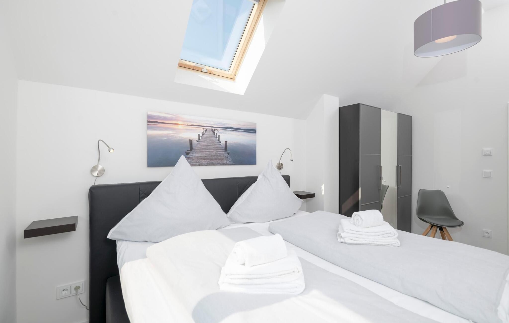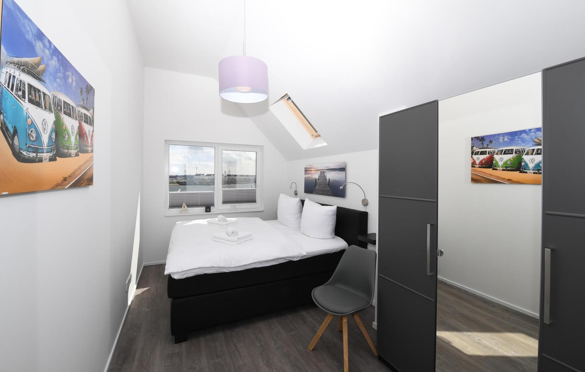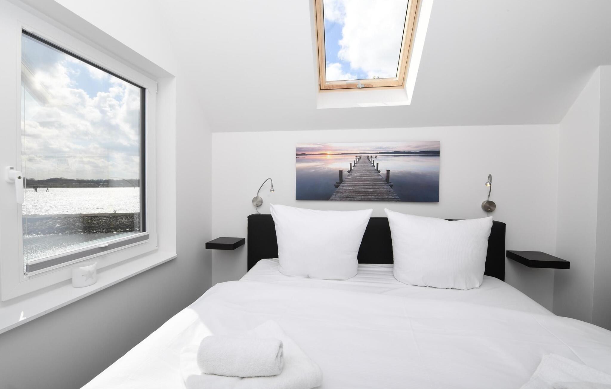 Auf der zweiten Ebene befindet sich das Traumland der Ferienwohnung. Das Hauptschlafzimmer verfügt über einen traumhaften Hafenblick und ist mit einem hochwertigen Boxspringbett ausgestattet. Einschlafen unter Sternen, ein Dachfenster erlaubt nicht nur den Blick in den Sternenhimmel, sondern auch in traumhafte Wolkenformationen, die so charakteristisch sind für den Norden. Das zweite Schlafzimmer bietet zwei Einzelbetten und einen einzigartigen Blick auf die Schlei, schon frühmorgens können die ersten Segelboote beobachtet werden!