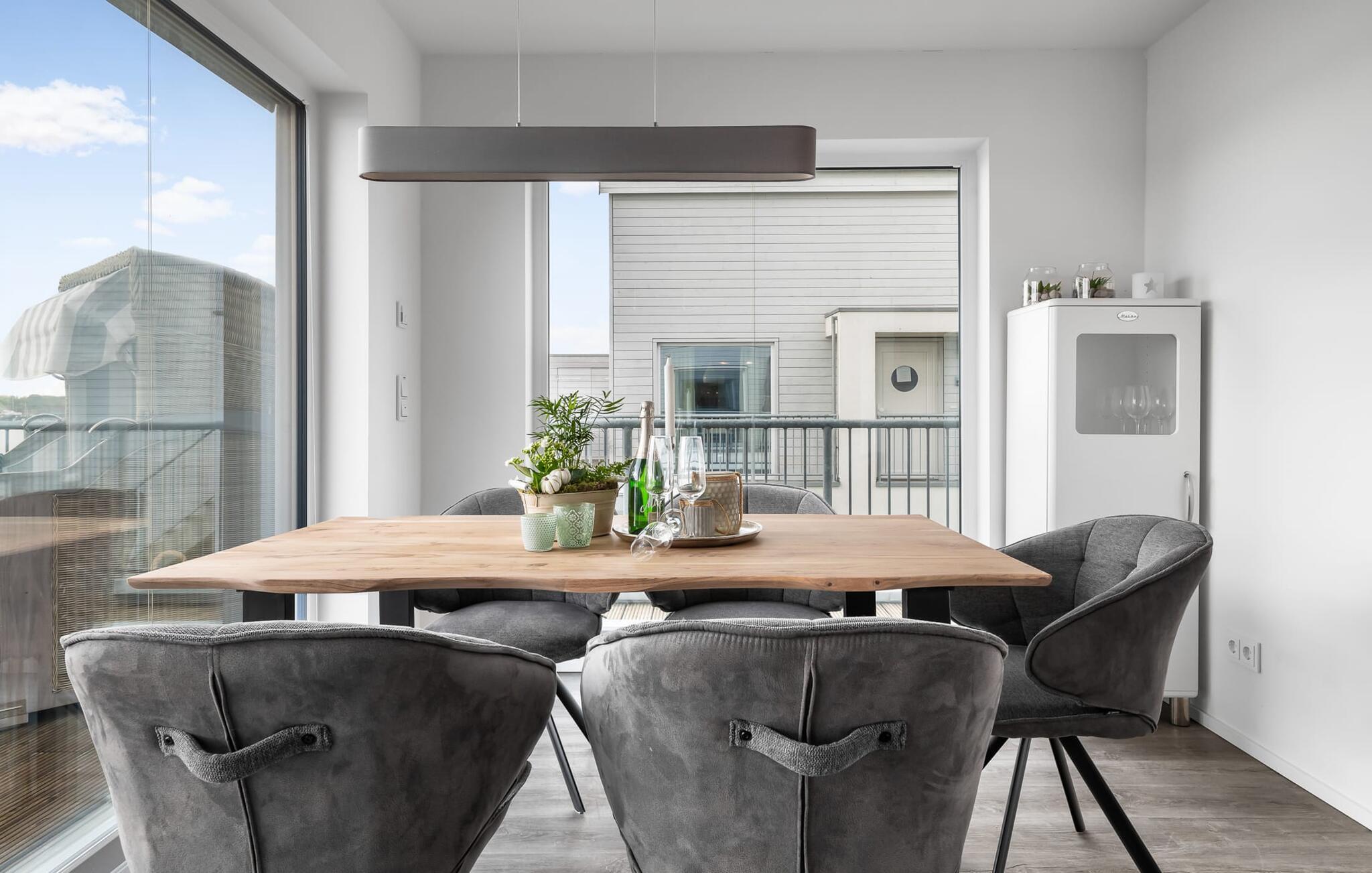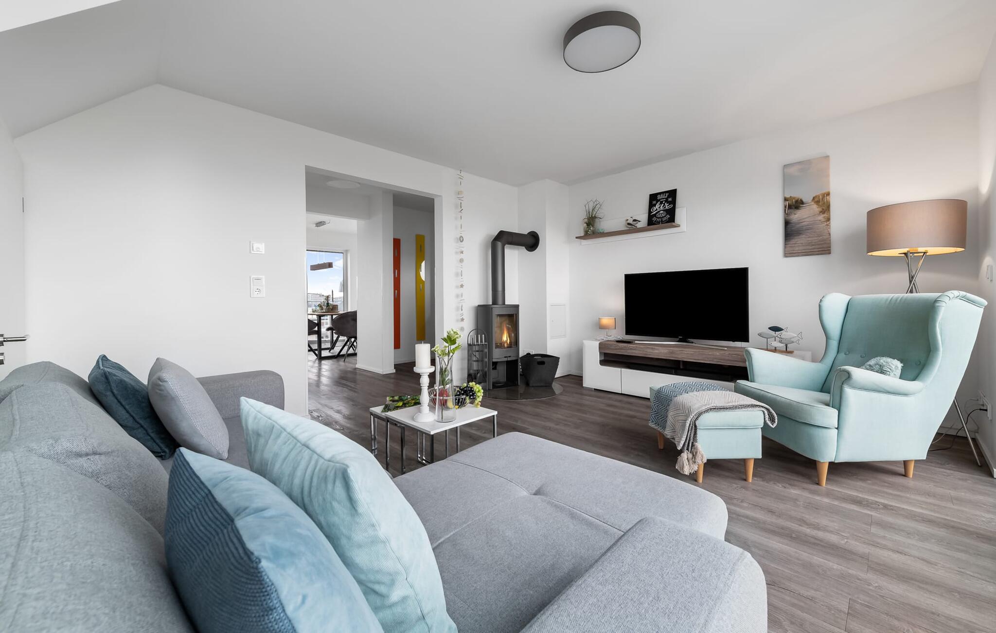 Kuschelig wird es im Wohnzimmer, denn hier lädt eine gemütliche Sitzlandschaft an Schietwettertagen zu einem Kaminabend ein. Für Indoor Entertainment sorgt außerdem der große Smart TV mit Soundbar, Subwoofer und Bluetooth.