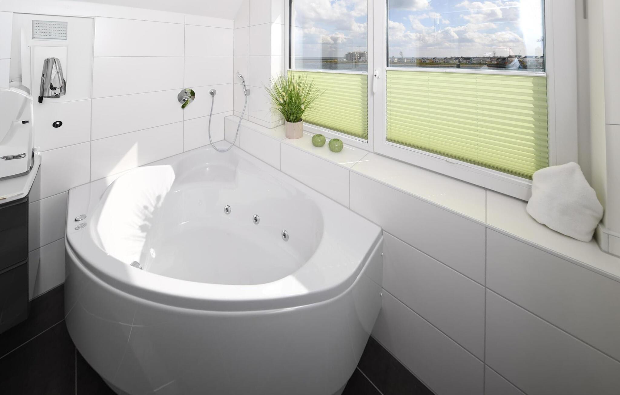 Unser Lieblingsplatz: Nach einem ausgiebigen Strandspaziergang ein entspannendes Bad mit Hafenblick nehmen und die Seele baumeln lassen.