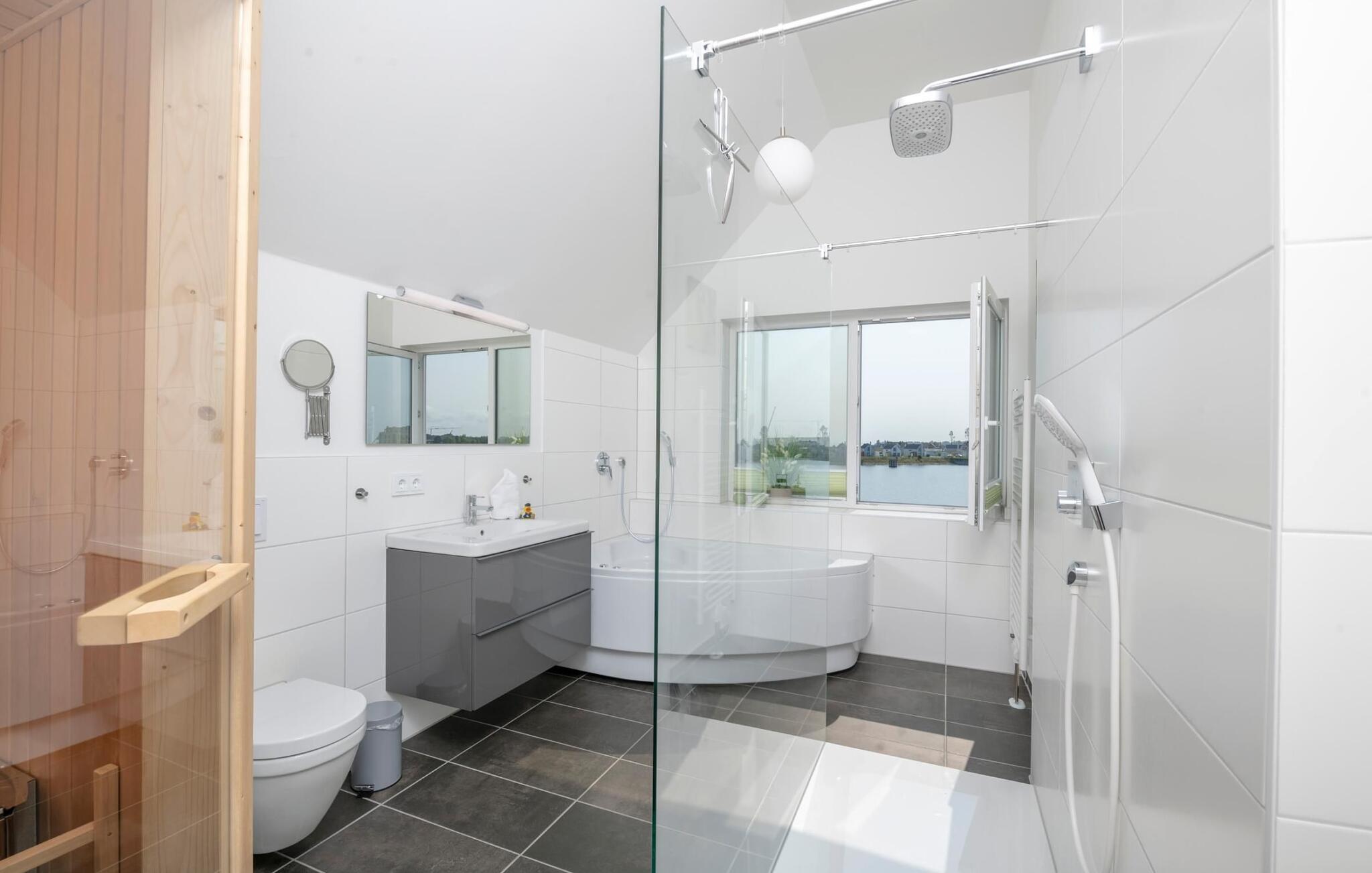 Der private Wellnessbereich lädt zum Entspannen ein: Eine finnisches Sauna sowie eine Relax-Whirlpool-Badewanne mit Wasserblick stehen nach dem Strandspaziergang zum Entspannen bereit. Die große offene und bodengleiche Dusche erlaubt einen freien Blick aufs Meer.