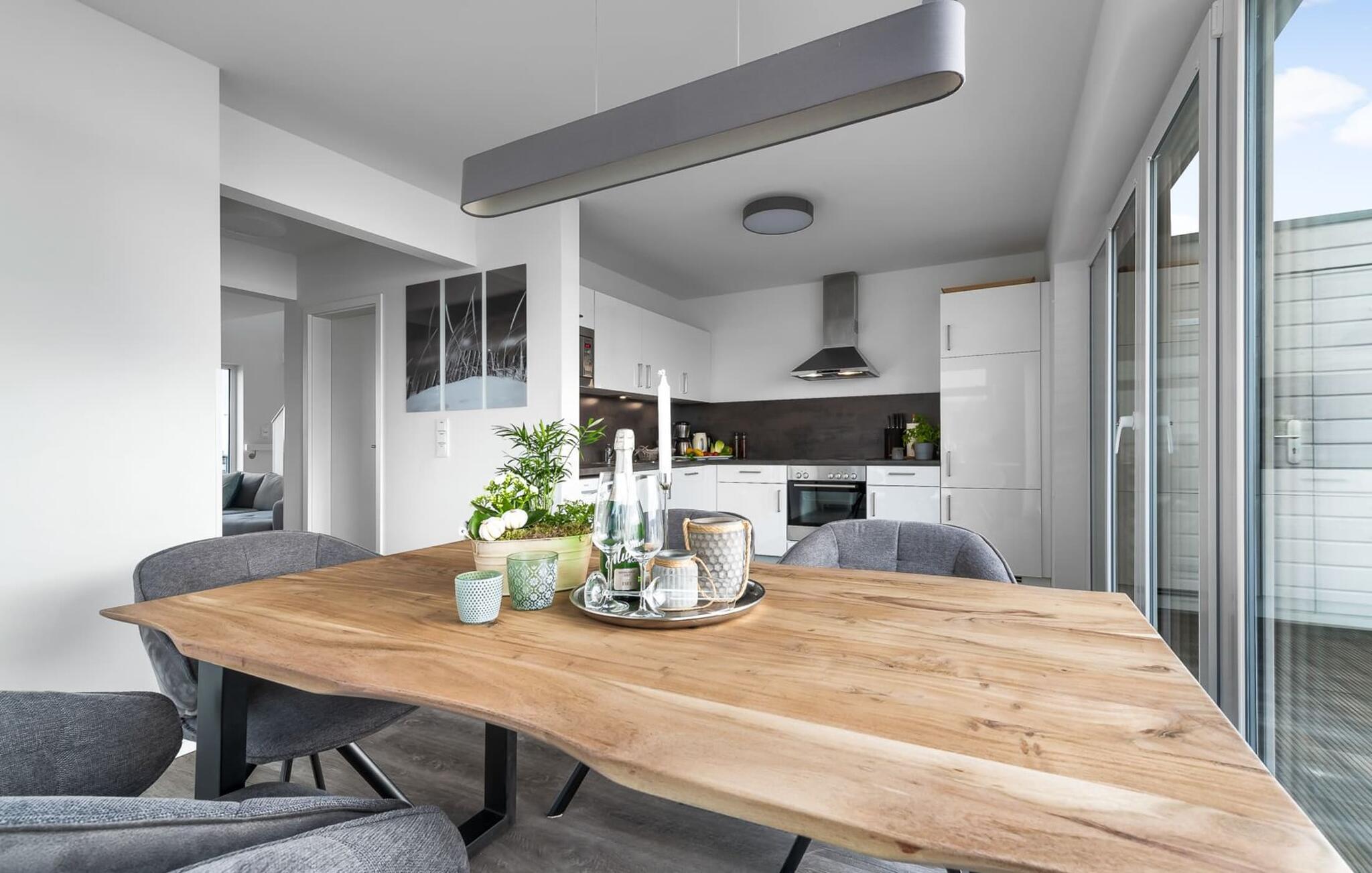Der Wohn- /Essbereich ist lichtdurchflutet mit bodentiefen Panorama-Fensterfronten zu den anliegenden Terrassen auf beiden Seiten.