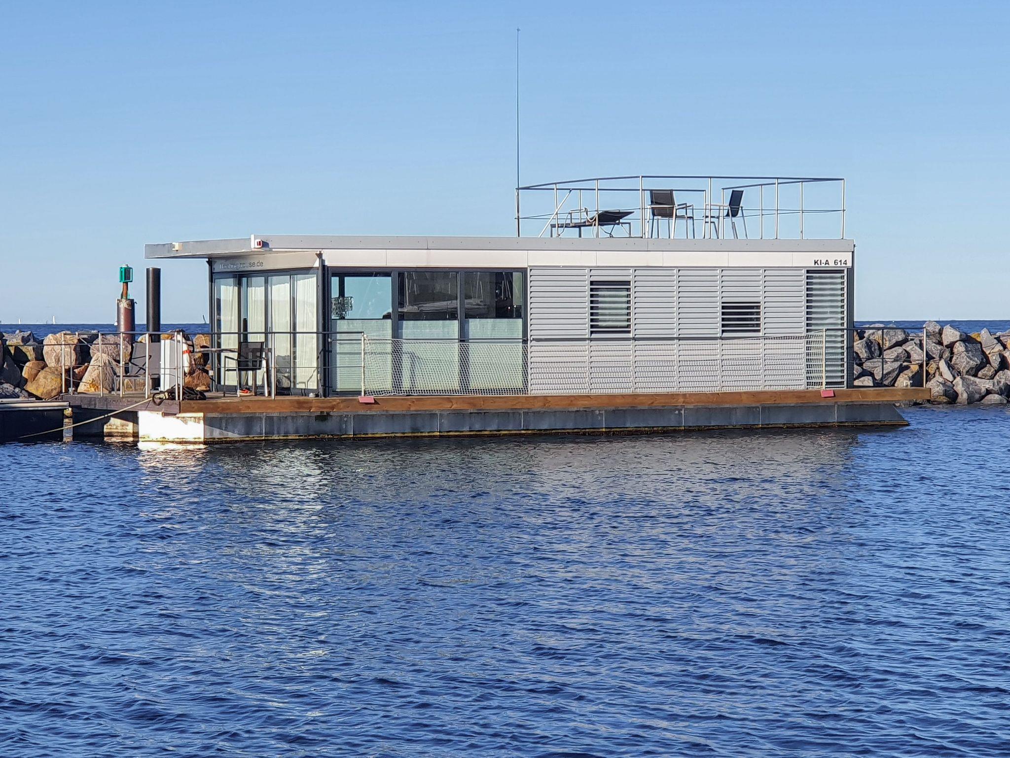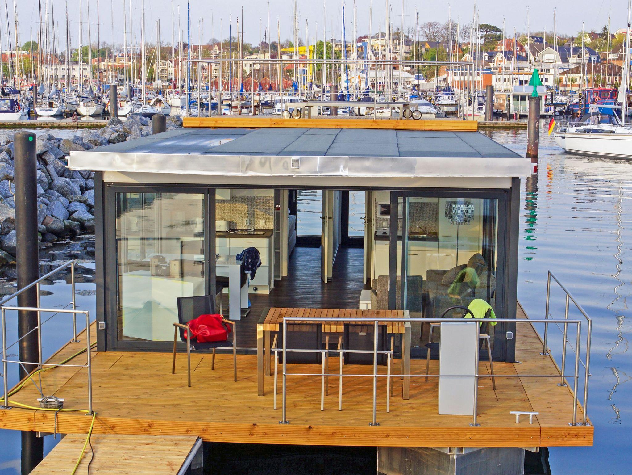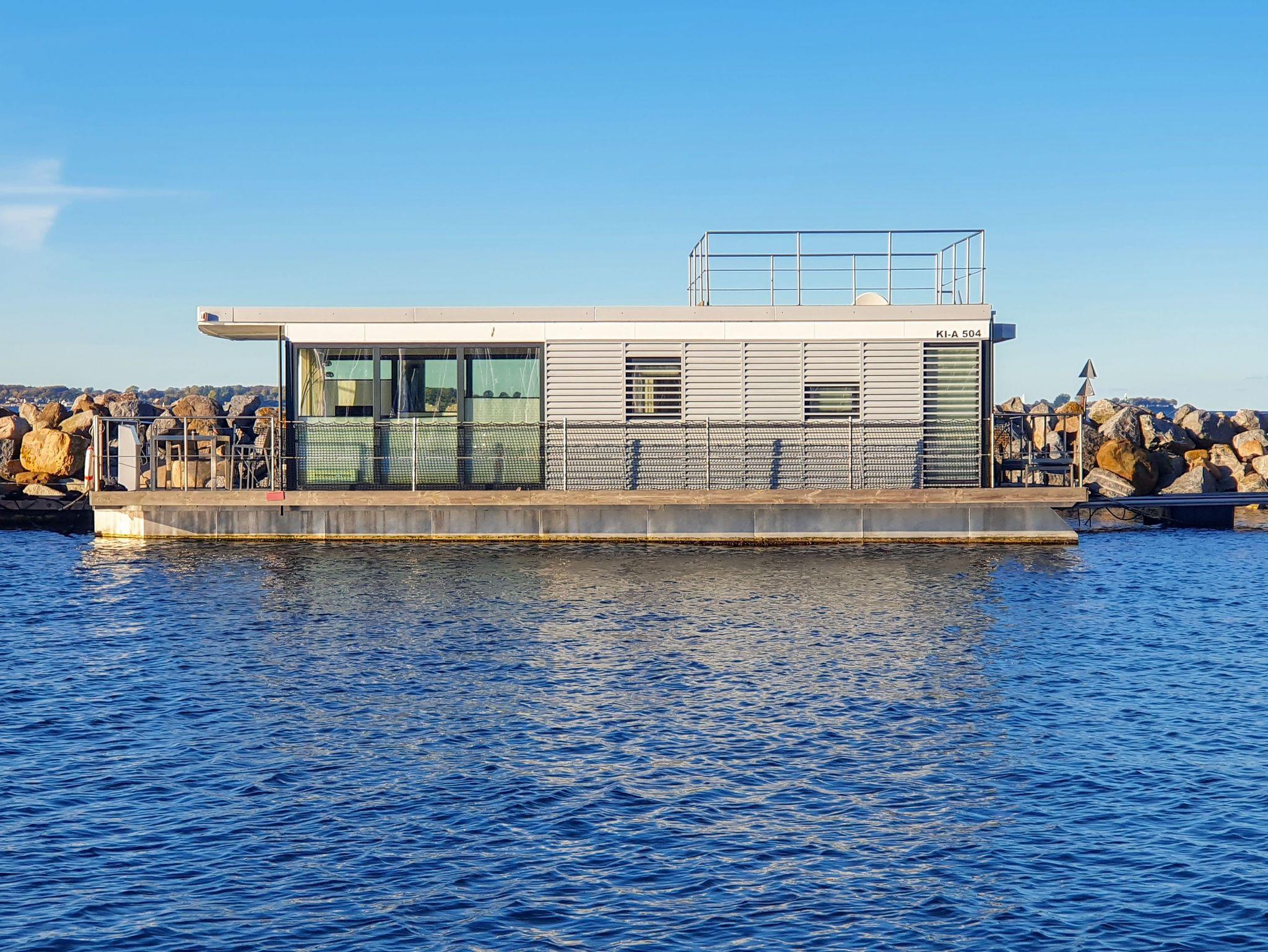 Erleben Sie maritimen Komfort auf dem stilvollen Floating House in Laboe mit Terrasse und Sonnendeck direkt an der Kieler Förde.