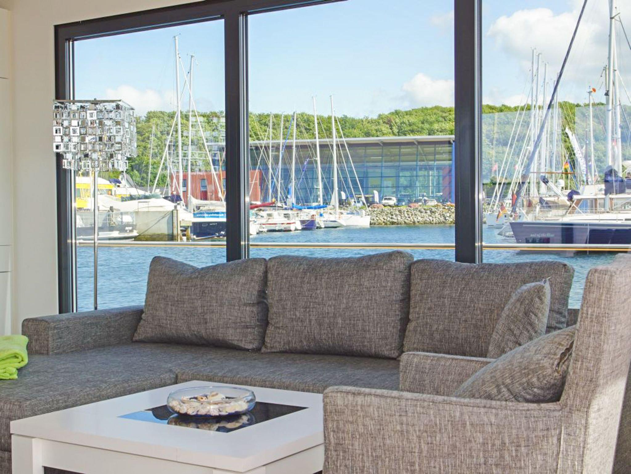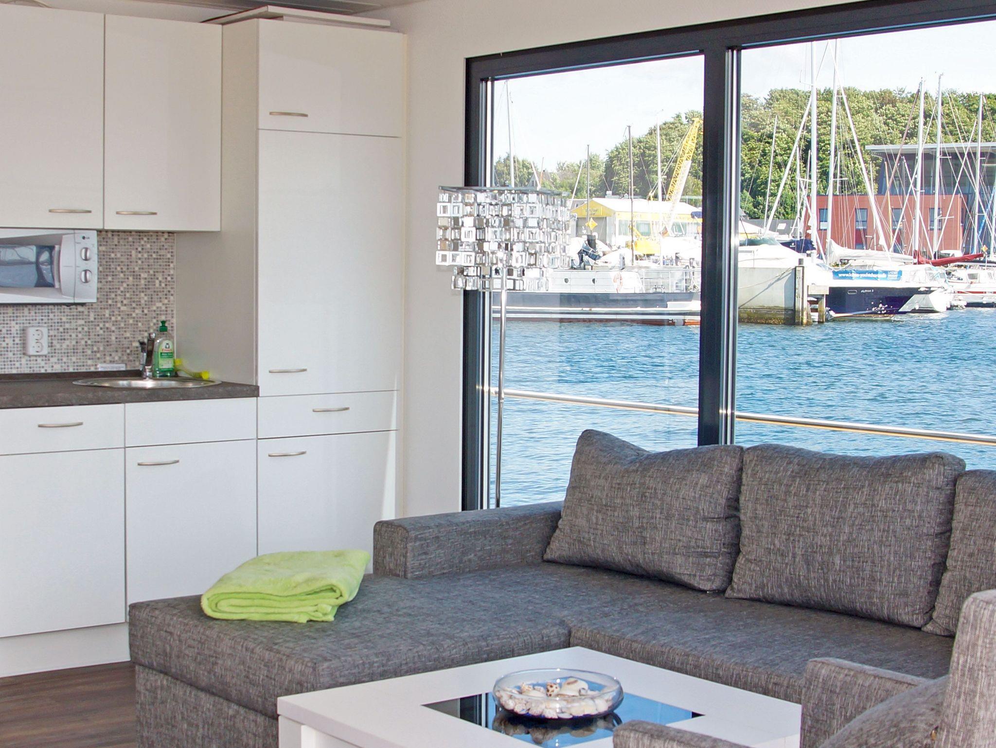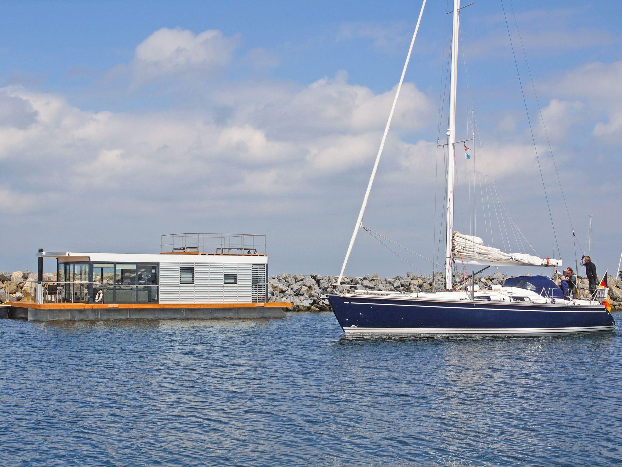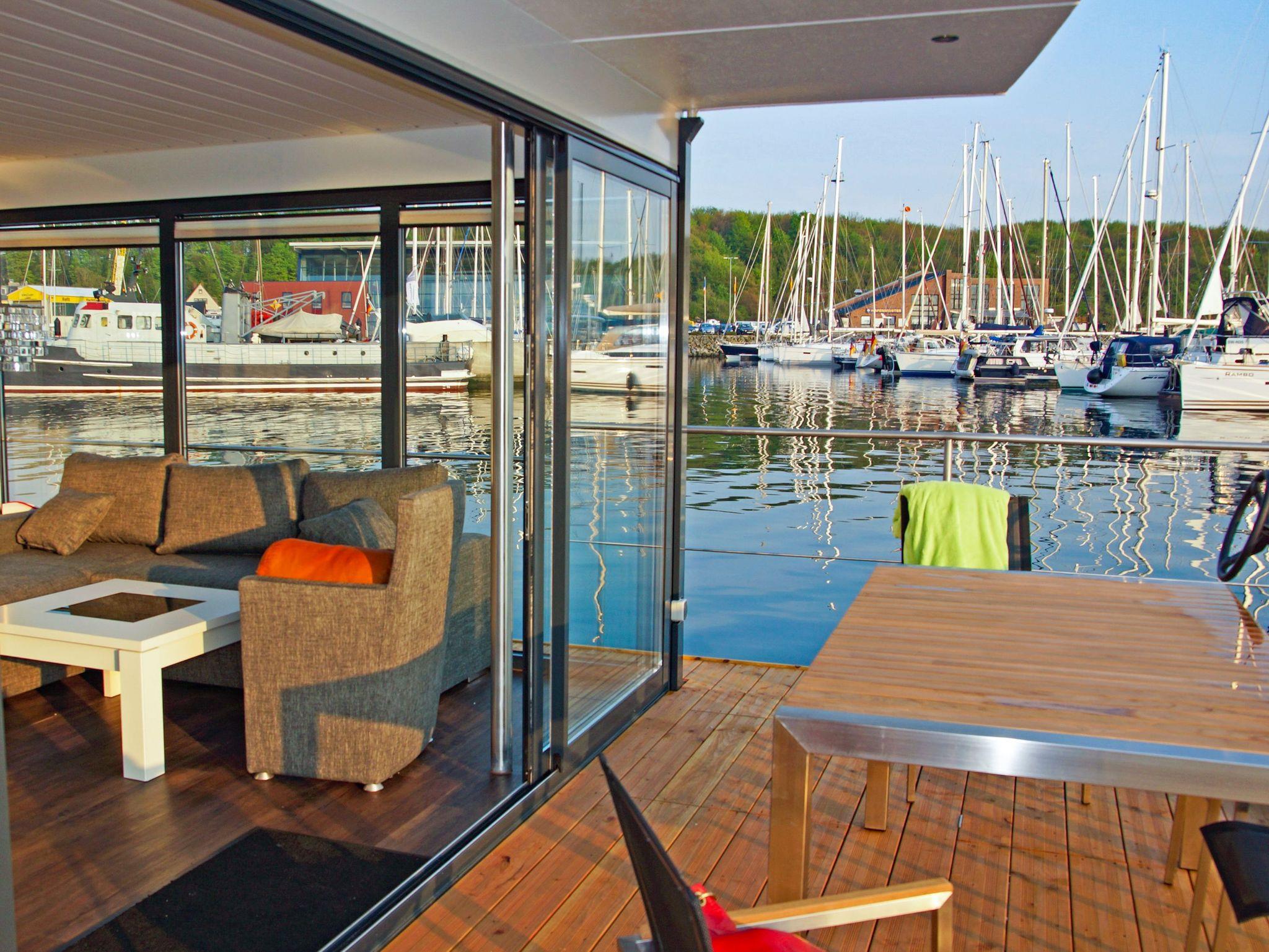 Erleben Sie maritimen Komfort auf dem stilvollen Floating House in Laboe mit Terrasse und Sonnendeck direkt an der Kieler Förde.