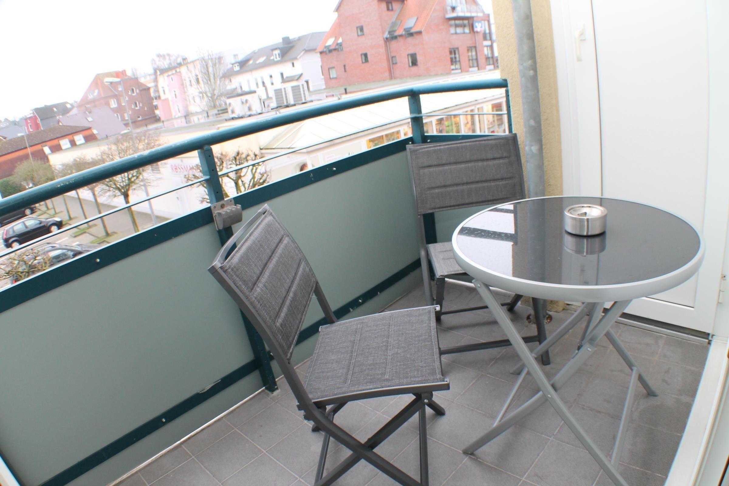 Direkt an den Wohnraum angebunden befindet sich der gemütliche Balkon der Unterkunft. Komfortable Balkonmöbel sorgen gemeinsam mit der beidseitigen Begrenzung dafür, dass das Verweilen hier nicht nur komfortabel, sondern auch bei Wind und Wetter möglich ist.