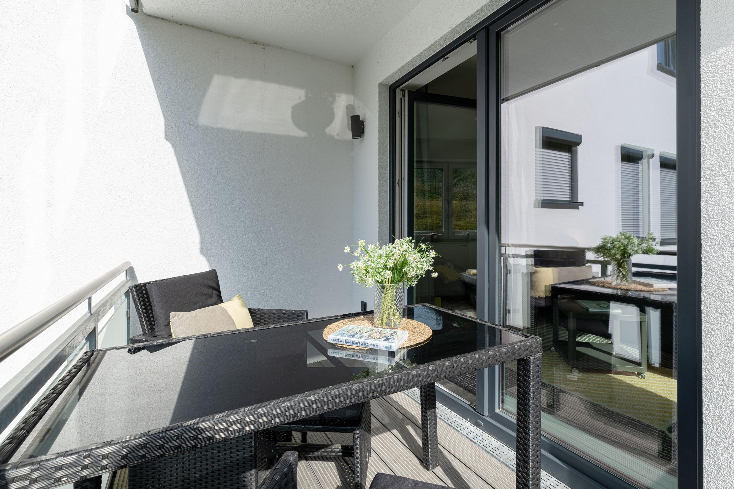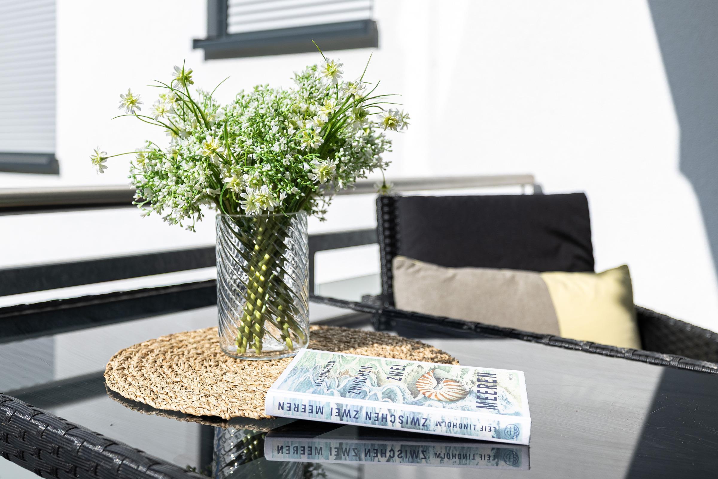 Helle Ferienwohnung Ahoi in Laboe mit zwei Balkonen, moderner Ausstattung und Strandnähe.