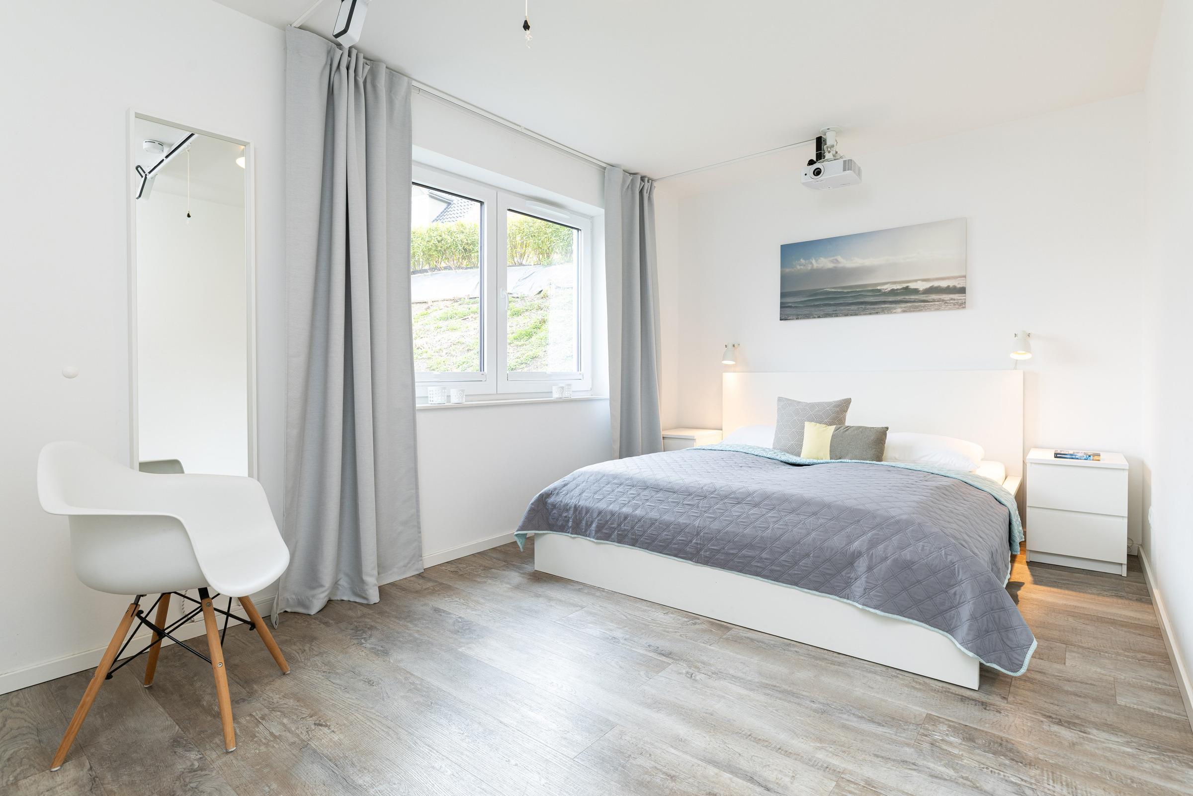 Das Zentrum des hellen Wohnbereichs bildet ein großer Tisch zum Essen, Spielen oder Klönen. Ein gemütliches Ecksofa lädt zum Lesen oder Fernsehen ein. Die Technik ist auf dem neusten Stand: Es erwartet Sie ein Smart-Fernseher, ein Blu-ray-Player mit div. DVDs für Kinder und Erwachsene, ein Beamer im Schlafzimmer mit Zugängen zu Netflix, Amazon Prime und Co. sowie ein Stereo-Digitalradio mit Bluetooth Audiostreaming. Wer ohne elektronische Medien Zeit verbringen möchte, findet in der "Spielekiste" Gesellschaftsspielen. Auch Urlaubslektüre steht Ihnen zur Verfügung. Die moderne Küchenzeile ist ausgestattet mit Geschirrspülmaschine, Ceran-Kochfeld, Backofen, Kühlschrank etc. Das separate Schlafzimmer bietet im Doppelbett (180x200 cm) erholsamen Schlaf. Im kleinen Schlafzimmer steht ein Etagenbett (je 80x200 cm). Sie möchten zu sechst in der Wohnung Urlaub machen? Dann wandeln Sie zusätzlich das Ecksofa im Wohnzimmer in eine weitere Liegefläche (140x200 cm) um. Im Badezimmer mit Dusche und Badewanne können Sie nach einem Strandtag prima entspannen. Zusätzlich gibt es ein Gäste-WC. Die Wohnung ist mit einem stilvollen Design-Fußboden sowie einer Fußbodenheizung ausgestattet. Ein Highlight sind sicher die beiden möblierten Balkone: Der Süd-West-Balkon bietet Ihnen einen geschützten Ort zum Sonnen. Der Nord-Ost-Balkon mit Blick gen Förde eignet sich hervorragend für ein sonniges Frühstück oder einen Sun-Downer in der Abendsonne.
