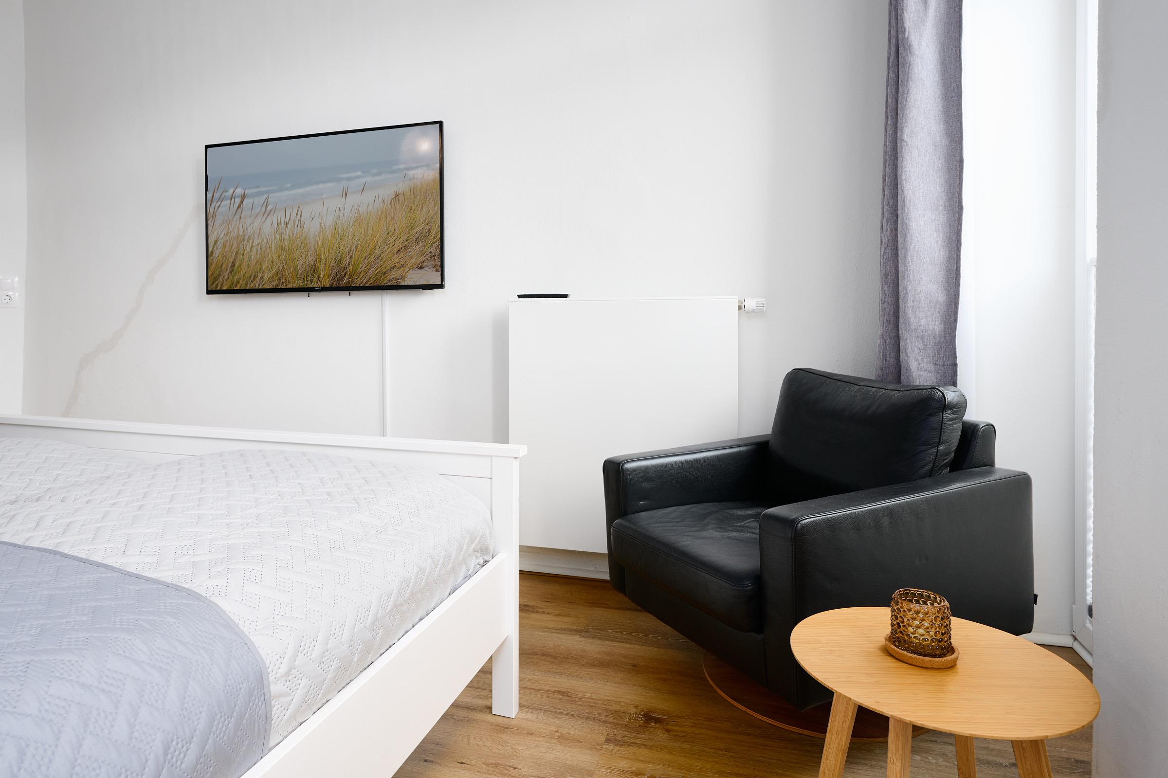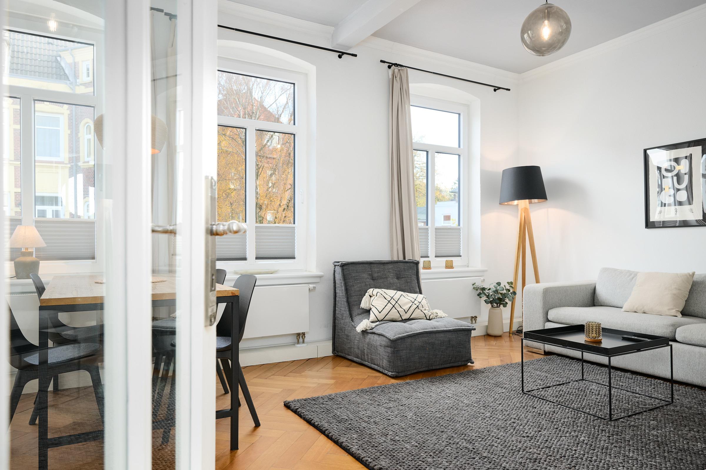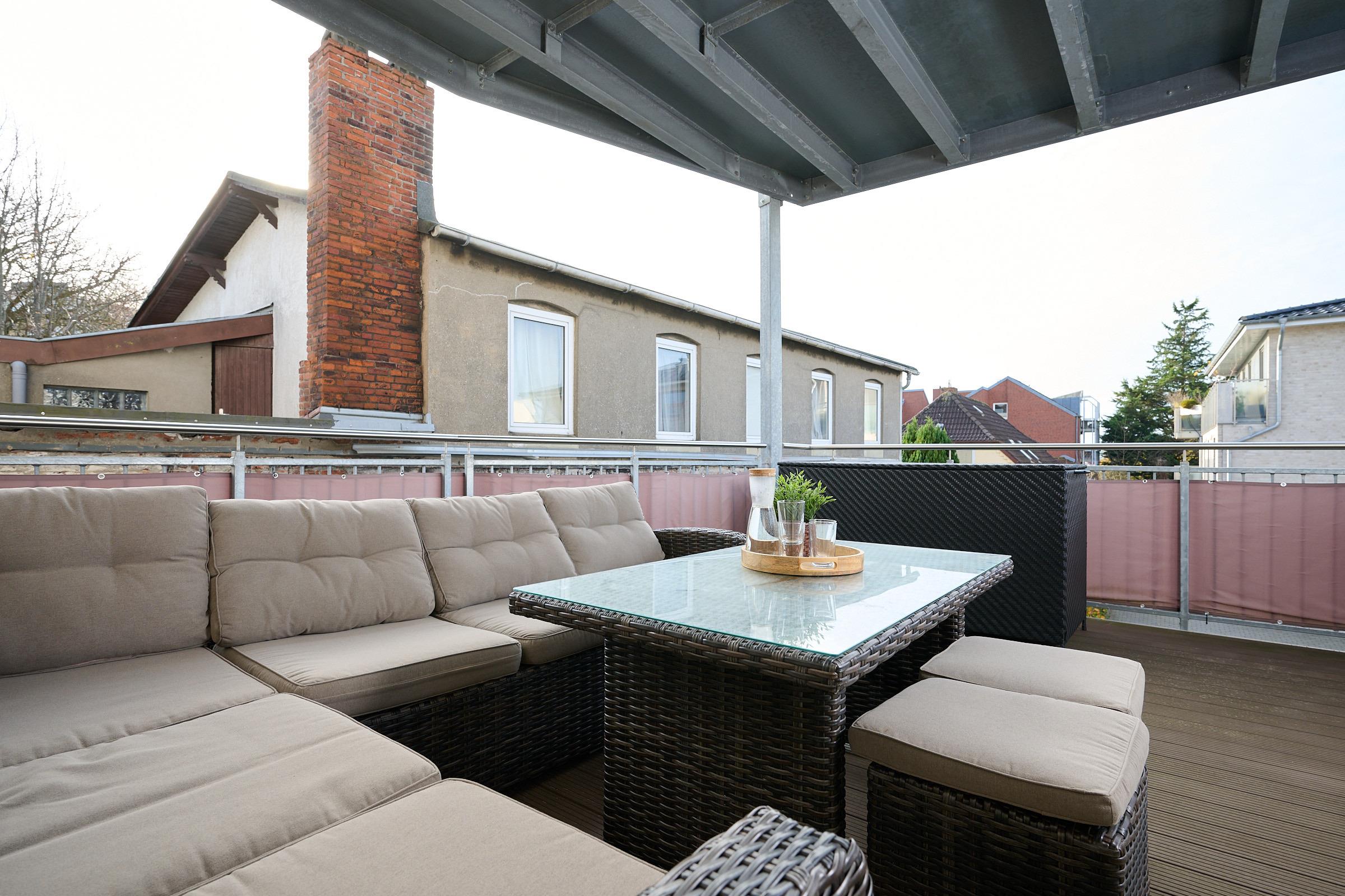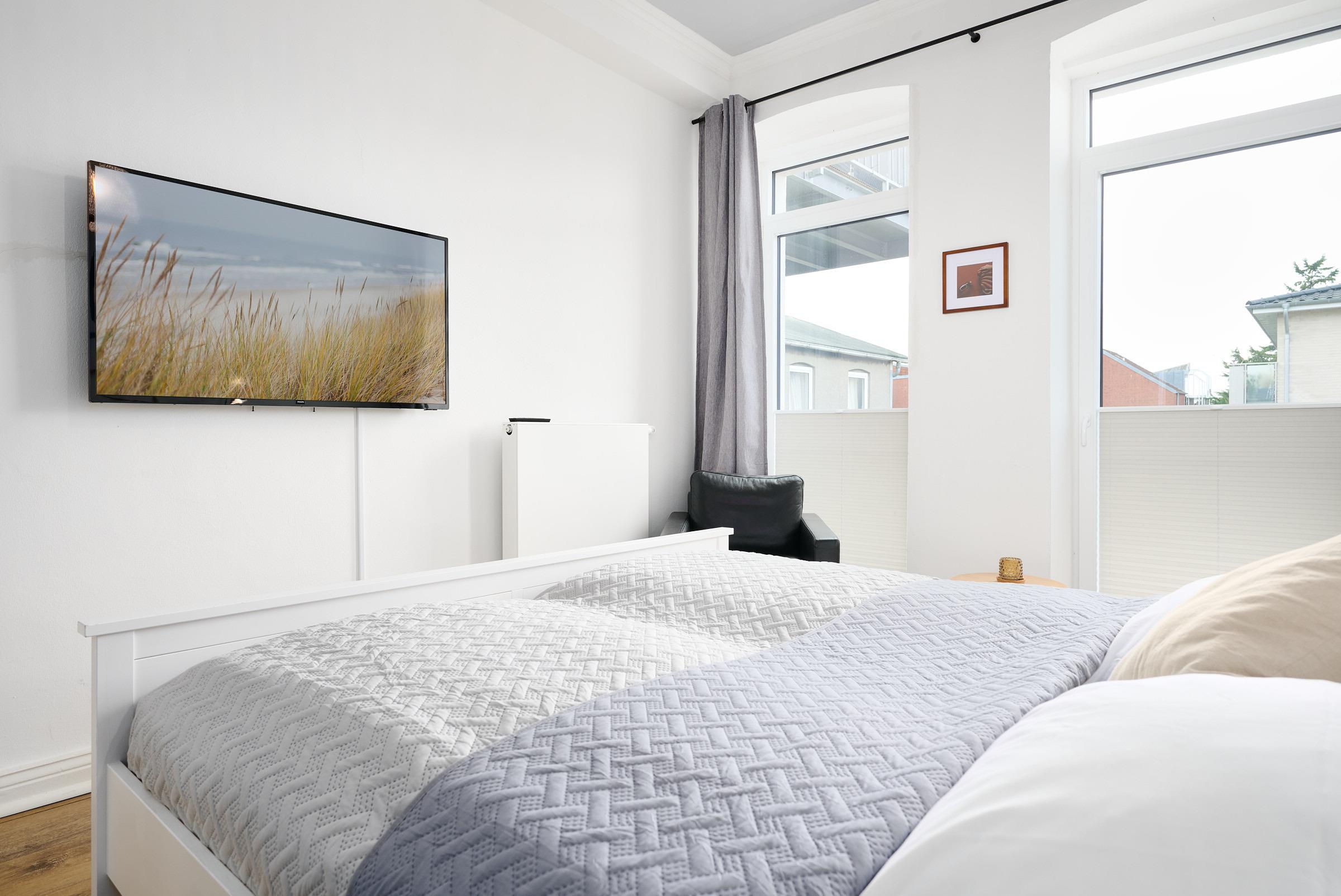 Herzlich willkommen! Freuen Sie sich auf den Charmes eines Altbaus mit hohen Decken und Dielen. Alle Zimmer sind dank zahlreicher Fenster lichtdurchflutet. Das geschmackvoll eingerichtete Wohnzimmer mit großem Esstisch lädt zum Verweilen ein. Neben den komfortablen Möbeln, die den Charme des Altbaus bekräftigen, glänzt die Wohnung durch die technische Ausstattung: Zwei große Smart-TV Geräte sind mit Netflix, Amazon Prime etc. ausgestattet und über Google Home (dem Gegenstück zu Alexa) können Sie per Stimme jederzeit Radio und Musik abspielen lassen. In der separaten, modernen Küche kommen Hobbyköche auf Ihre Kosten und können dank der guten Ausstattung mühelos ihre Lieblingsspeisen zaubern. Zudem verfügt sie neben einer Filterkaffeemaschine auch über eine Kapselmaschine. Erholsamen Schlaf finden Sie in den beiden Schlafzimmern mit jeweils einem bequemen Doppelbett. Eines der Schlafzimmer ist mit dem Wohnzimmer über eine breite Schiebetür verbunden, die für die Nacht geschlossen werden kann. Das komfortable Badezimmer lässt kaum einen Wunsch offen. Von der großen, ebenerdigen Dusche blicken Sie nach draußen über den mit fast 20 m² riesigen Balkon, welcher sowohl vom Bad, als auch von der Küche aus betreten werden kann. Hier können Sie die gute Ostseeluft genießen und den Alltag hinter sich lassen,