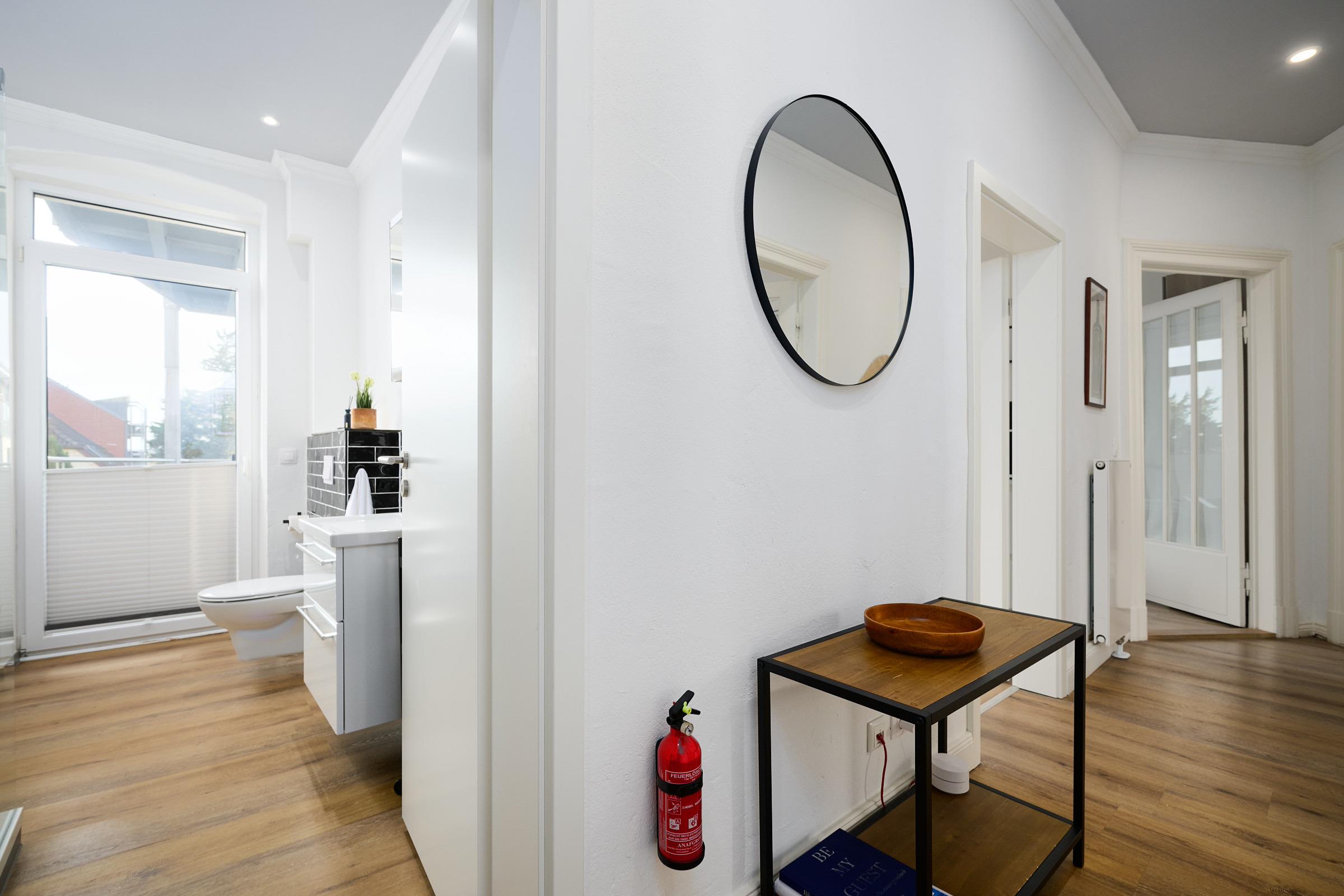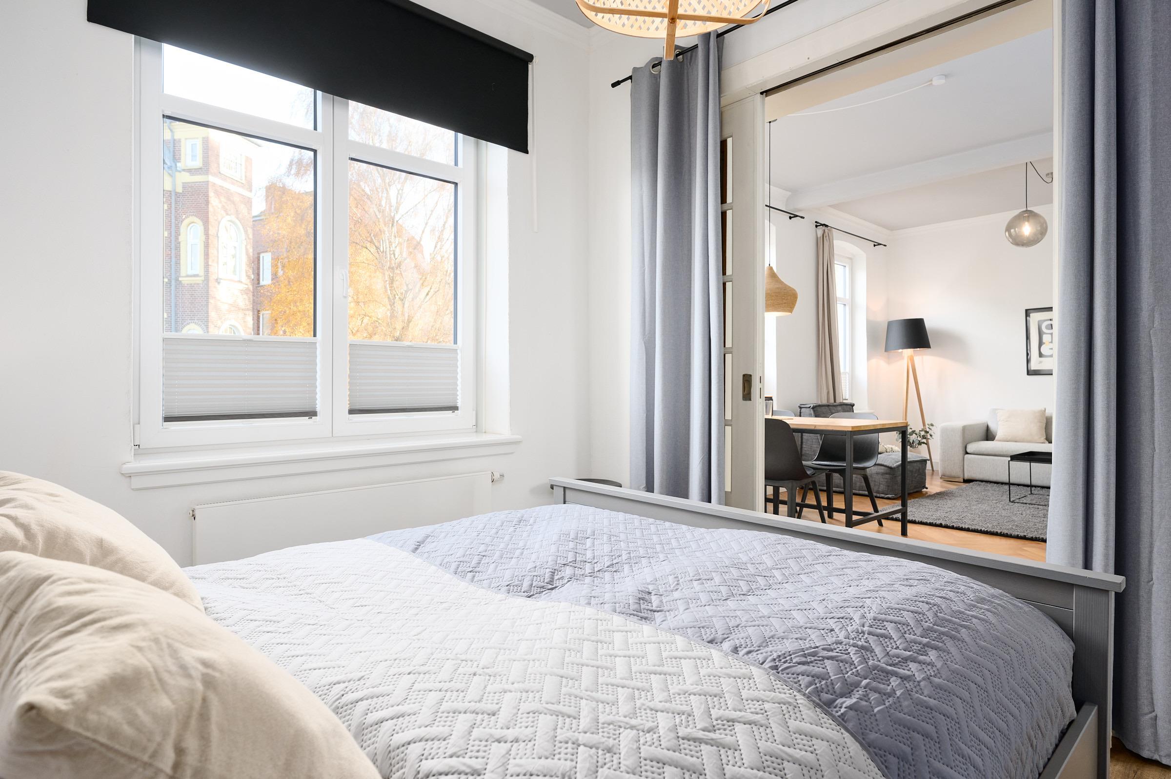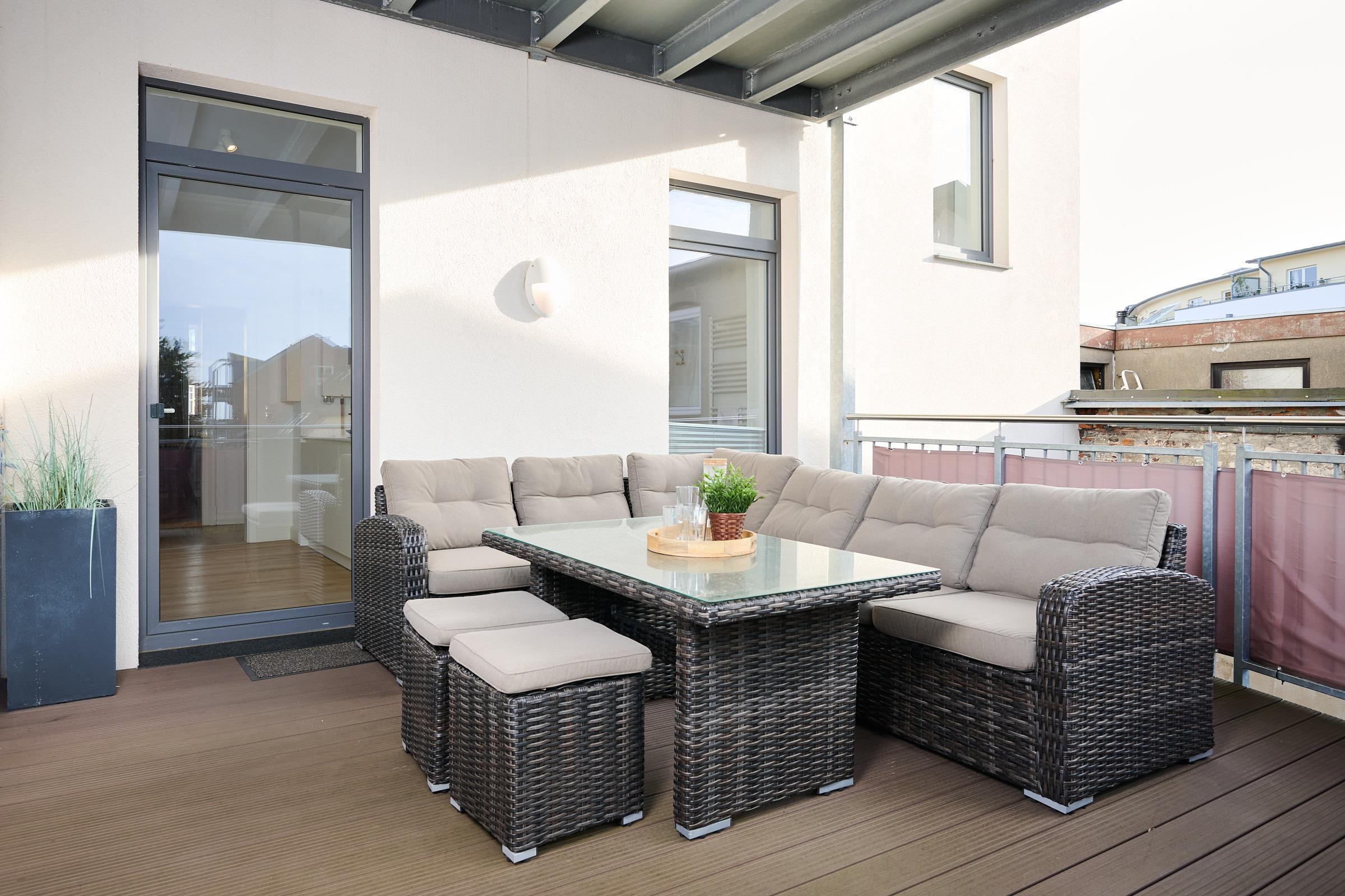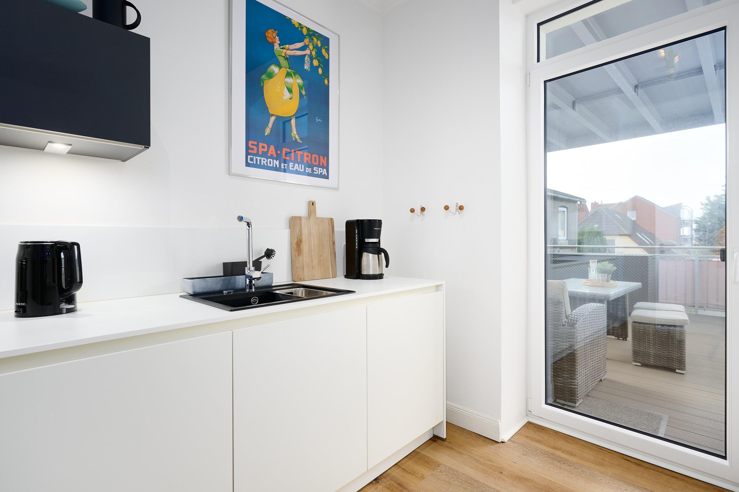 Herzlich willkommen! Freuen Sie sich auf den Charmes eines Altbaus mit hohen Decken und Dielen. Alle Zimmer sind dank zahlreicher Fenster lichtdurchflutet. Das geschmackvoll eingerichtete Wohnzimmer mit großem Esstisch lädt zum Verweilen ein. Neben den komfortablen Möbeln, die den Charme des Altbaus bekräftigen, glänzt die Wohnung durch die technische Ausstattung: Zwei große Smart-TV Geräte sind mit Netflix, Amazon Prime etc. ausgestattet und über Google Home (dem Gegenstück zu Alexa) können Sie per Stimme jederzeit Radio und Musik abspielen lassen. In der separaten, modernen Küche kommen Hobbyköche auf Ihre Kosten und können dank der guten Ausstattung mühelos ihre Lieblingsspeisen zaubern. Zudem verfügt sie neben einer Filterkaffeemaschine auch über eine Kapselmaschine. Erholsamen Schlaf finden Sie in den beiden Schlafzimmern mit jeweils einem bequemen Doppelbett. Eines der Schlafzimmer ist mit dem Wohnzimmer über eine breite Schiebetür verbunden, die für die Nacht geschlossen werden kann. Das komfortable Badezimmer lässt kaum einen Wunsch offen. Von der großen, ebenerdigen Dusche blicken Sie nach draußen über den mit fast 20 m² riesigen Balkon, welcher sowohl vom Bad, als auch von der Küche aus betreten werden kann. Hier können Sie die gute Ostseeluft genießen und den Alltag hinter sich lassen,
