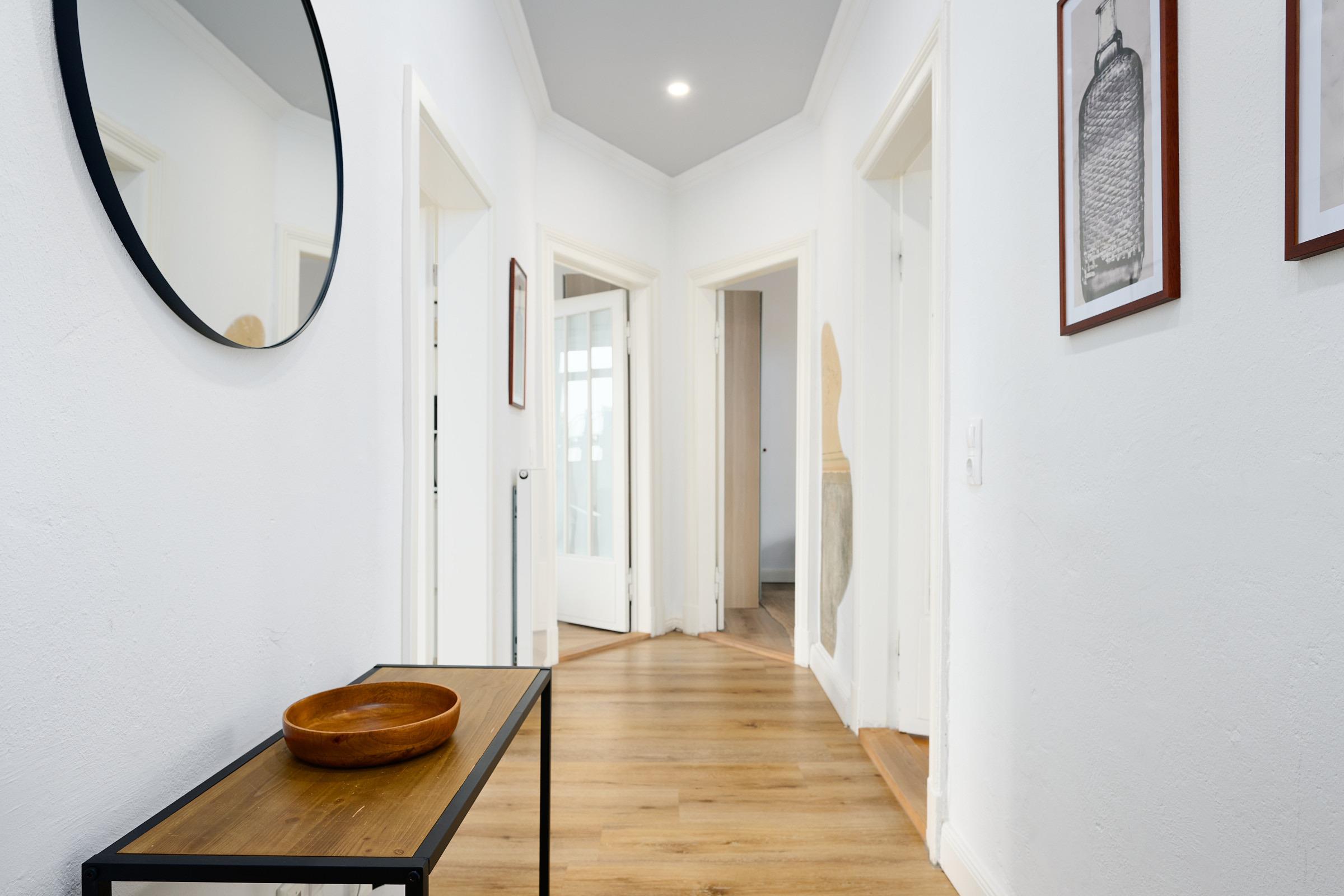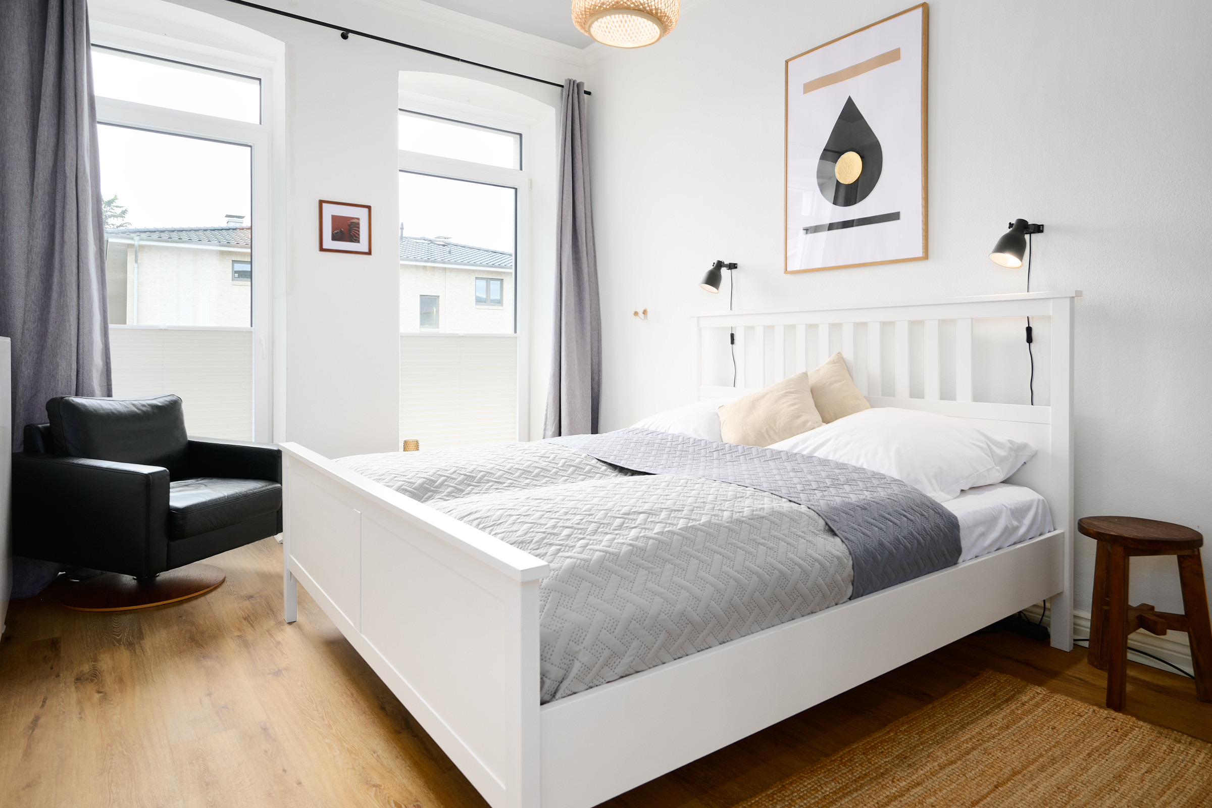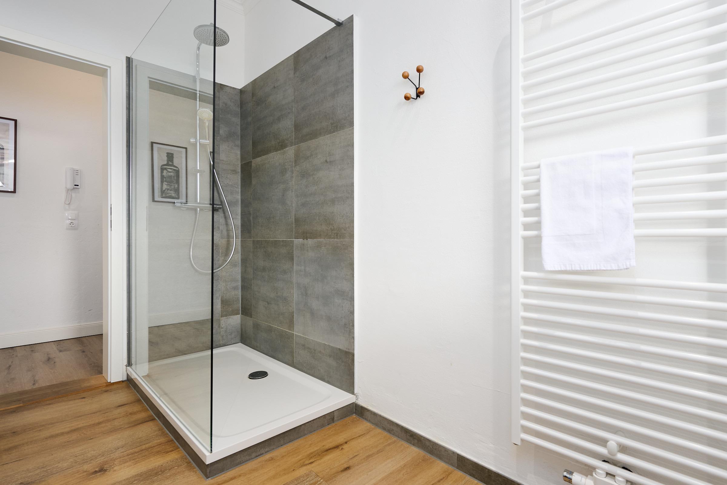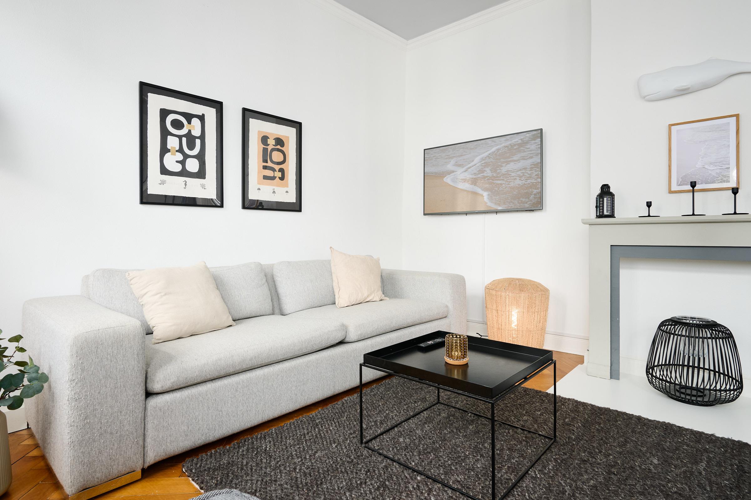 Herzlich willkommen! Freuen Sie sich auf den Charmes eines Altbaus mit hohen Decken und Dielen. Alle Zimmer sind dank zahlreicher Fenster lichtdurchflutet. Das geschmackvoll eingerichtete Wohnzimmer mit großem Esstisch lädt zum Verweilen ein. Neben den komfortablen Möbeln, die den Charme des Altbaus bekräftigen, glänzt die Wohnung durch die technische Ausstattung: Zwei große Smart-TV Geräte sind mit Netflix, Amazon Prime etc. ausgestattet und über Google Home (dem Gegenstück zu Alexa) können Sie per Stimme jederzeit Radio und Musik abspielen lassen. In der separaten, modernen Küche kommen Hobbyköche auf Ihre Kosten und können dank der guten Ausstattung mühelos ihre Lieblingsspeisen zaubern. Zudem verfügt sie neben einer Filterkaffeemaschine auch über eine Kapselmaschine. Erholsamen Schlaf finden Sie in den beiden Schlafzimmern mit jeweils einem bequemen Doppelbett. Eines der Schlafzimmer ist mit dem Wohnzimmer über eine breite Schiebetür verbunden, die für die Nacht geschlossen werden kann. Das komfortable Badezimmer lässt kaum einen Wunsch offen. Von der großen, ebenerdigen Dusche blicken Sie nach draußen über den mit fast 20 m² riesigen Balkon, welcher sowohl vom Bad, als auch von der Küche aus betreten werden kann. Hier können Sie die gute Ostseeluft genießen und den Alltag hinter sich lassen,