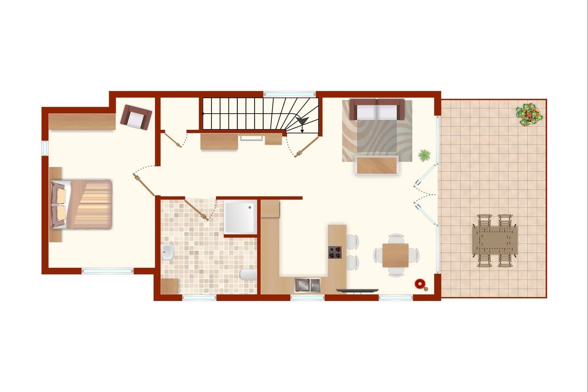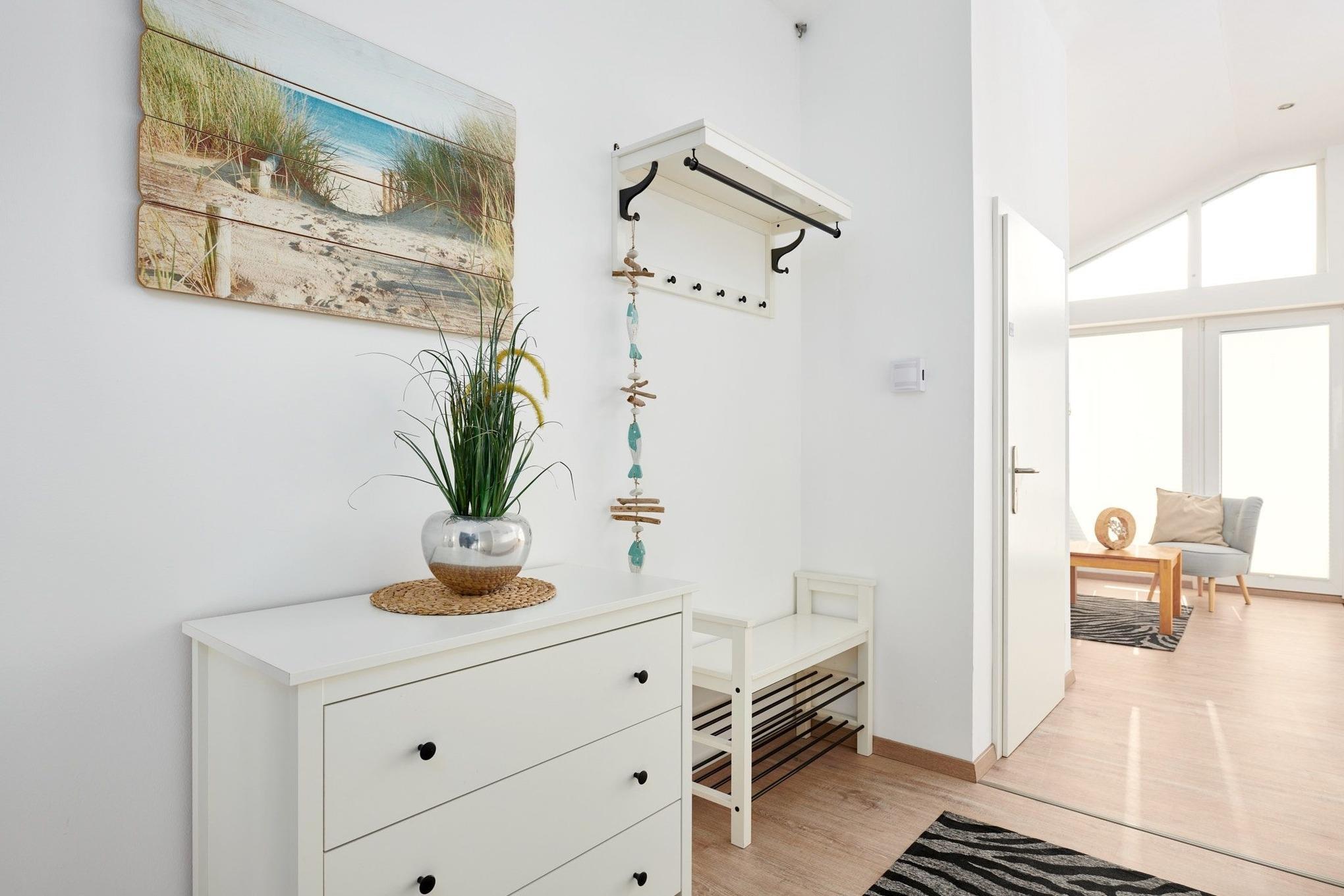 Ein eigener Treppen-Zugang führt in das hell und freundliche Feriendomizil. Das großzügig Wohnzimmer ist geschmackvoll und nordisch-modern eingerichtet. Relaxed wird auf der Couch, die sich nachts in ein Schlafsofa (160cm breit) verwandelt. Ein Flat-TV mit Sat-Anschluss sorgt genauso für Unterhaltung wie die Stereoanlage mit CD-Player sowie der DVD-Player. Die offene Küche mit Koch- bzw. Küchentresen ist gut ausgestattet. Für Kochspaß sorgen ein 6-Platten-Ceranherd, der Backofen und eine Mikrowelle sowie ein großer Kühlschrank mit Gefrierfach. Ein Esstisch zwischen Küche und Terrasse lädt am Morgen zum ersten Kaffee ein und entspannt abends nach traumhaften Ausflügen an der Ostsee. Das Schlafzimmer ist ausgestattet mit einem Doppelbett, einem großzügigen Kleiderschrank für Ihre Urlaubsgarderobe und einem weiteren Flat-TV. Das Badezimmer ist frisch und modern eingerichtet und punktet mit einer großen Rainshower-Dusche.