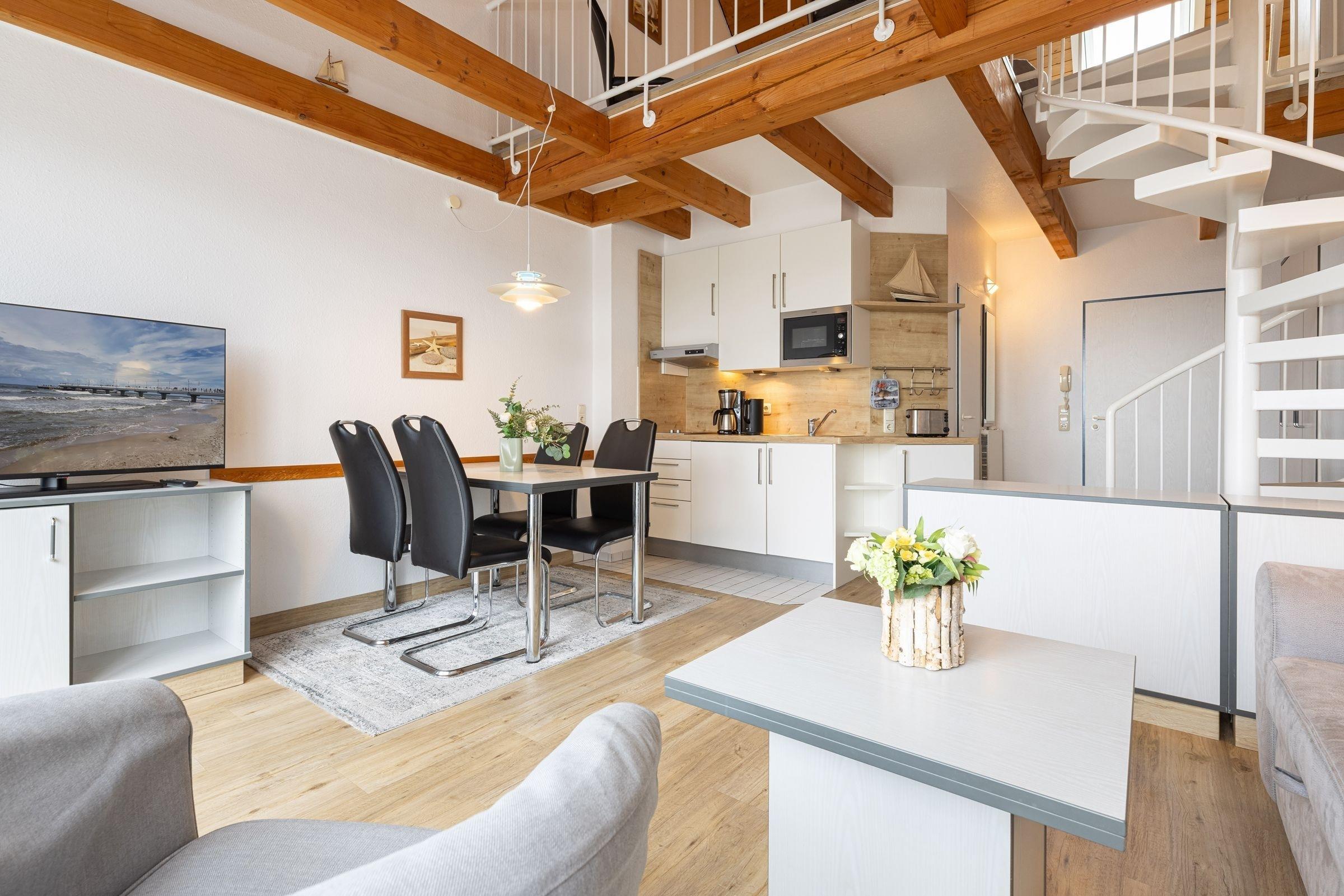 Dieses Galerie-Appartement verfügt über ein großzügiges Wohn-und Esszimmer mit Küchenecke sowie ein Badezimmer mit Dusche und WC. Das Doppelbett befindet sich oben auf der zweiten Ebene (über eine Treppe erreichbar).