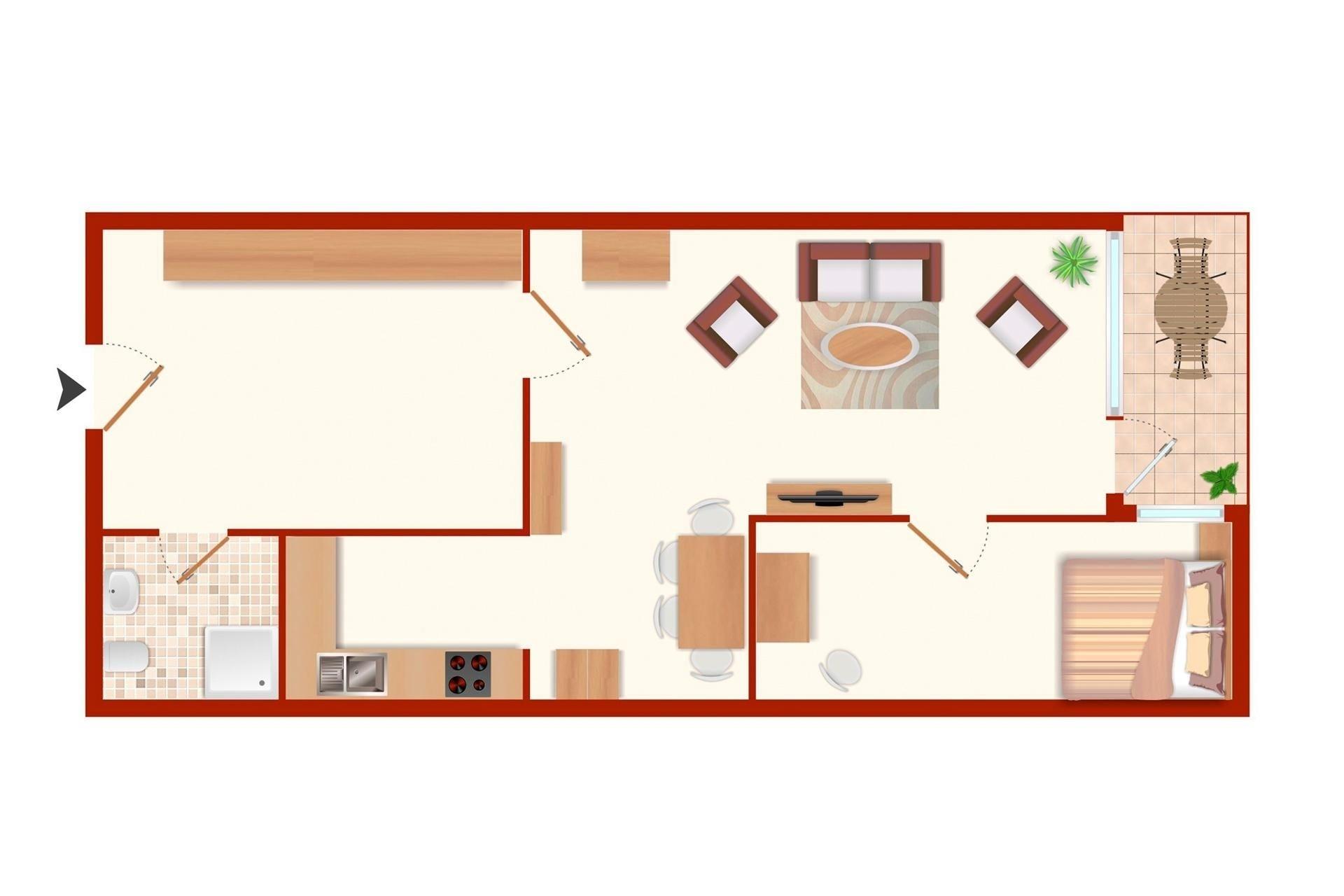 Das Appartement ist aufgeteilt in einen kombinierten Wohn- Essbereich, ein Schlafzimmer, eine separate Küche und ein Duschbad. Das Schlafzimmer verfügt über ein Doppelbett (160x200 cm). Im Wohnzimmer befindet sich ein gemütliches Sofa. Ein CD-Player mit USB-Anschluss und ein großer Flachbildfernseher sorgen am Abend für gemütliche Stunden. Die Küche ist mit allen nötigen Geräten ausgestattet. Für unsere Angler halten wir einen Gefrierschrank mit separaten Fächern im Haus bereit.