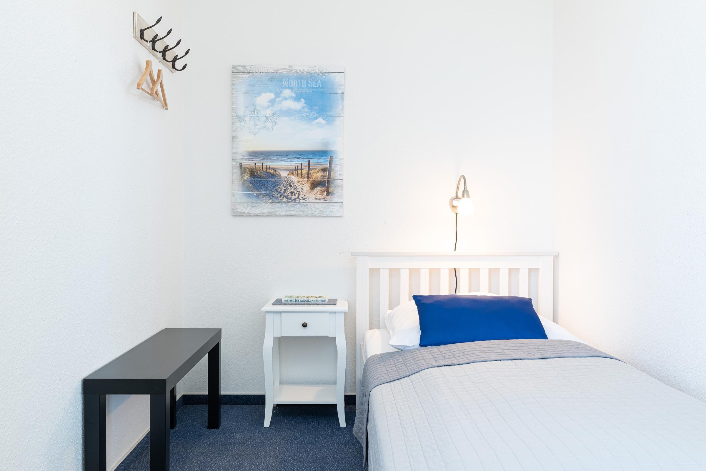 Schlafzimmer: 2 Einzelbetten (90x200 cm), Verdunkelung: Vorhänge, kein Platz für Babybett vorhanden
