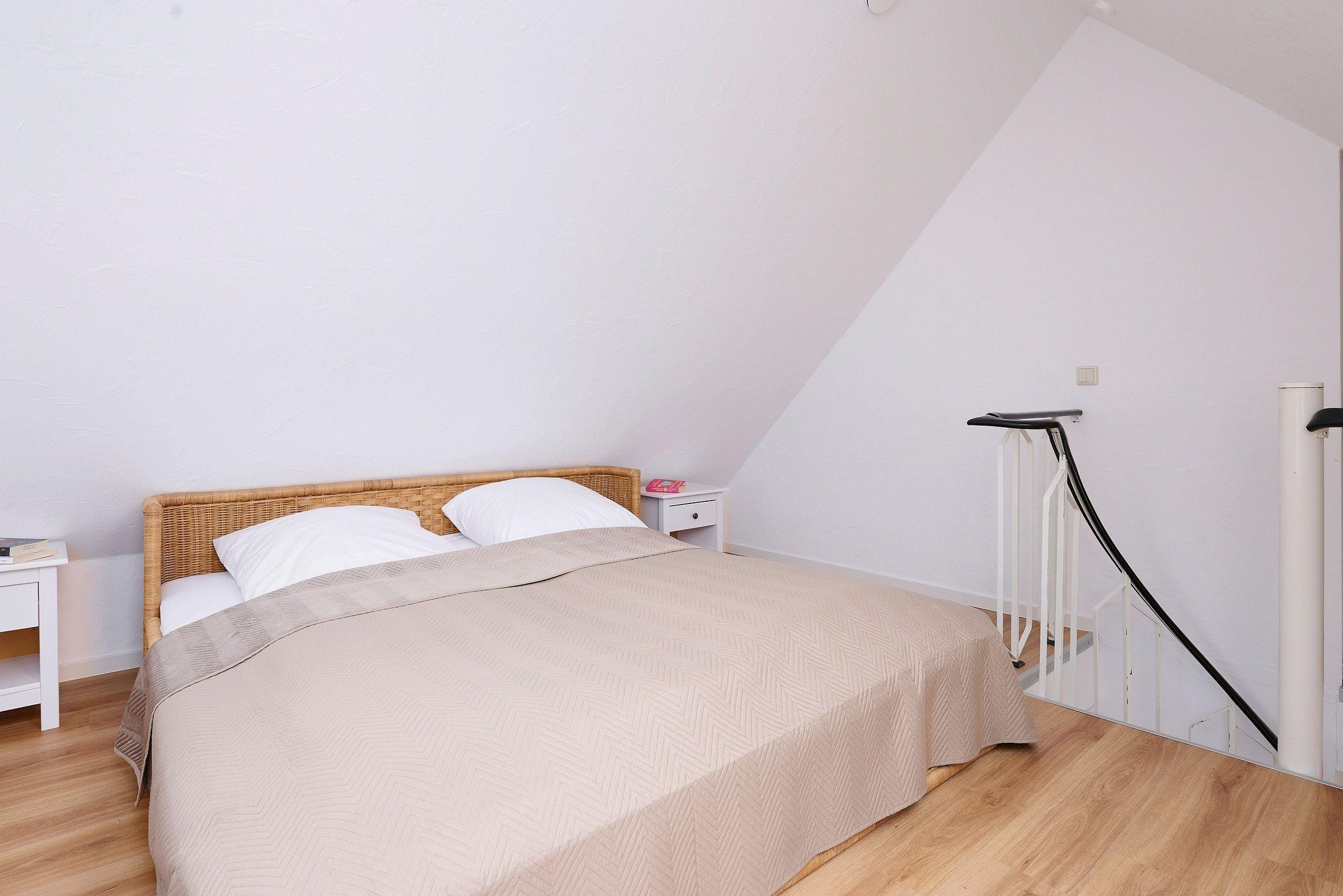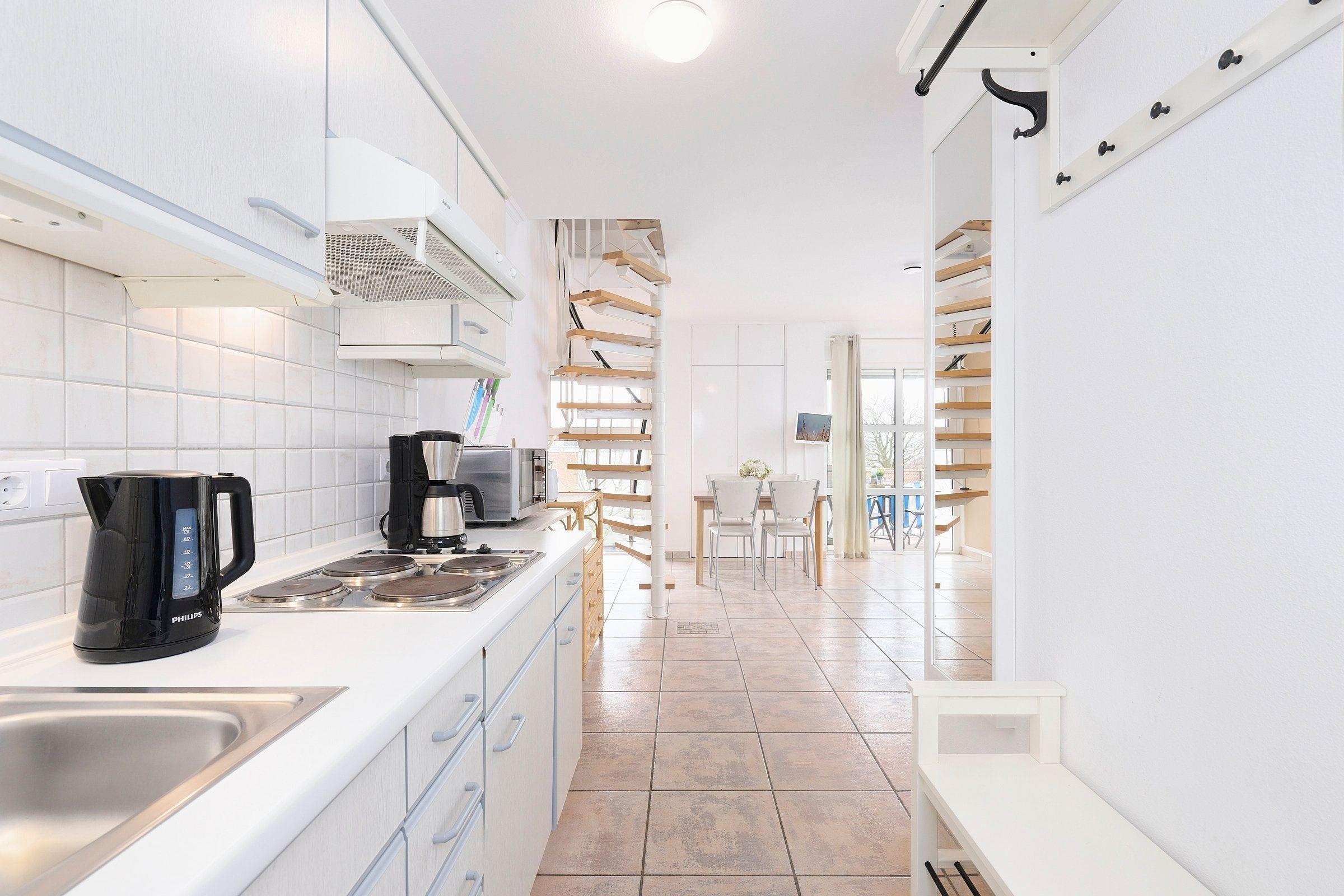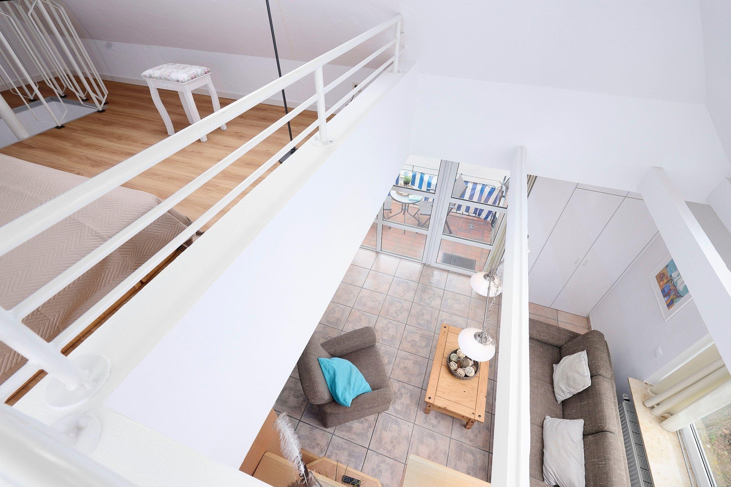 Die Wohnung verfügt über einen langen Flur mit Garderobe, Schuhbank und Spiegel, einen offenen Wohn-Essbereich mit Küchenzeile, 3er Sofa und Sessel und Flachbild-TV, ein separates Schlafzimmer mit Doppelbett und Kleiderschrank sowie einen offenen Schlafbereich mit Doppelbett aus Korbgeflecht in der oberen Etage, den Sie über eine Wendeltreppe erreichen. Die dortigen Oberlichter können nicht verdunkelt werden. Auf den möblierten Dachbalkon mit herrlichem Hafenblick gelangen Sie vom Wohnzimmer aus.