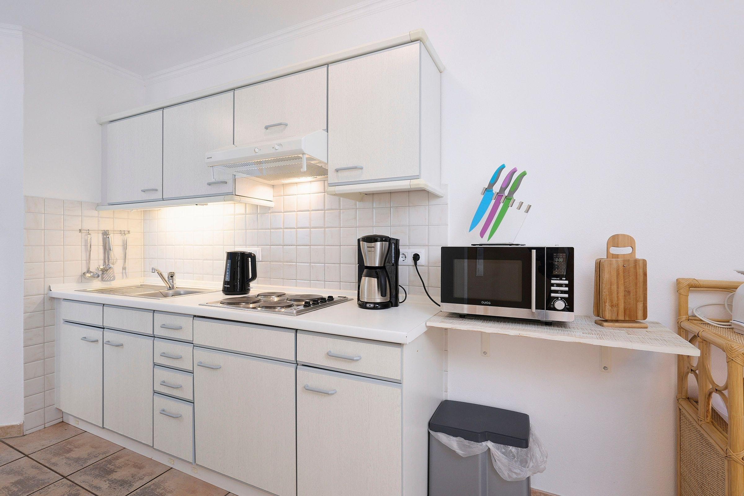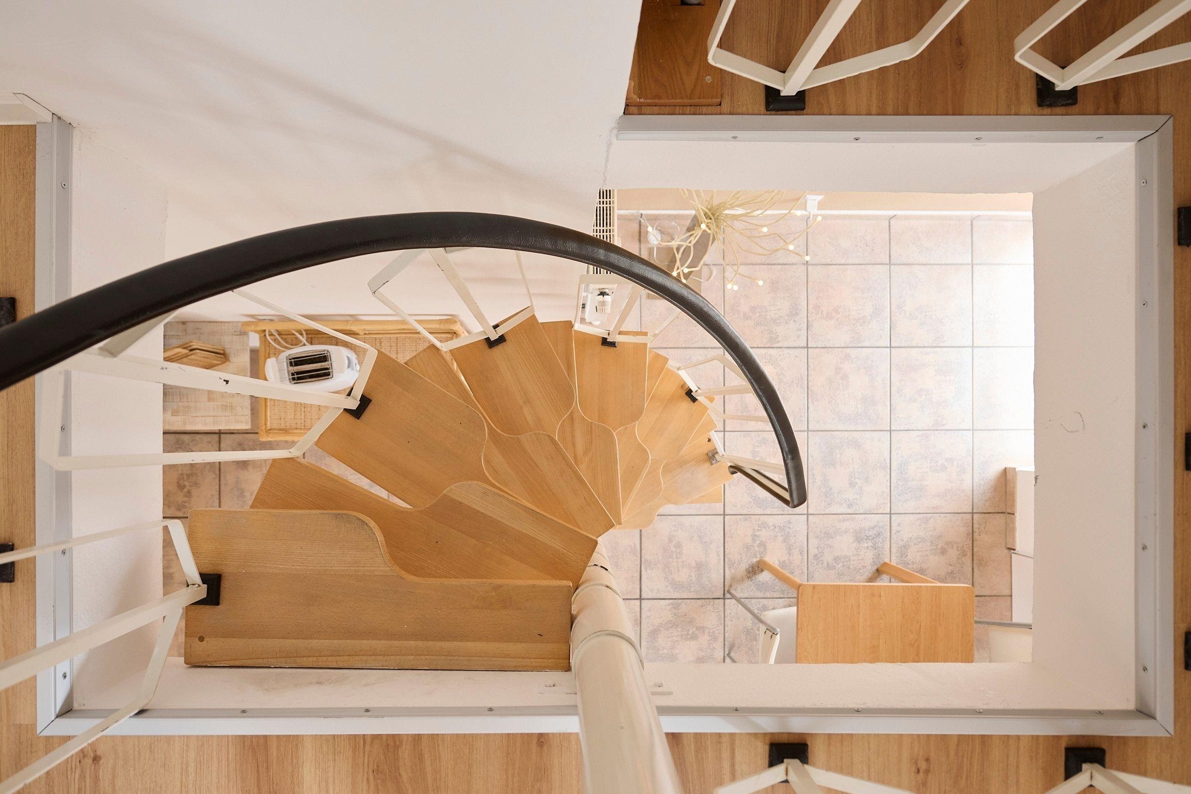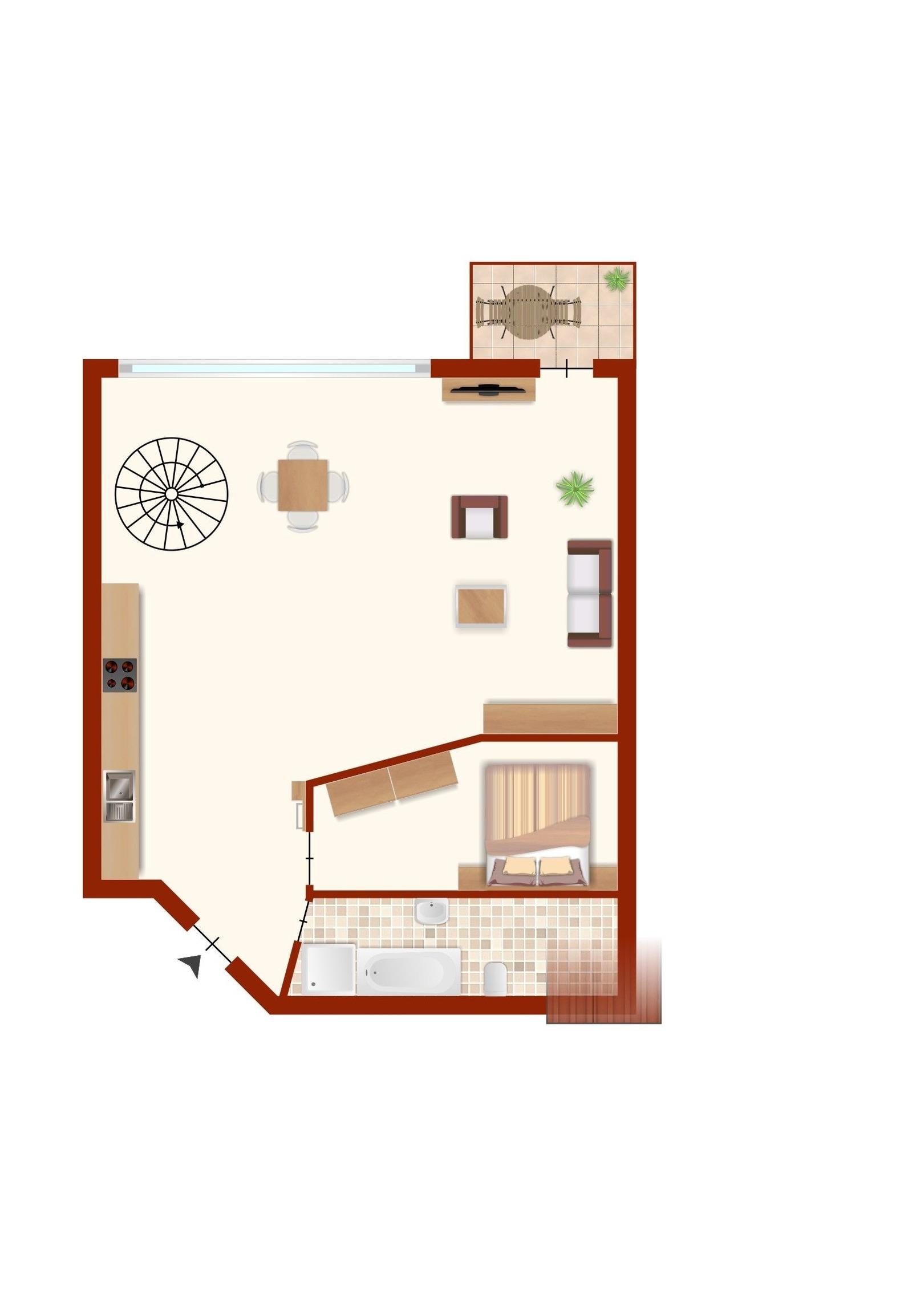 Die Wohnung verfügt über einen langen Flur mit Garderobe, Schuhbank und Spiegel, einen offenen Wohn-Essbereich mit Küchenzeile, 3er Sofa und Sessel und Flachbild-TV, ein separates Schlafzimmer mit Doppelbett und Kleiderschrank sowie einen offenen Schlafbereich mit Doppelbett aus Korbgeflecht in der oberen Etage, den Sie über eine Wendeltreppe erreichen. Die dortigen Oberlichter können nicht verdunkelt werden. Auf den möblierten Dachbalkon mit herrlichem Hafenblick gelangen Sie vom Wohnzimmer aus.