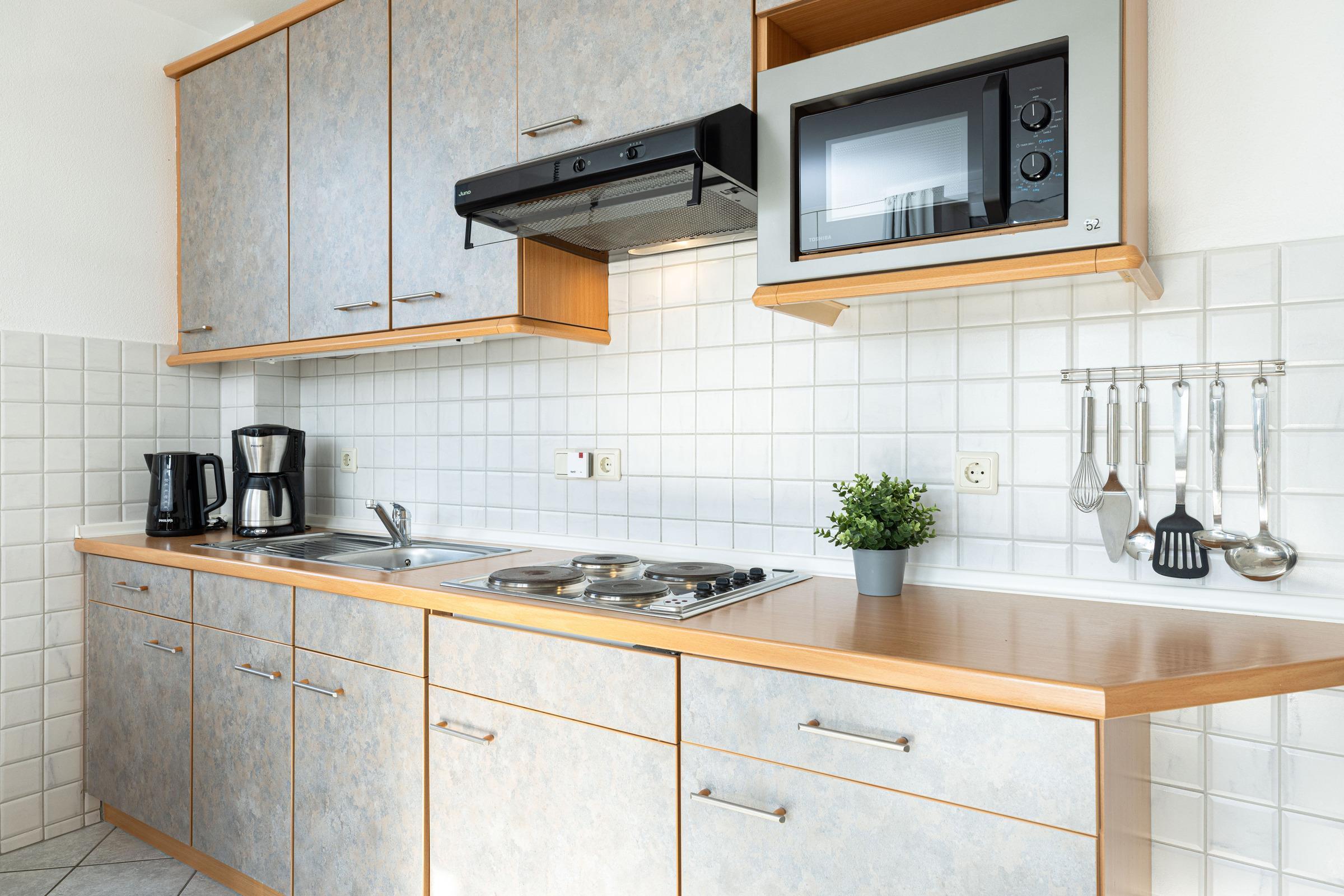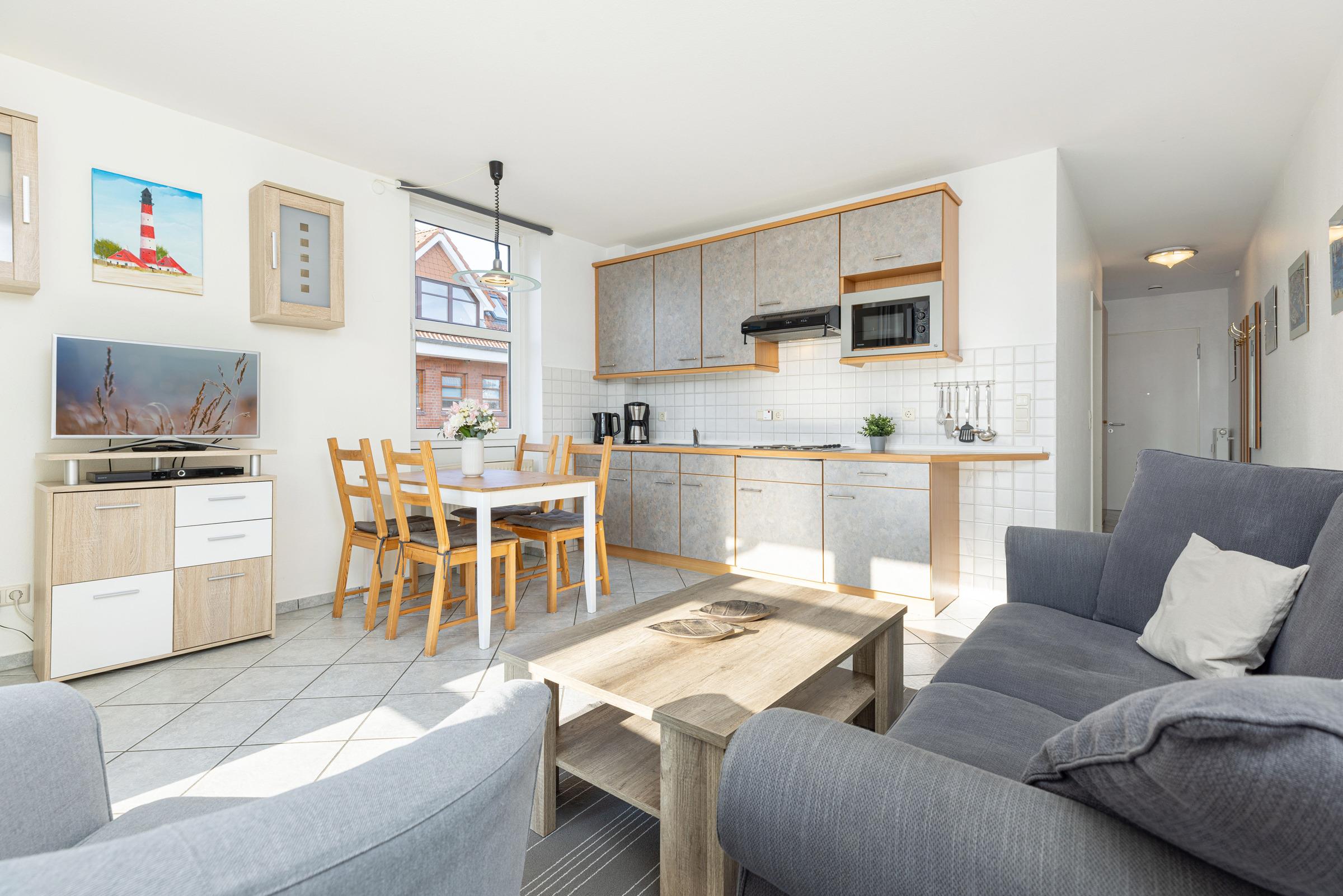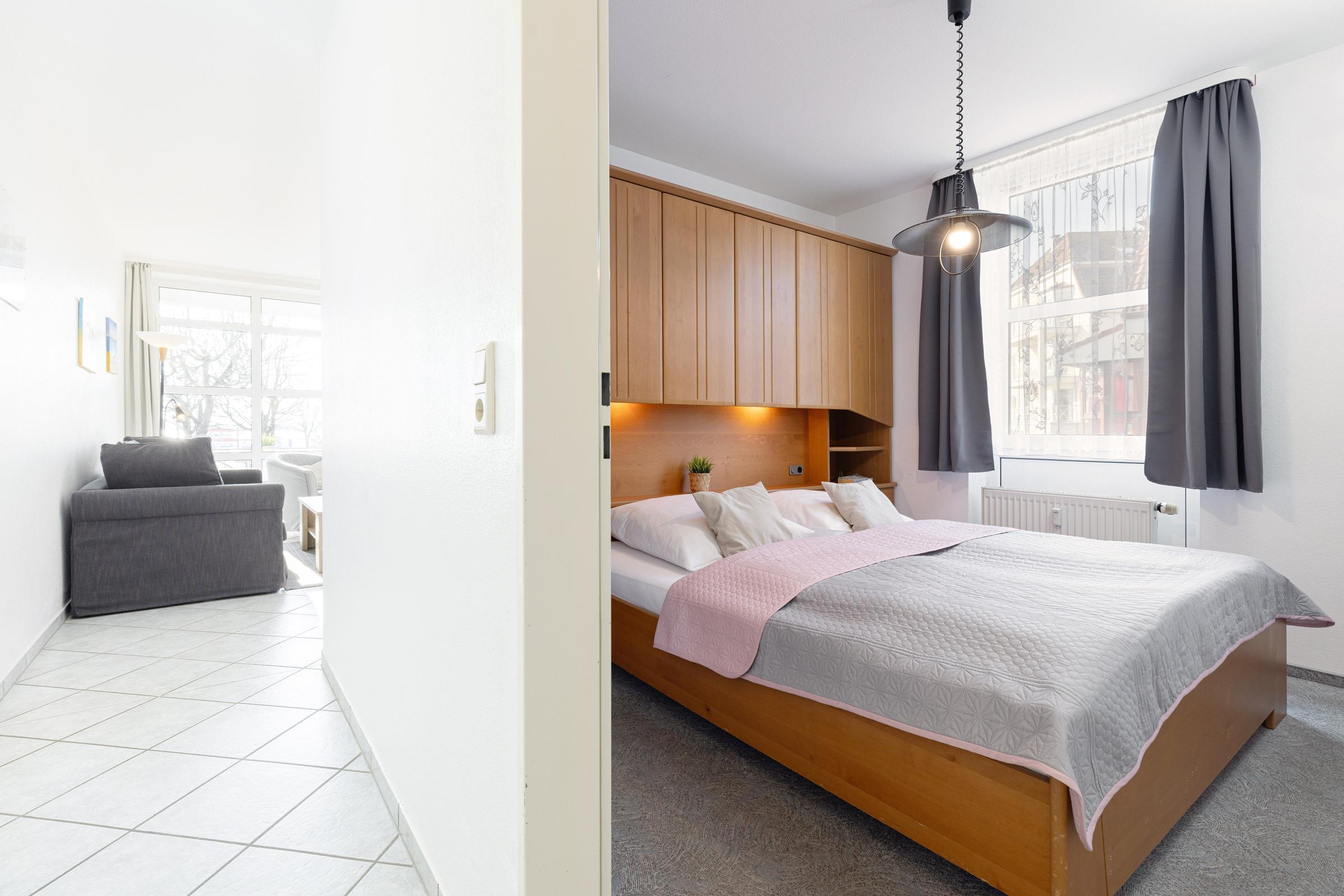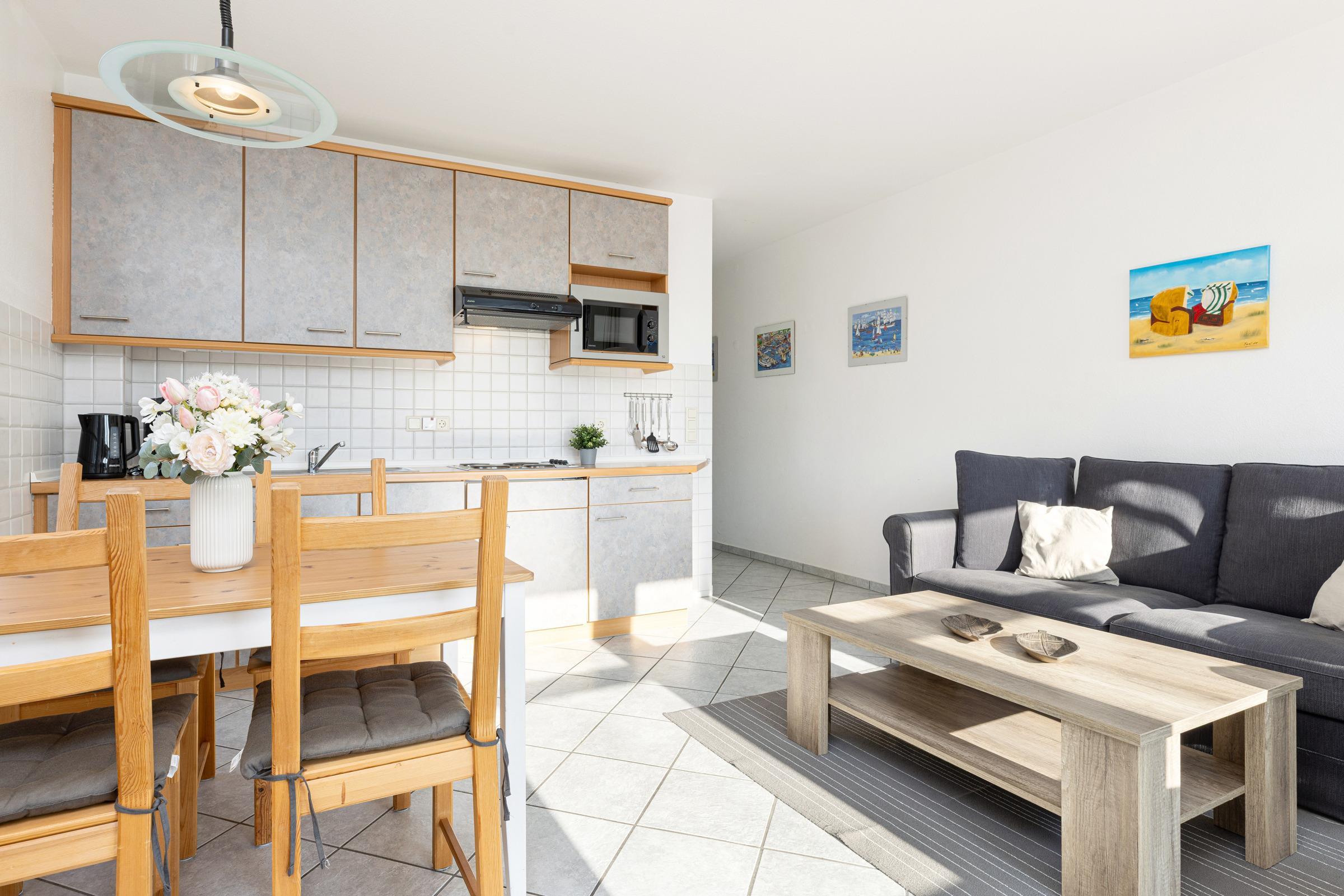 Ein separates Schlafzimmer mit Doppelbett (180x200 cm) und ausreichend Ablagemöglichkeiten stehen neben einem großzügigen Badezimmer mit Dusche/WC und einem kombinierten Wohn-Schlafraum mit Schlafcouch (140x200 cm) mit Küchenzeile zur Verfügung. Der morgendliche Kaffee oder das Frühstück kann entspannt auf dem Balkon mit Blickrichtung Hafen genossen werden. Ein Sonnenschirm spendet wohligen Schatten.