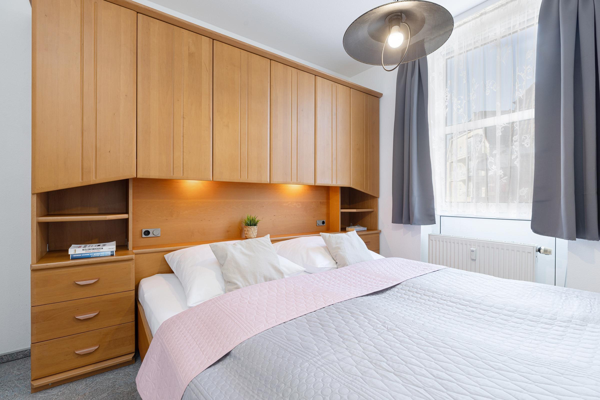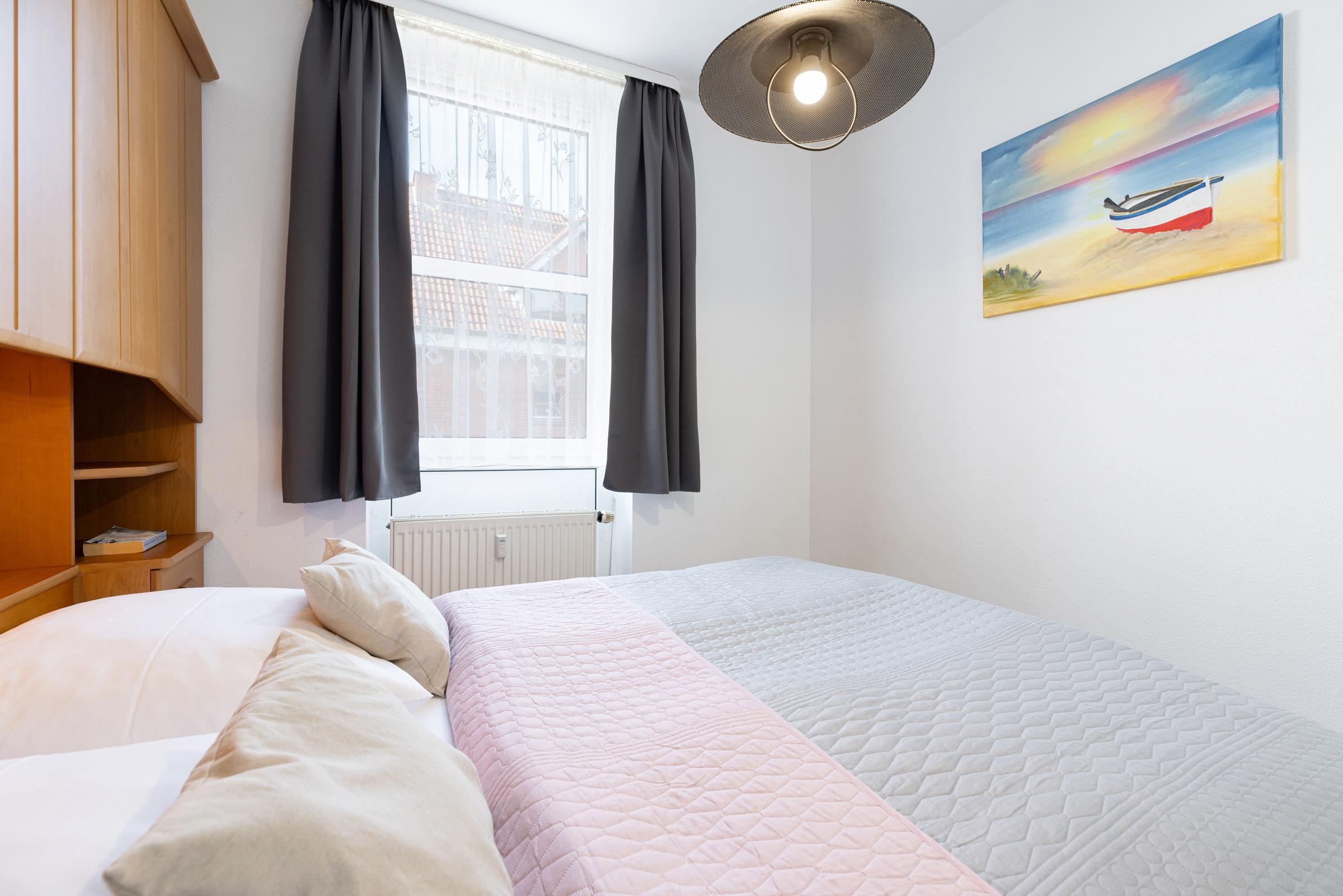 Schlafzimmer: Doppelbett (2x 90x200cm), Kleiderschrank, Rollo, Verdunkelung: Vorhänge