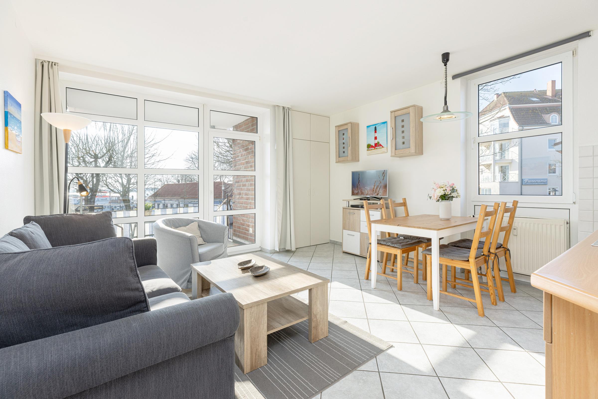 Die ca. 40 m² große 2-Zimmer-Ferienwohnung befindet sich im 1. OG der Appartementhausanlage Hafen-Residenz am alten Laboer Hafen mit seitlichem Förde-/ Hafenblick und bietet Platz für bis zu 4 Personen.