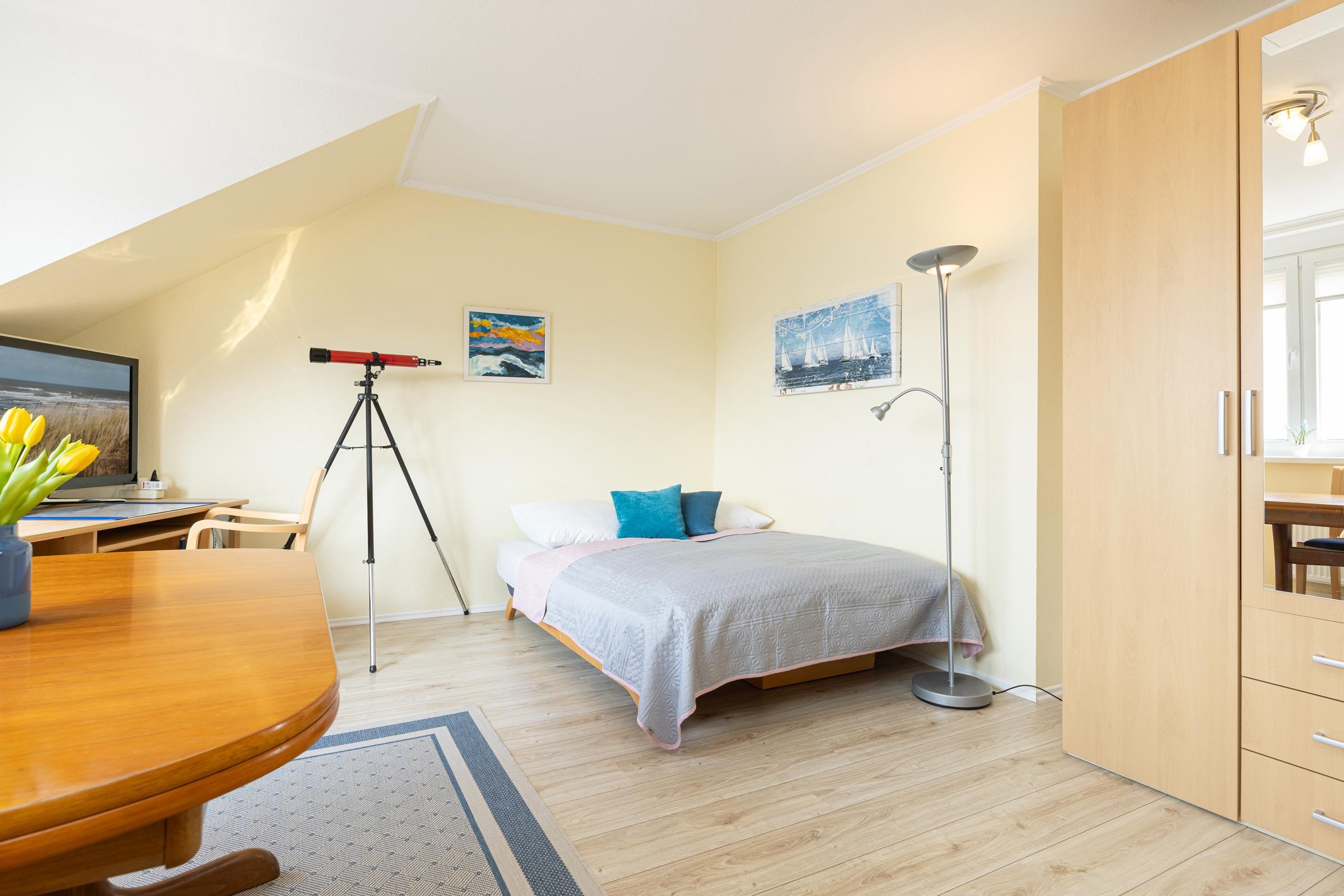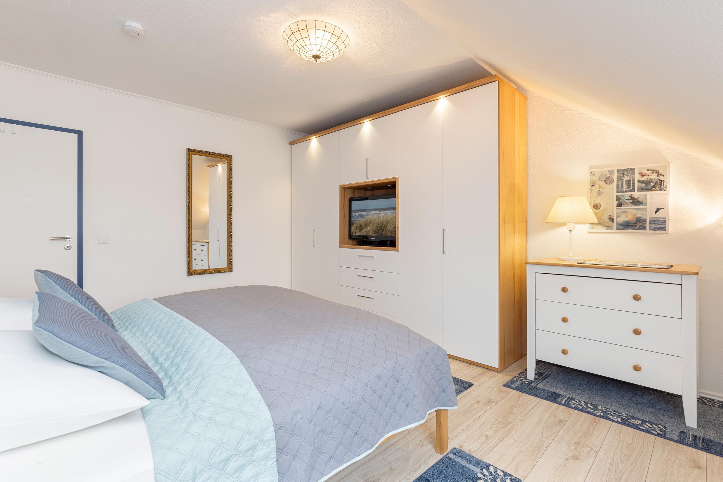 Schlafzimmer 1: Doppelbett (2x 90x200 cm), Kleiderschrank, TV, Verdunkelung: elektrische Außenrollläden