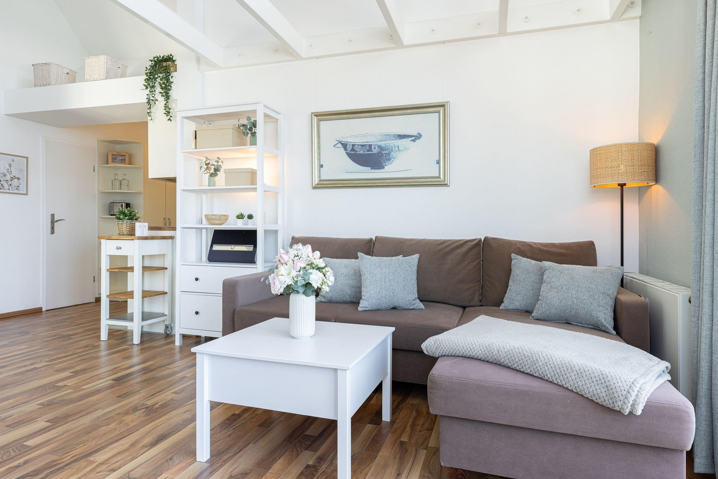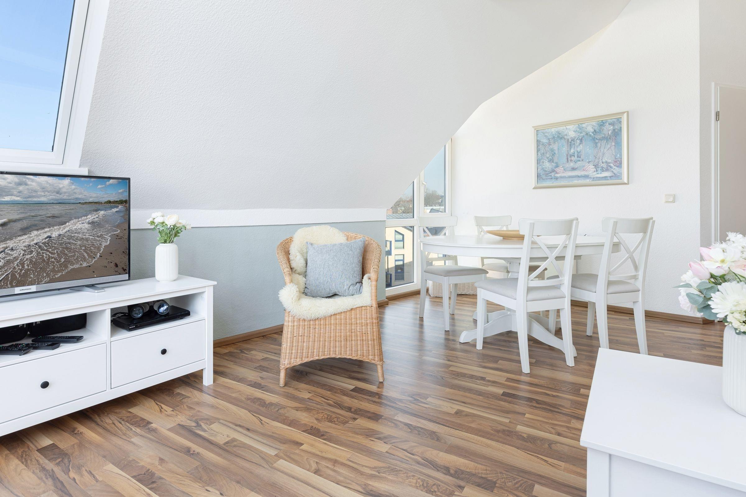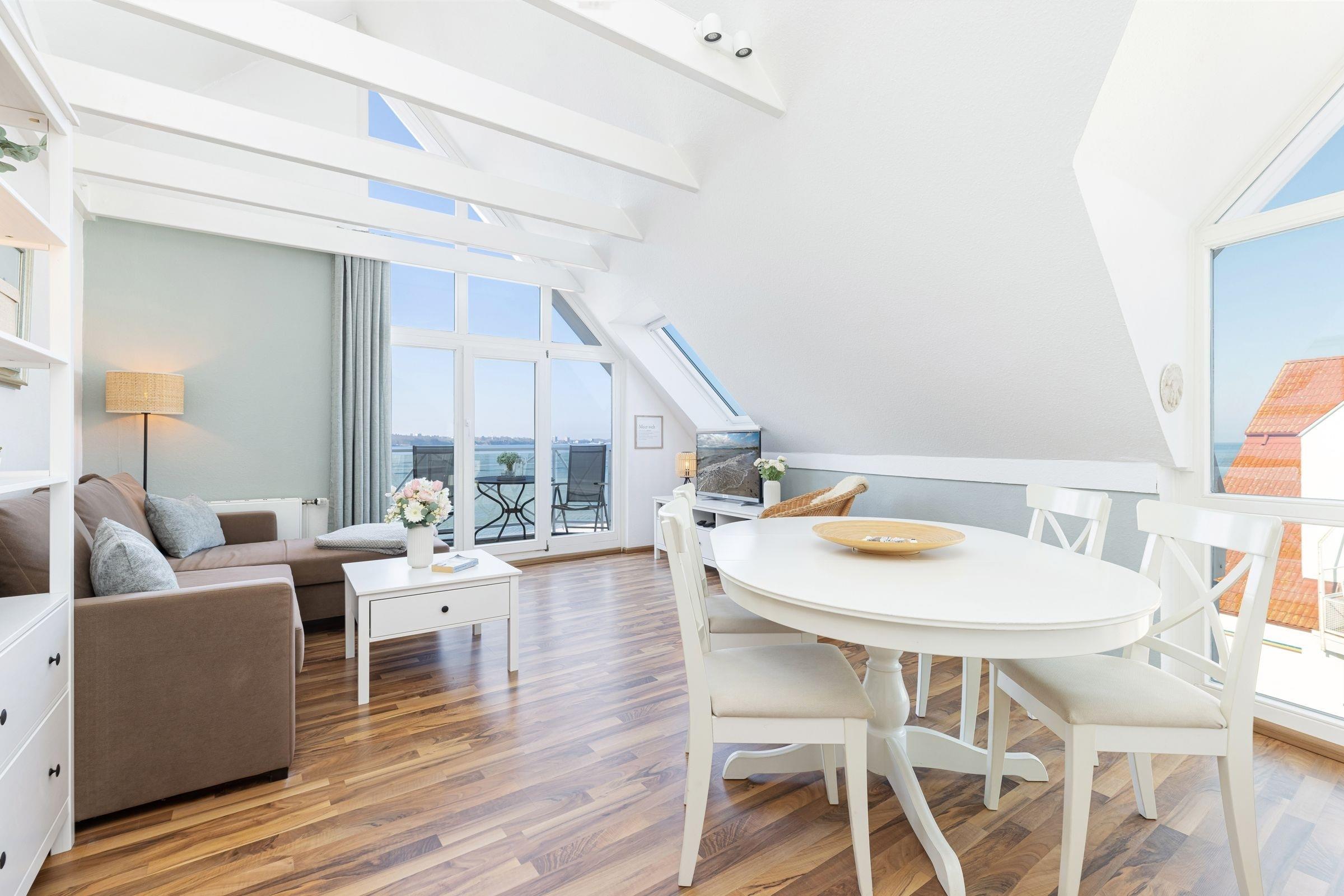 Im offenen Wohn- und Essbereich, welcher sich an die Küchenzeile anschließt, befindet sich ein Esstisch mit vier Stühlen, ein modernes Eck-Sofa, ein Flachbild-Fernseher, ein DVD- sowie ein CD-Radio-Player. Vom Wohnzimmer aus gelangen Sie auf den möblierten Balkon mit einzigartigem Strand- und Fördeblick. Von hier aus lassen der Trubel auf der Strandpromenade und am Strand sowie der Schiffsverkehr betrachten. Abends können Sie die wunderschönen Sonnenuntergänge genießen. An den Wohn- und Essbereich grenzt ein Schlafzimmer mit einem Doppelbett (160x200 cm) an. Das danebenliegende geräumige Badezimmer ist mit einem großen Waschtisch nebst Panoramaspiegel, einer Duschkabine und einem WC ausgestattet und bietet zahlreiche Ablagemöglichkeiten. Über die Wendeltreppe gelangen Sie in die obere Etage, in der sich ein weiteres Schlafzimmer befindet. Dieses verfügt ebenfalls über ein Doppelbett (160x200 cm), einen Kleiderschrank, eine Kommode sowie einen weiteren Flachbild-Fernseher. Zudem ist dort ein Einzel-Hochbett für Kinder installiert, welches diese über eine kleine Leiter erreichen.