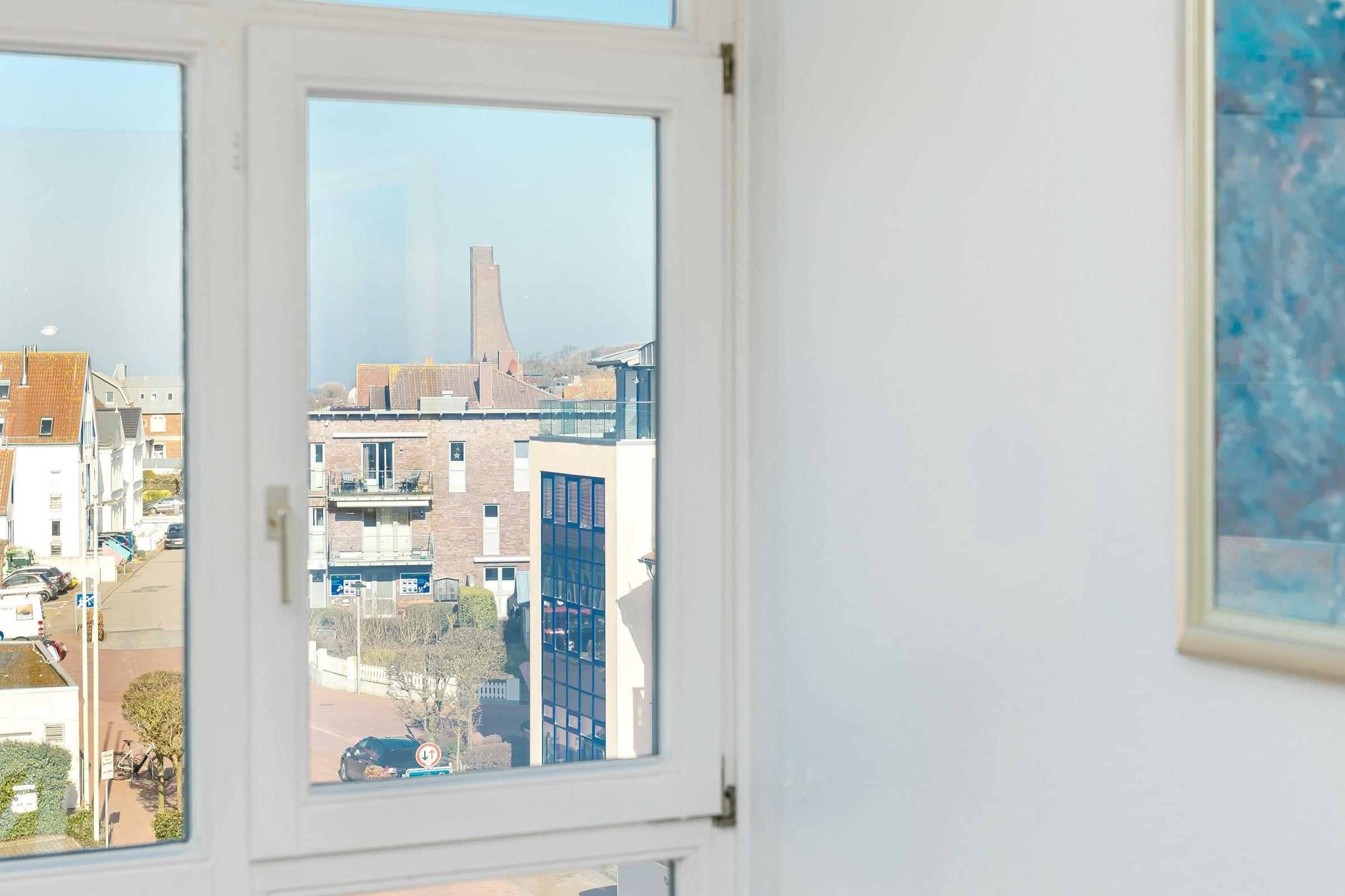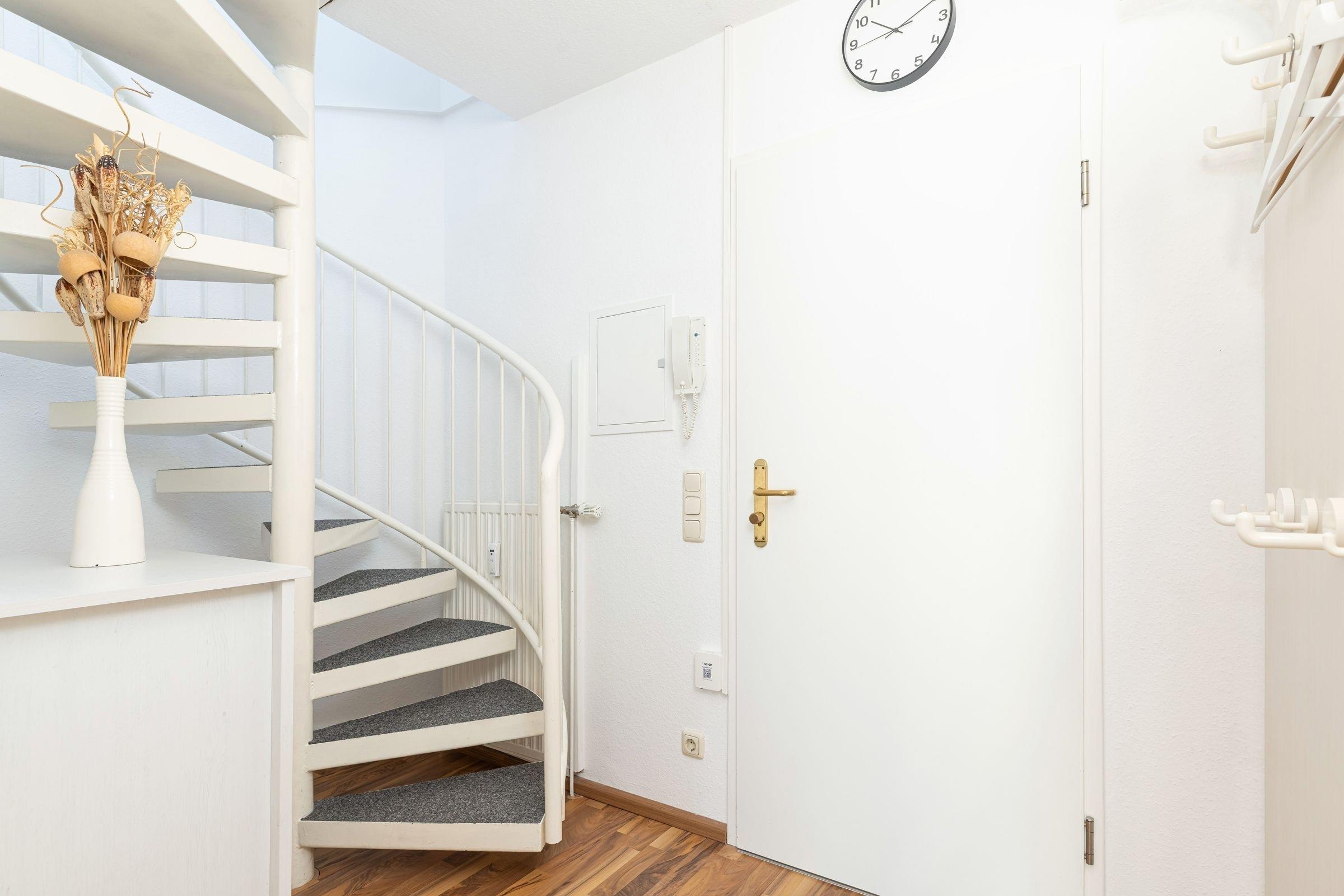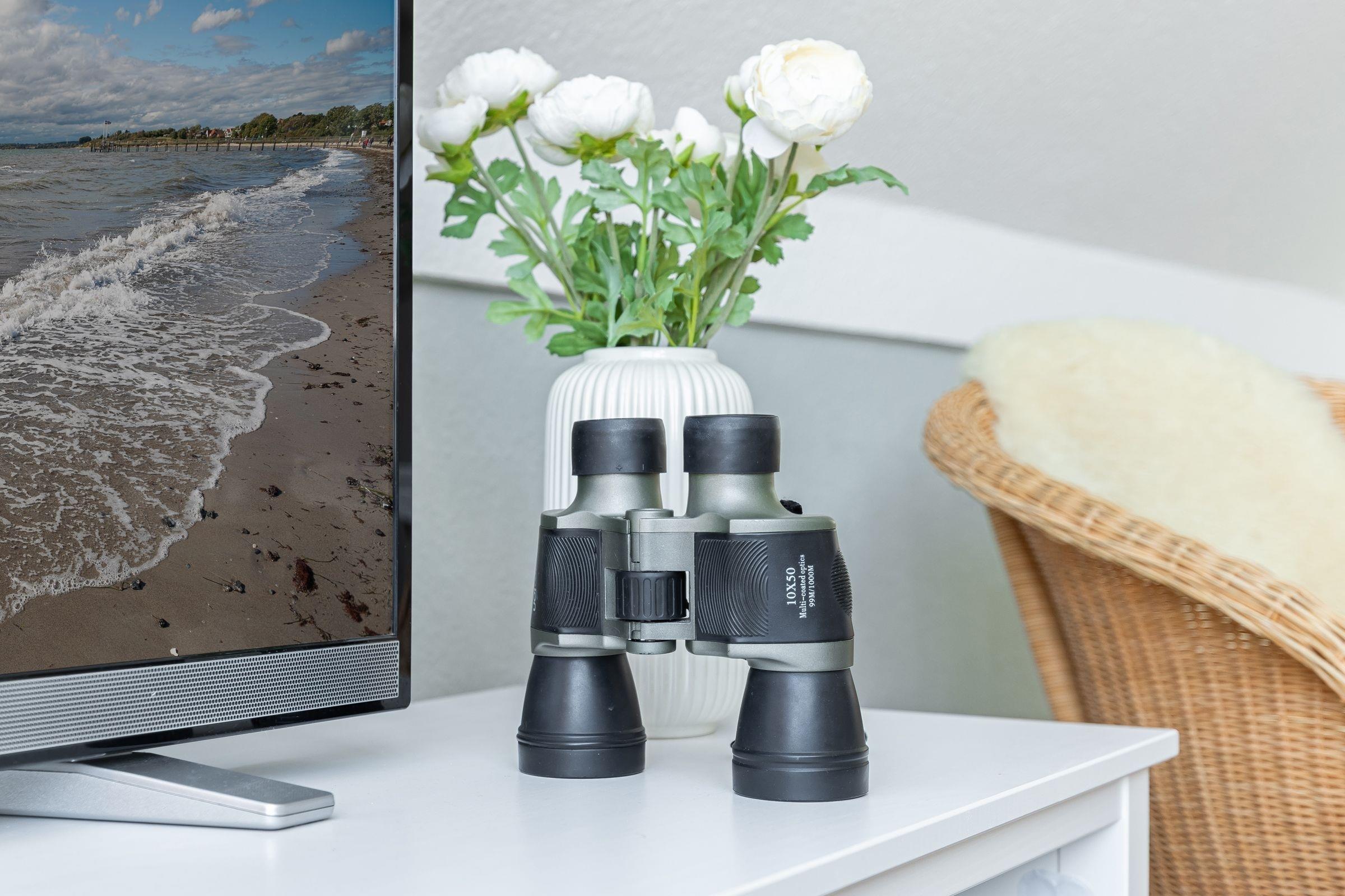 Im offenen Wohn- und Essbereich, welcher sich an die Küchenzeile anschließt, befindet sich ein Esstisch mit vier Stühlen, ein modernes Eck-Sofa, ein Flachbild-Fernseher, ein DVD- sowie ein CD-Radio-Player. Vom Wohnzimmer aus gelangen Sie auf den möblierten Balkon mit einzigartigem Strand- und Fördeblick. Von hier aus lassen der Trubel auf der Strandpromenade und am Strand sowie der Schiffsverkehr betrachten. Abends können Sie die wunderschönen Sonnenuntergänge genießen. An den Wohn- und Essbereich grenzt ein Schlafzimmer mit einem Doppelbett (160x200 cm) an. Das danebenliegende geräumige Badezimmer ist mit einem großen Waschtisch nebst Panoramaspiegel, einer Duschkabine und einem WC ausgestattet und bietet zahlreiche Ablagemöglichkeiten. Über die Wendeltreppe gelangen Sie in die obere Etage, in der sich ein weiteres Schlafzimmer befindet. Dieses verfügt ebenfalls über ein Doppelbett (160x200 cm), einen Kleiderschrank, eine Kommode sowie einen weiteren Flachbild-Fernseher. Zudem ist dort ein Einzel-Hochbett für Kinder installiert, welches diese über eine kleine Leiter erreichen.